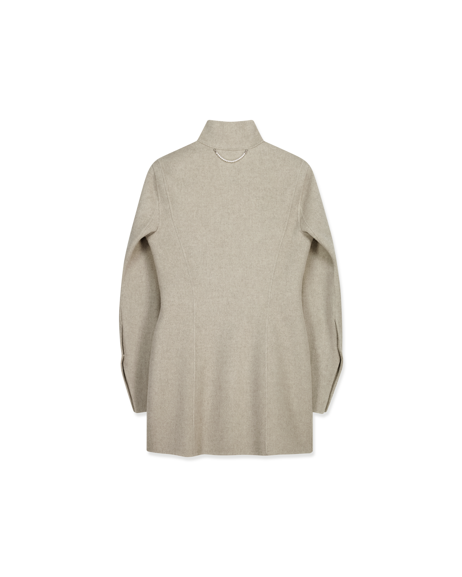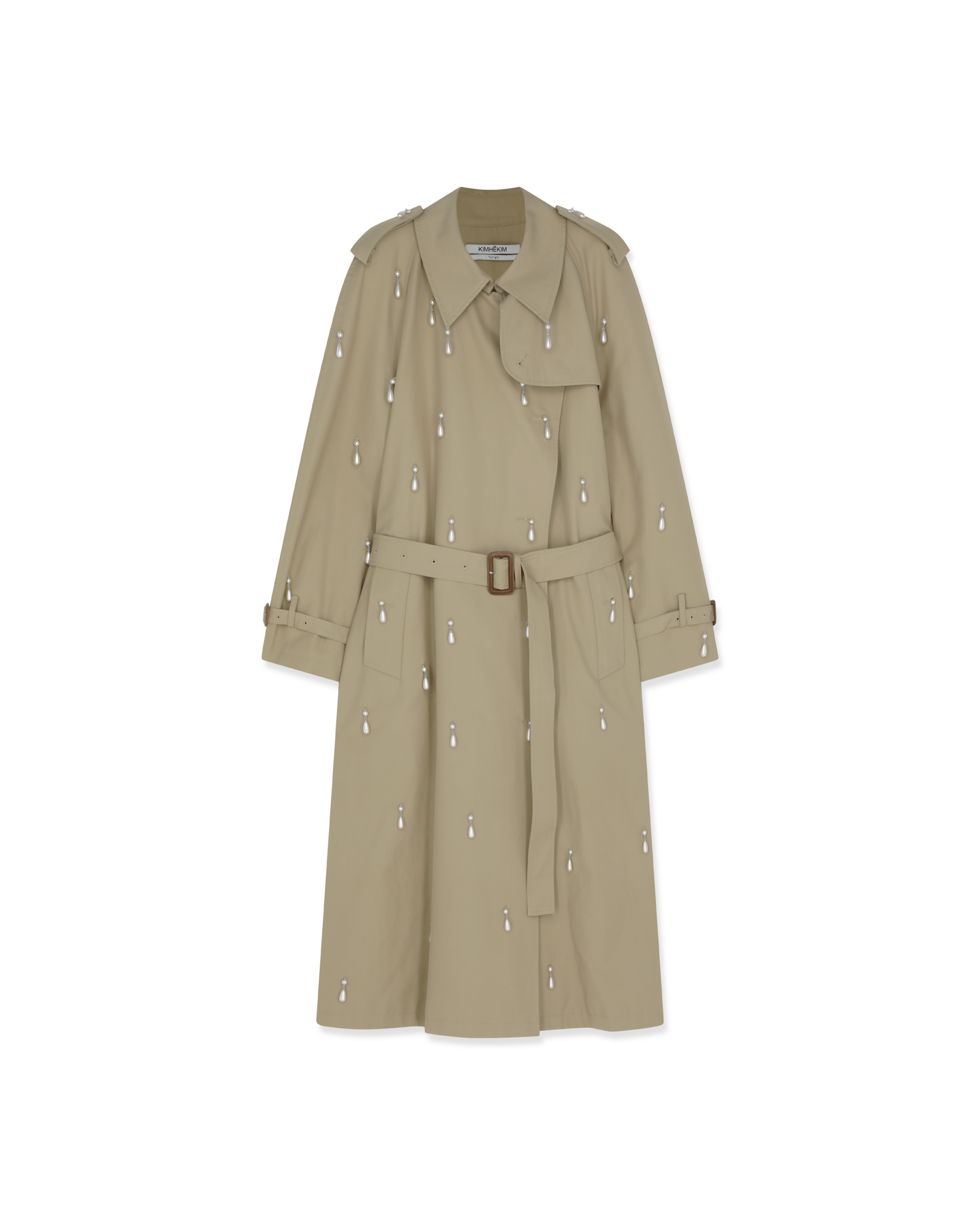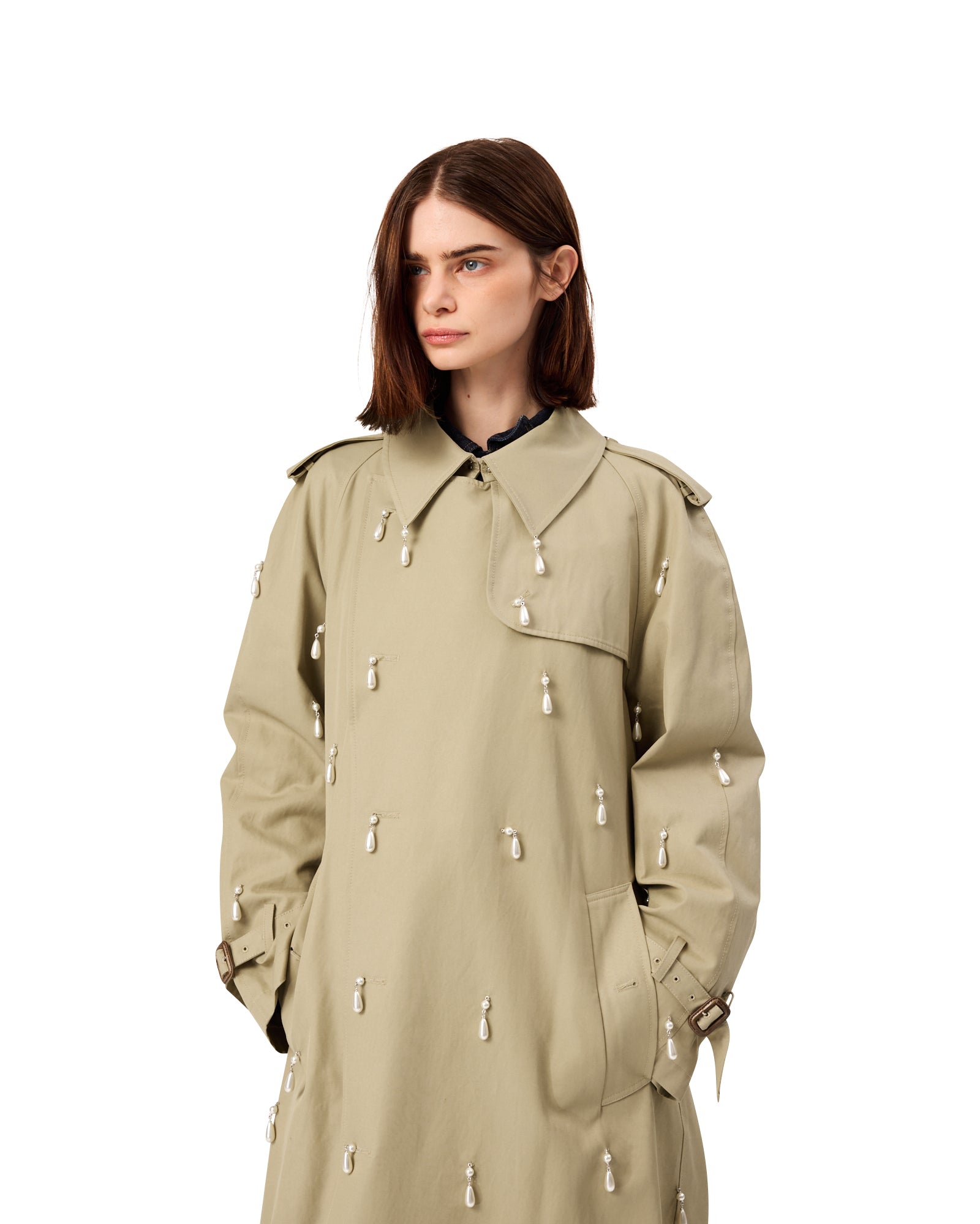 Pearl Drop Embellished Cotton-Rayon Belted Trench (Beige)