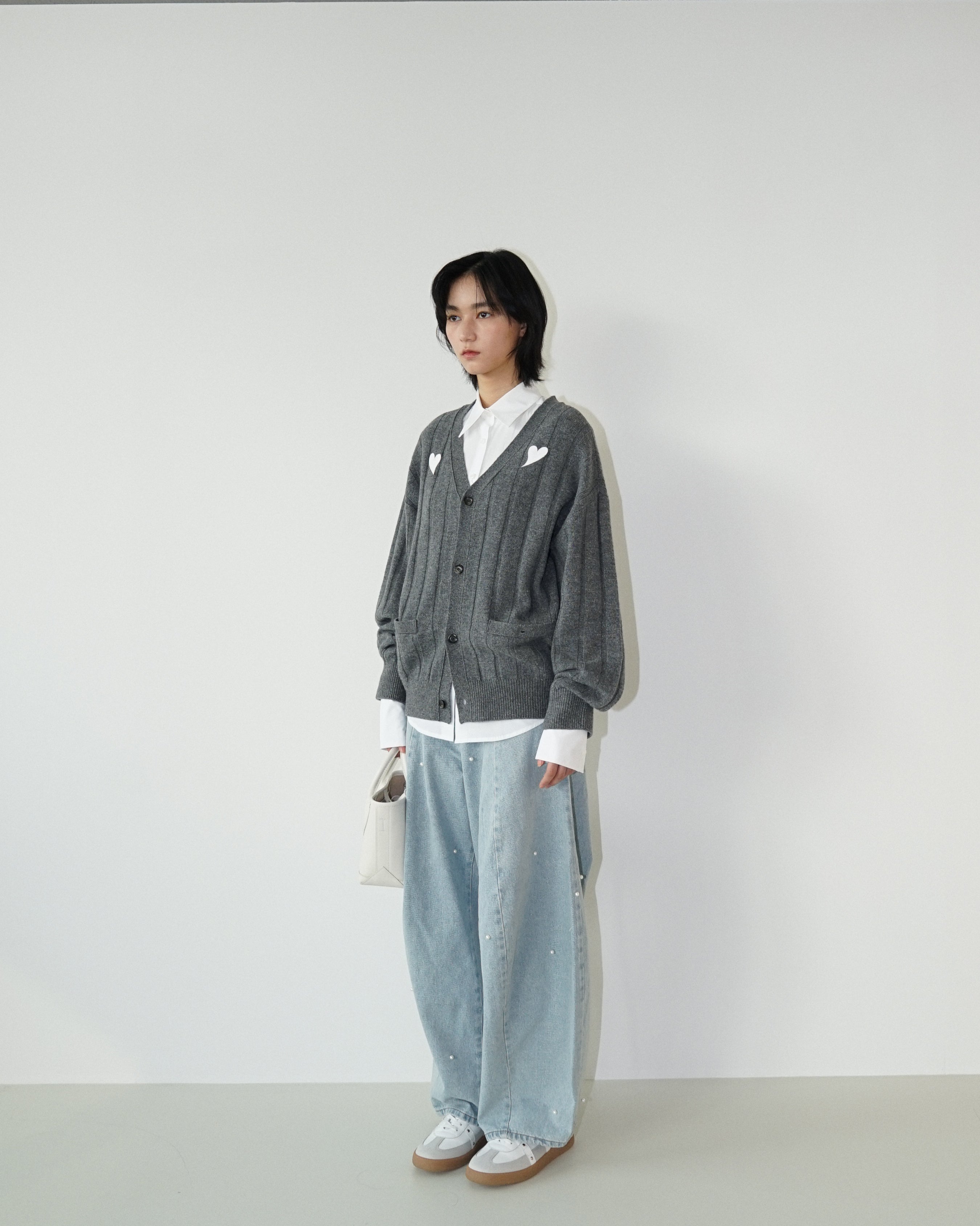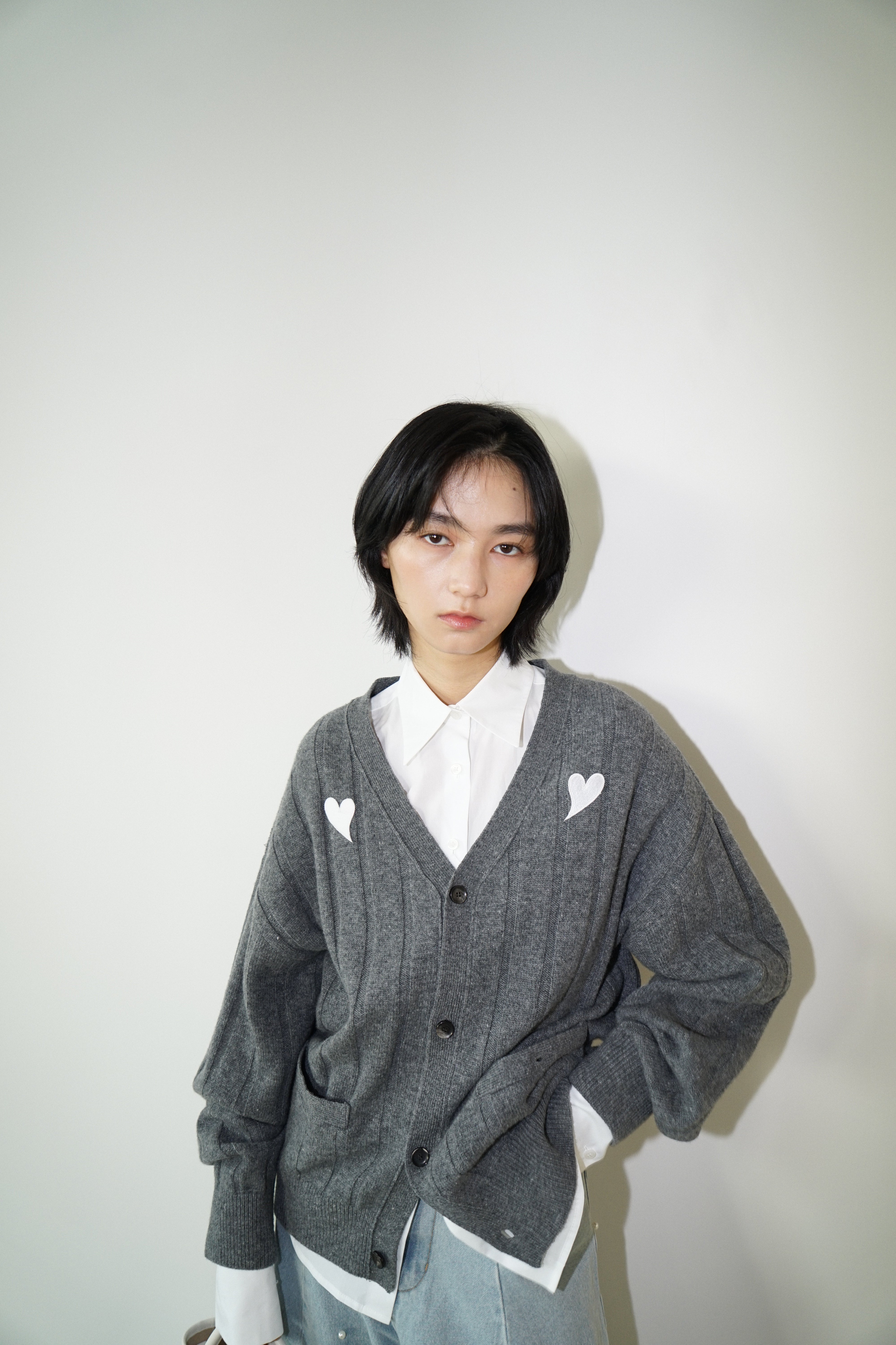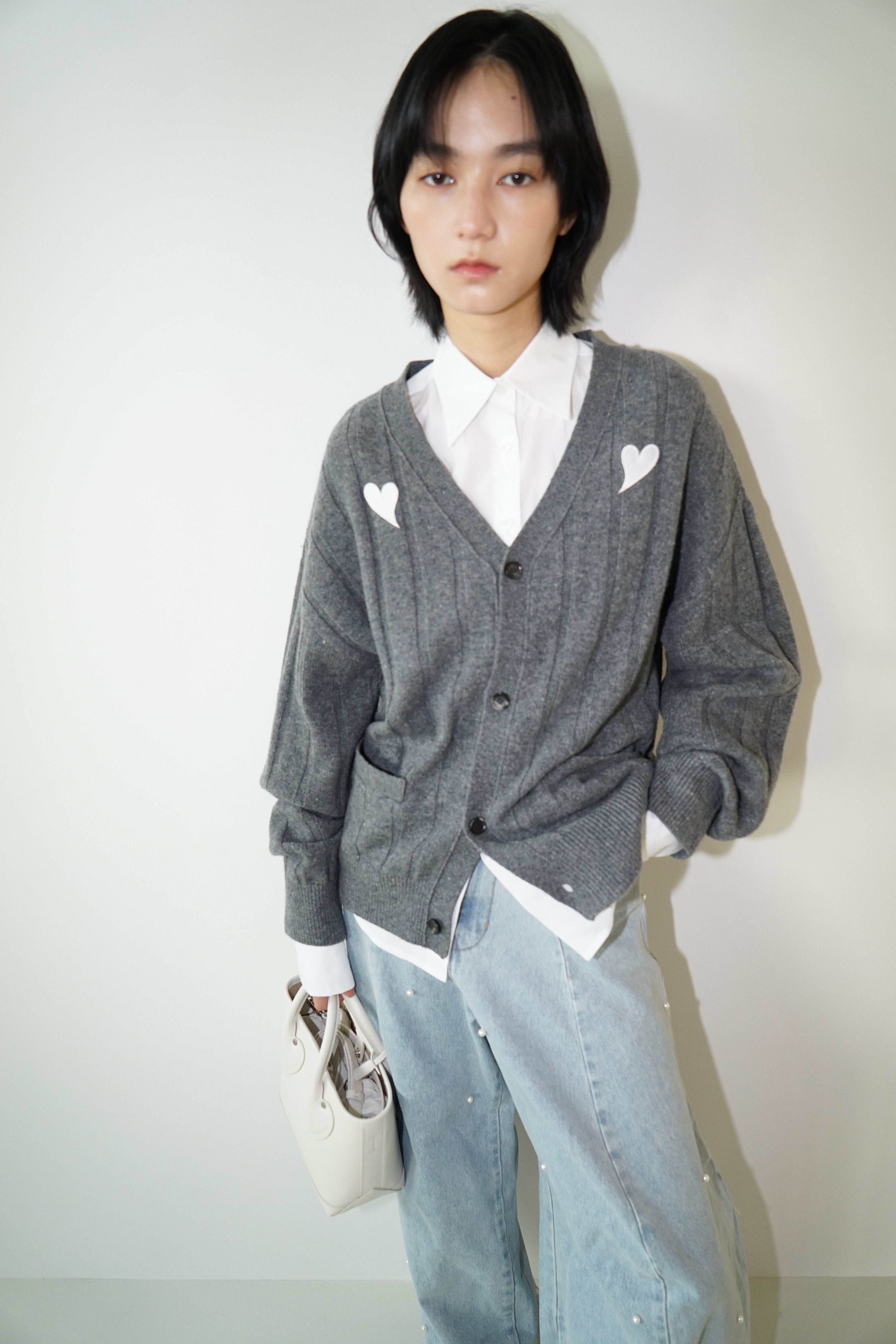 Heart Patch V-Neck Cardigan (Melange Dark Grey)