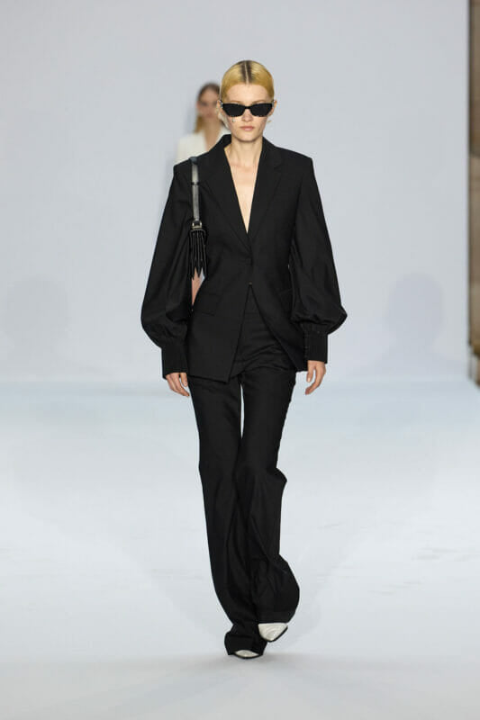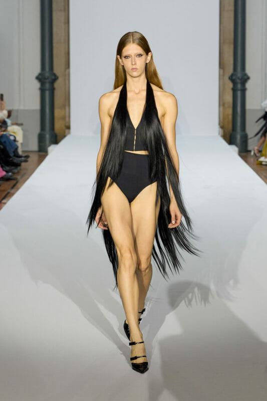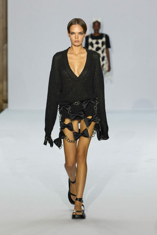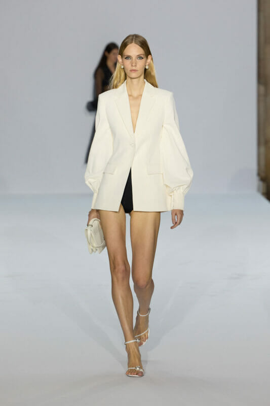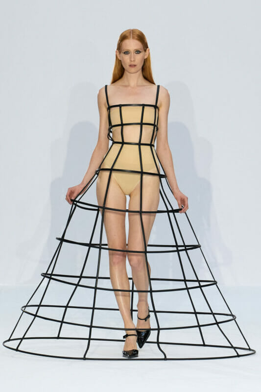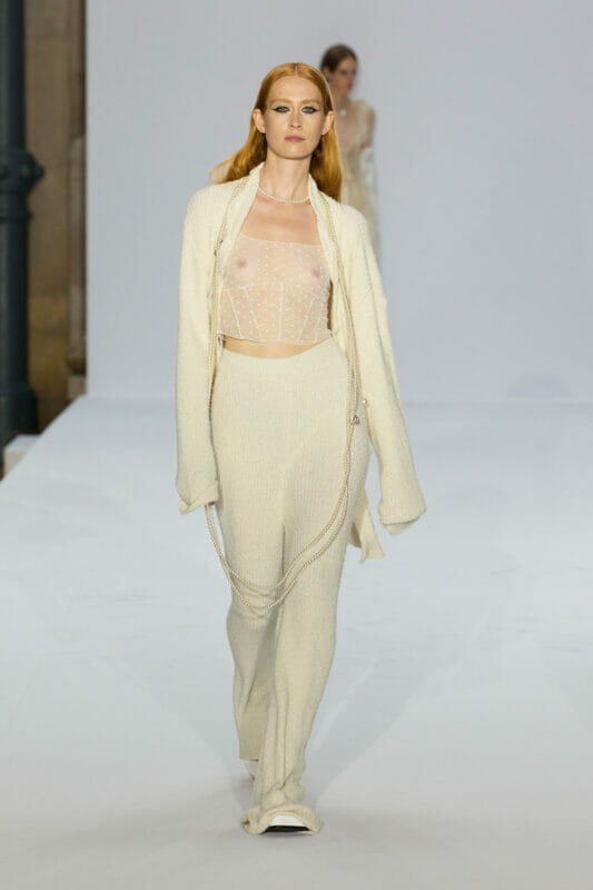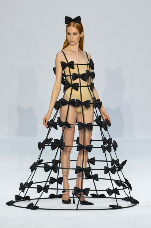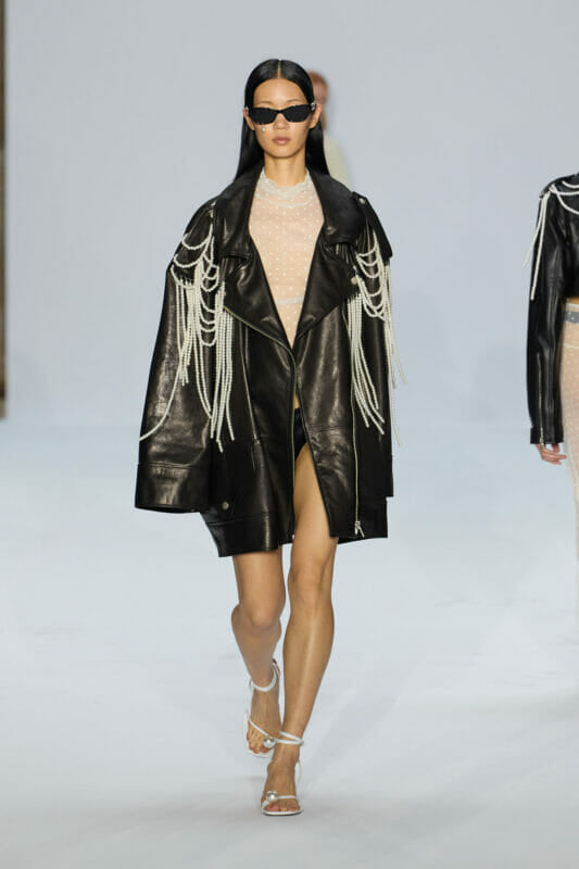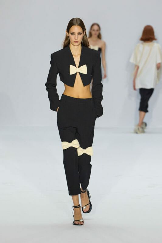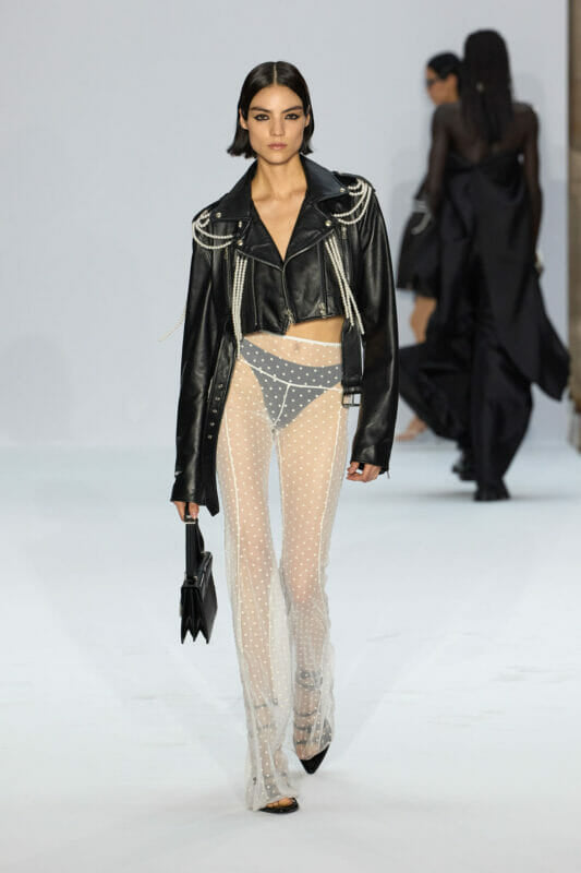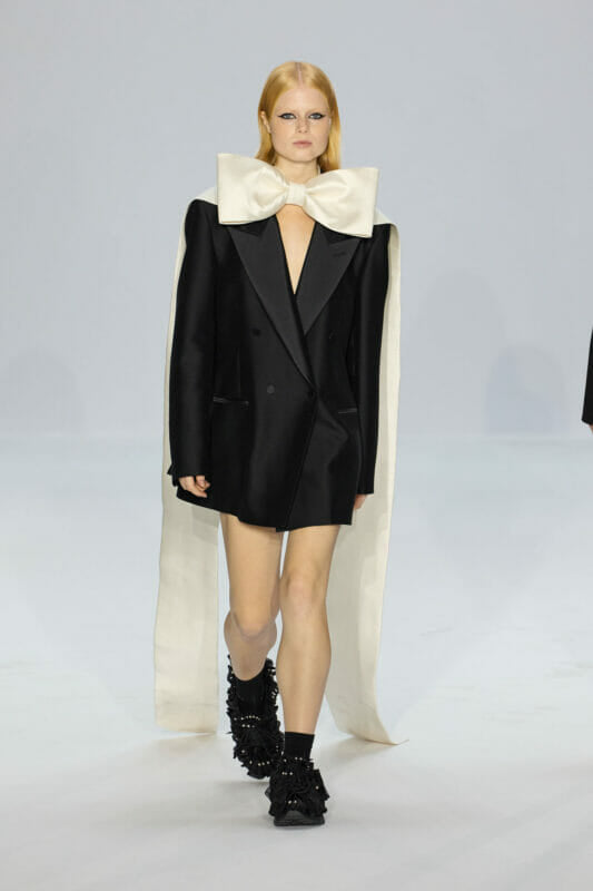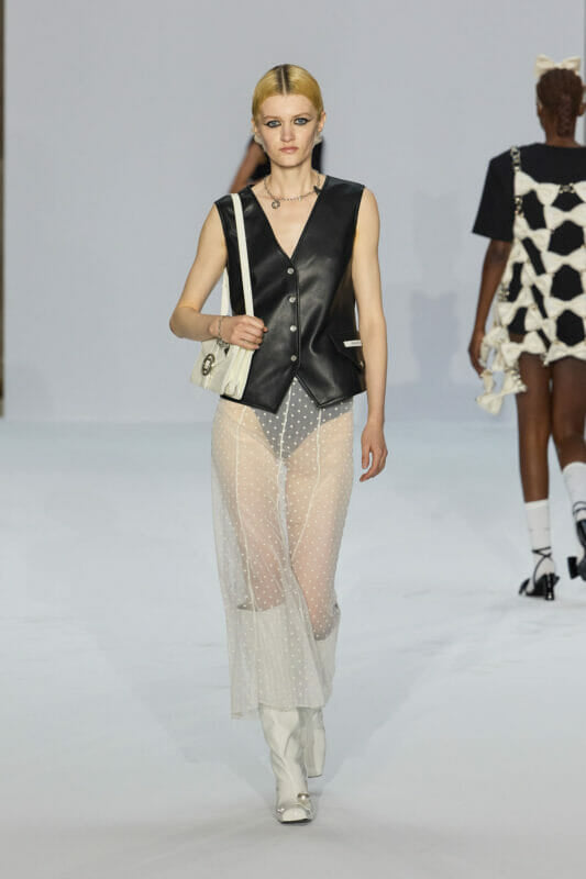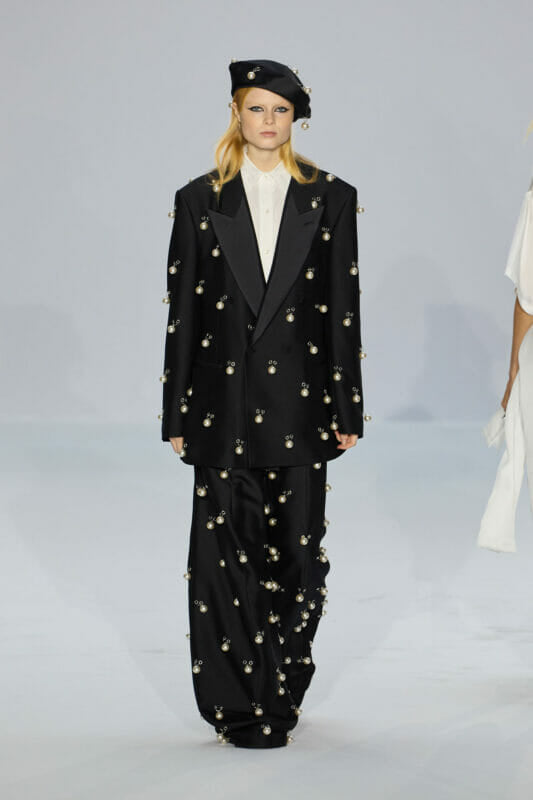 Tuxedo pieces adorned with pearls showcase the house’s passion for handcrafting. And a dress constructed with labels shown together symbolizes self-love. Reimagined activewear in polka dot embroidery lace completes the collection.