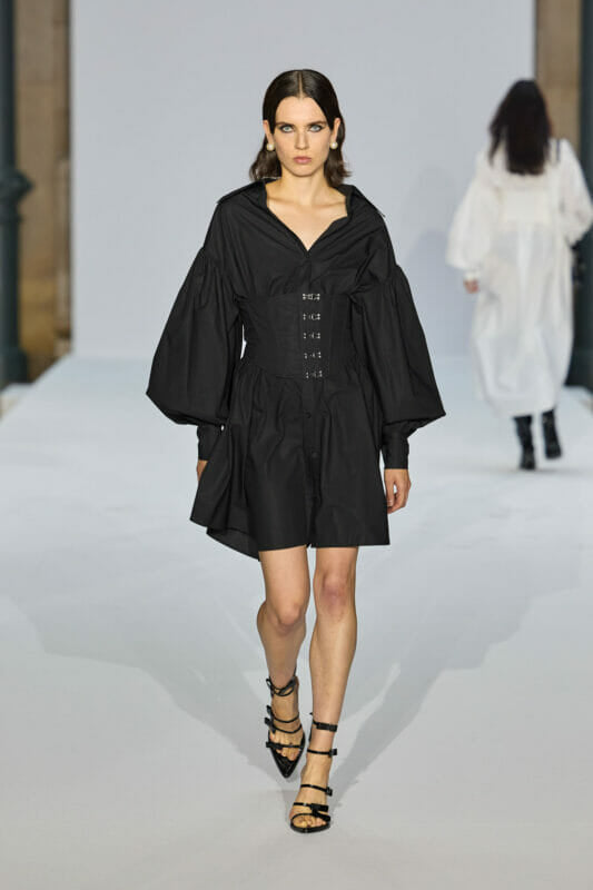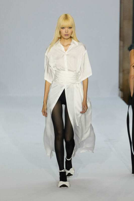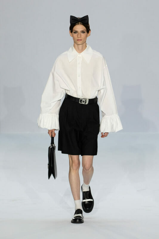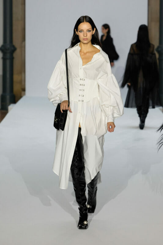 The collection features jackets and shirts that accentuate the waist. Gathered puff sleeves exude glamour, while experimental dresses combine contrasting materials like chains and bows, creating a wholly unexpected beauty.
