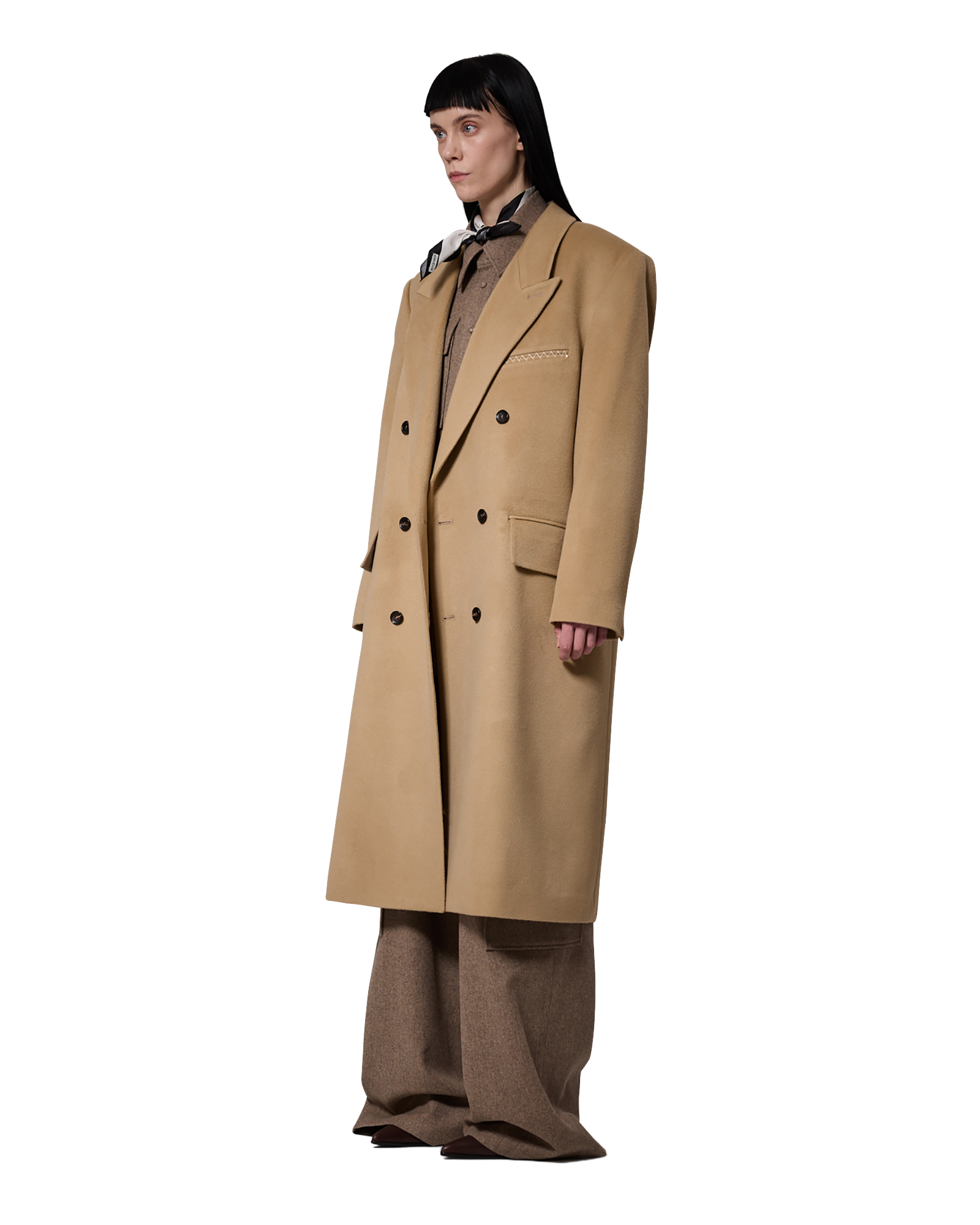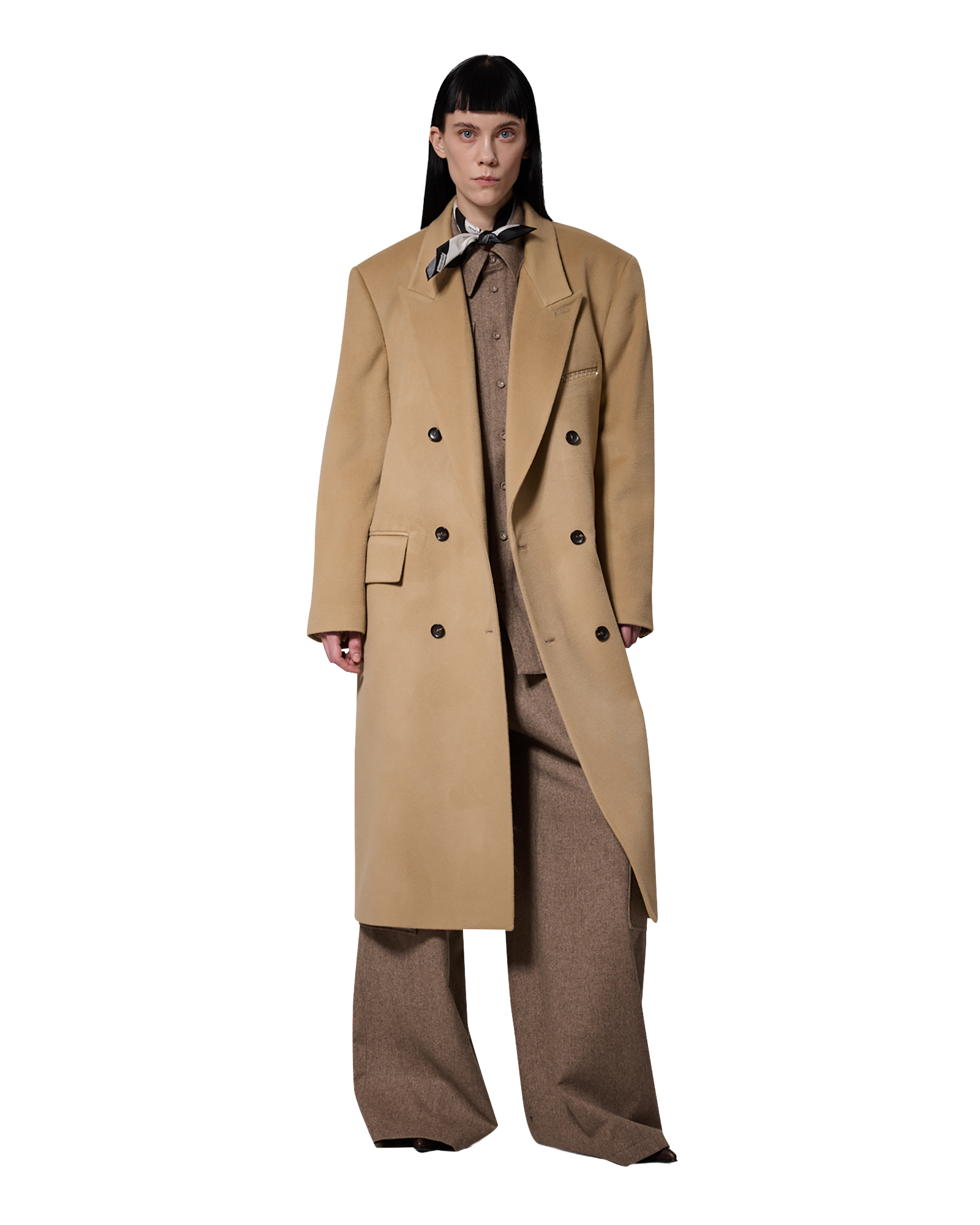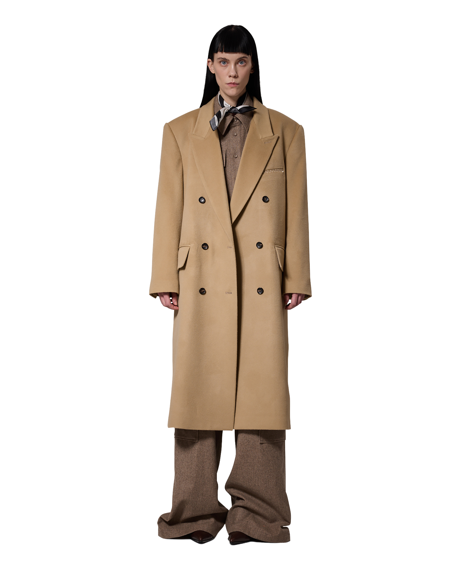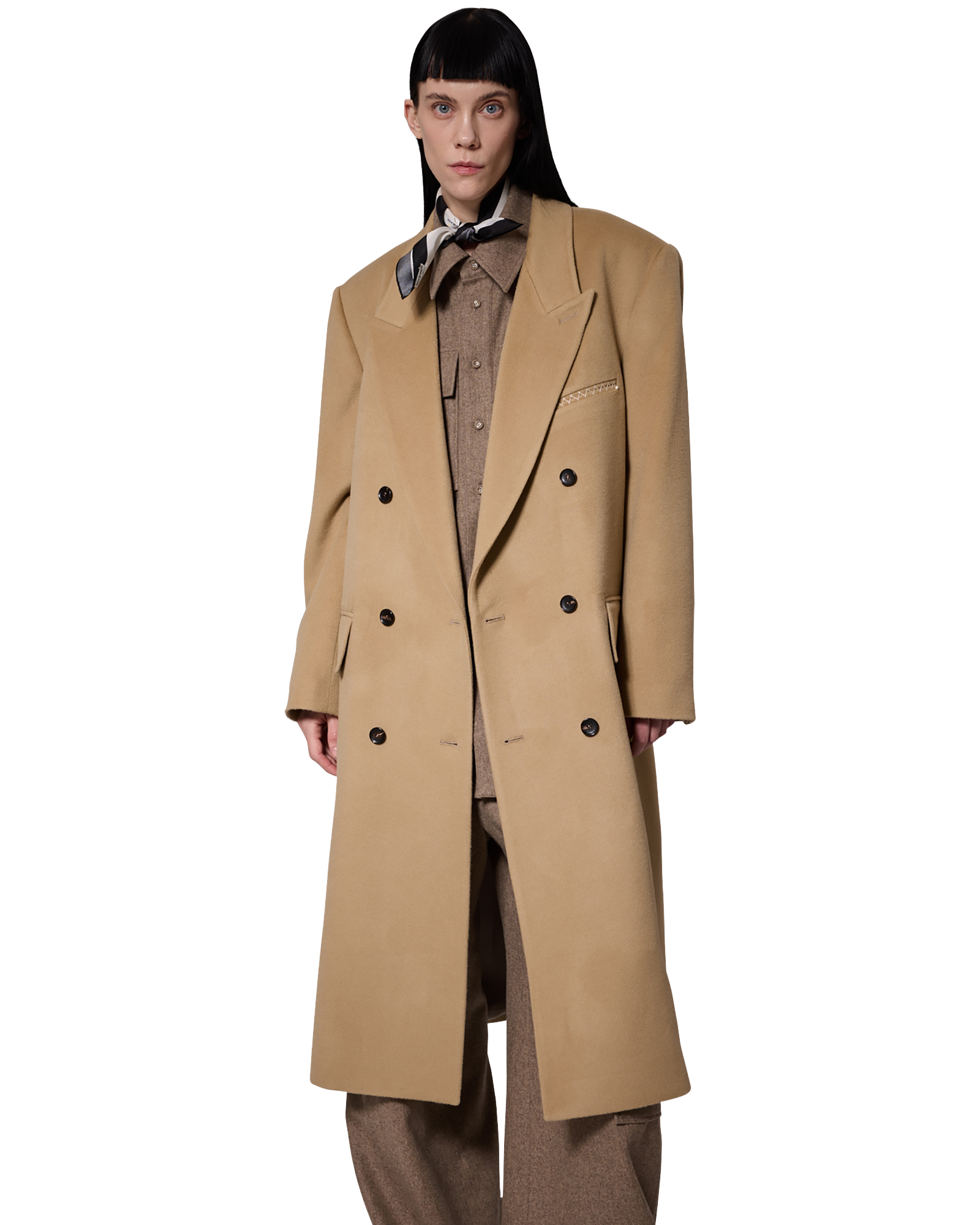 -An oversized double-breasted coat made from a wool-cashmere blend fabric.