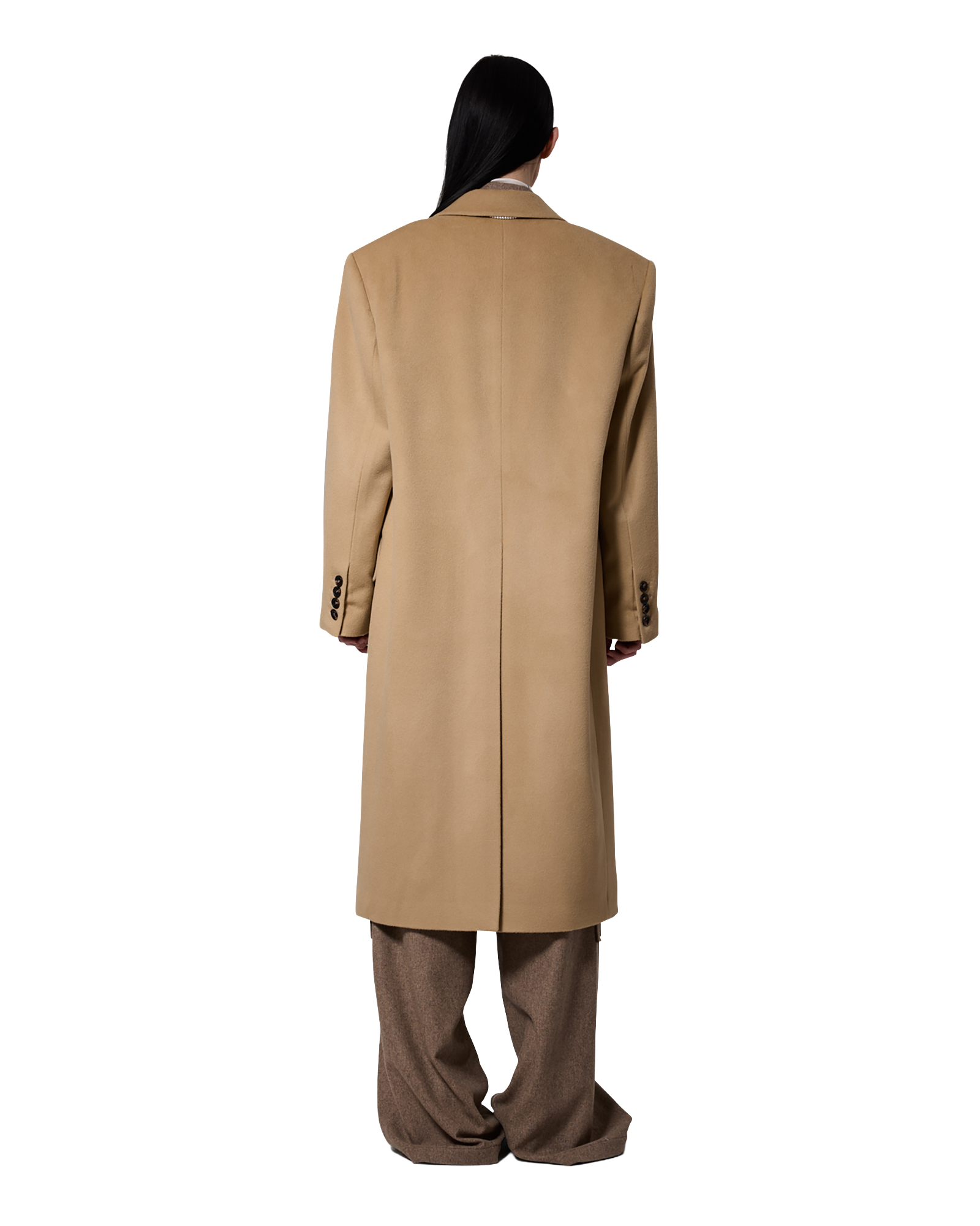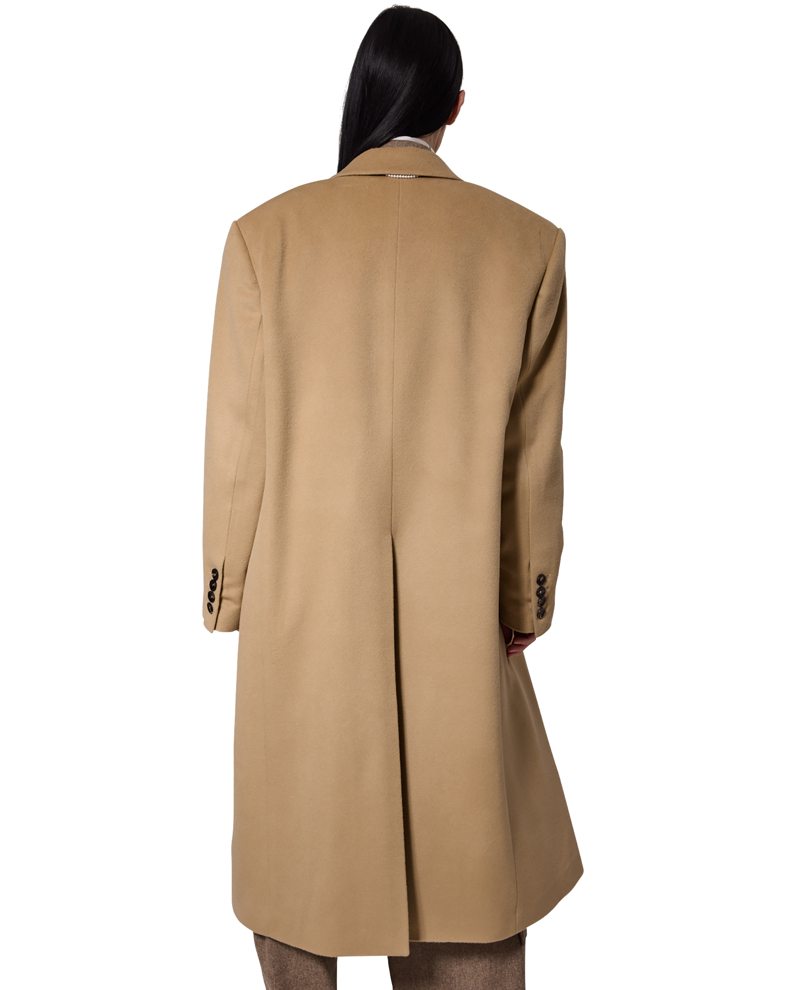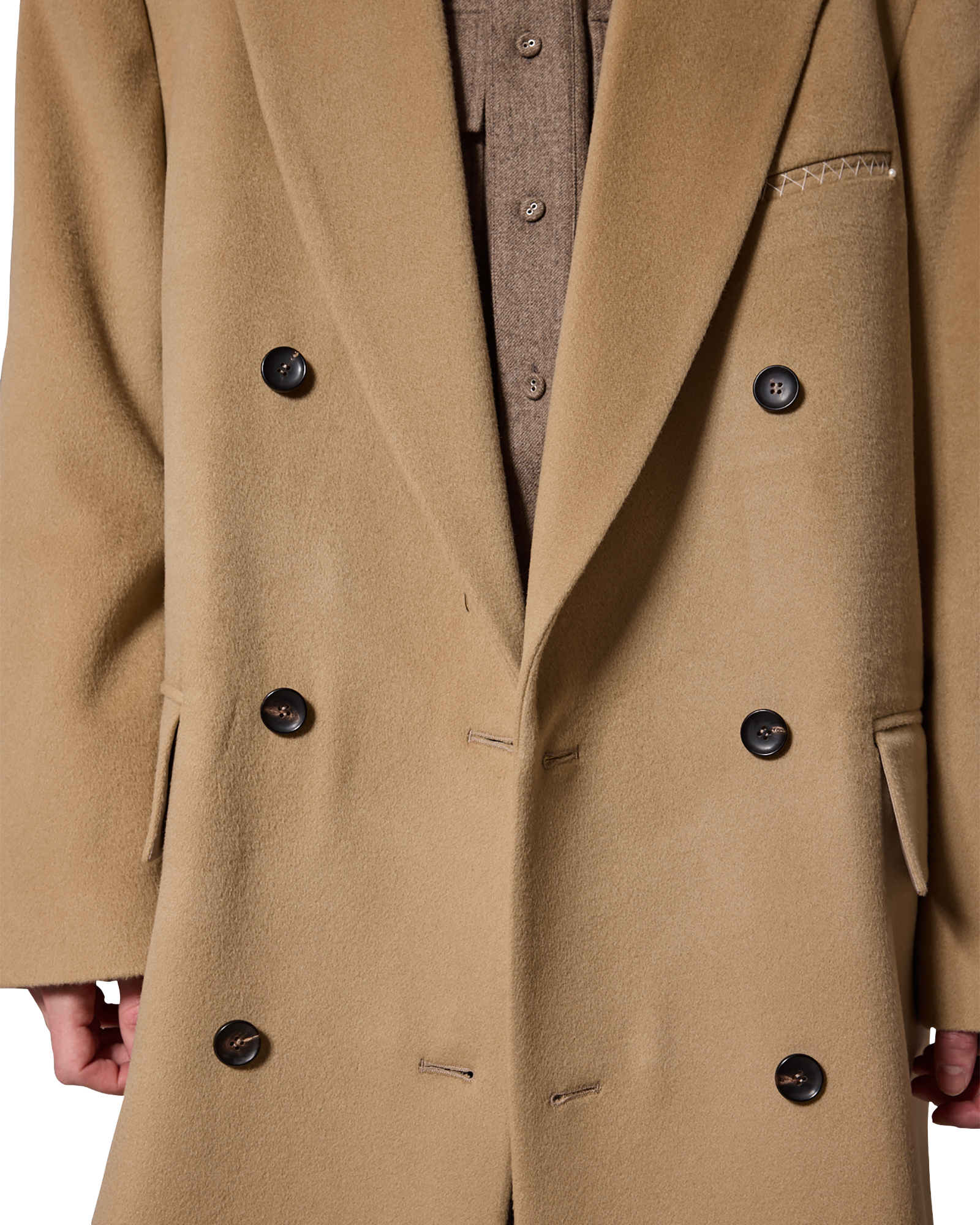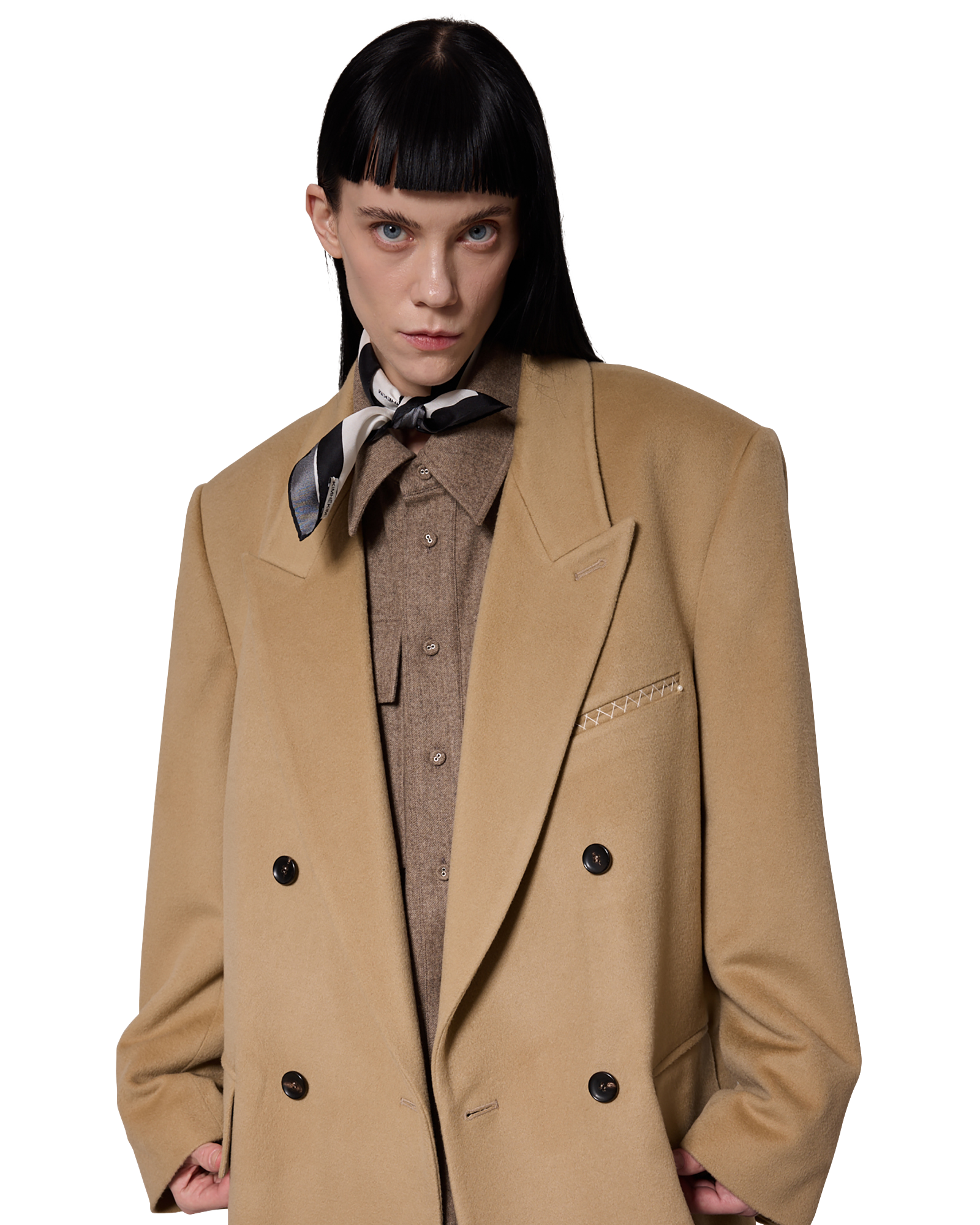 -An oversized double-breasted coat made from a wool-cashmere blend fabric.