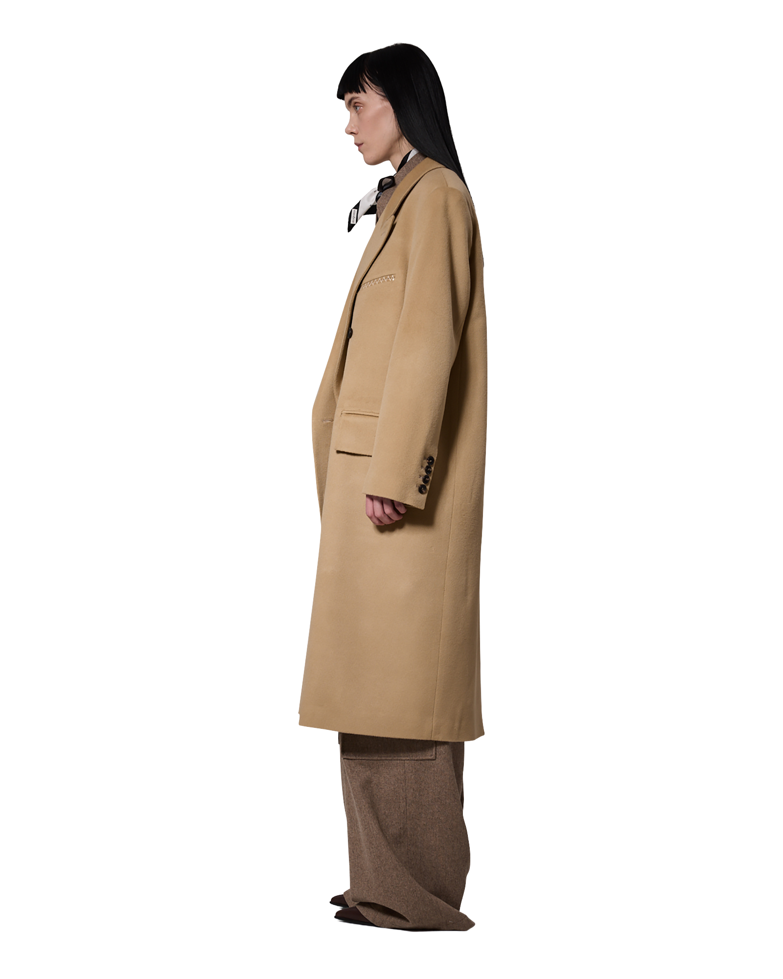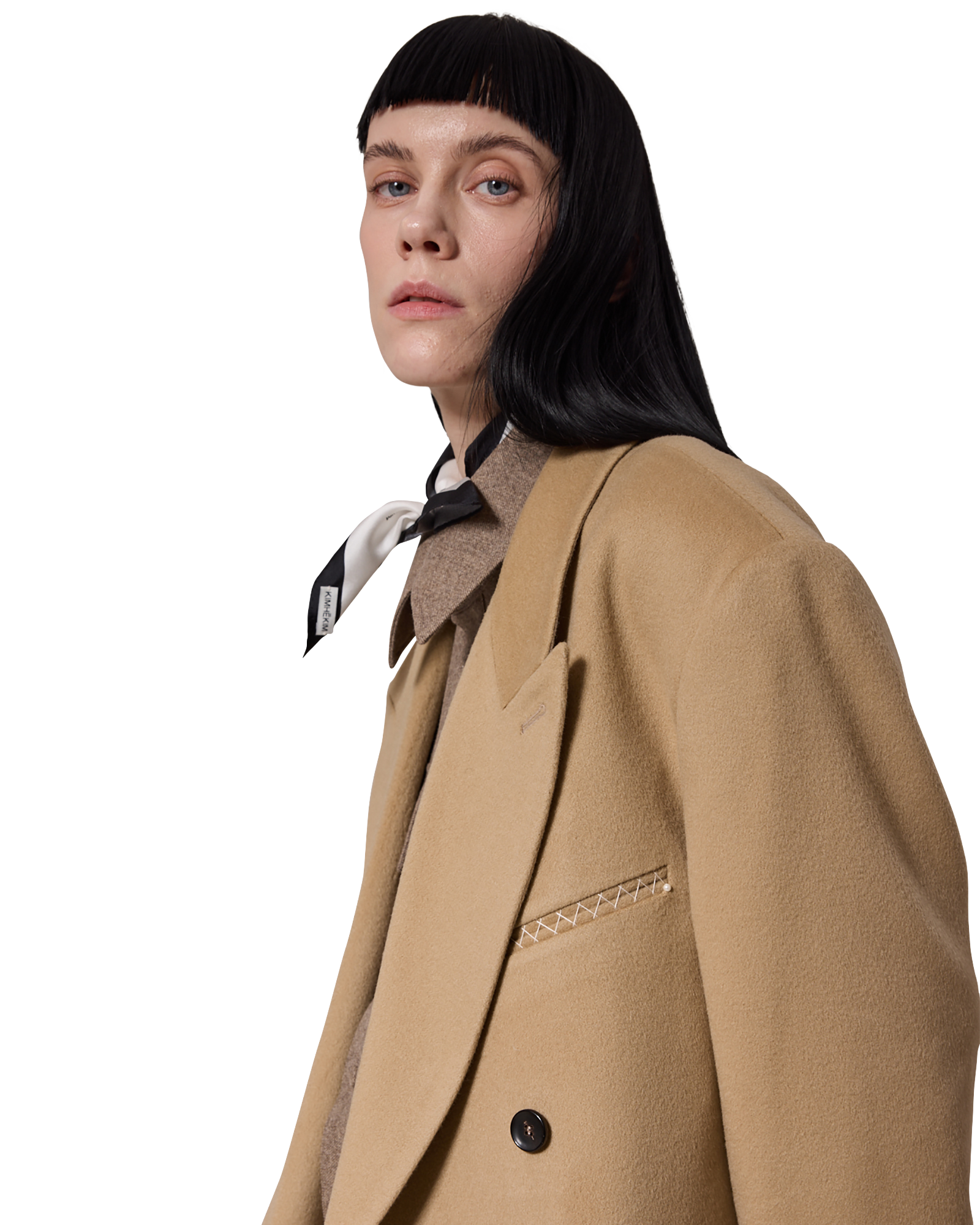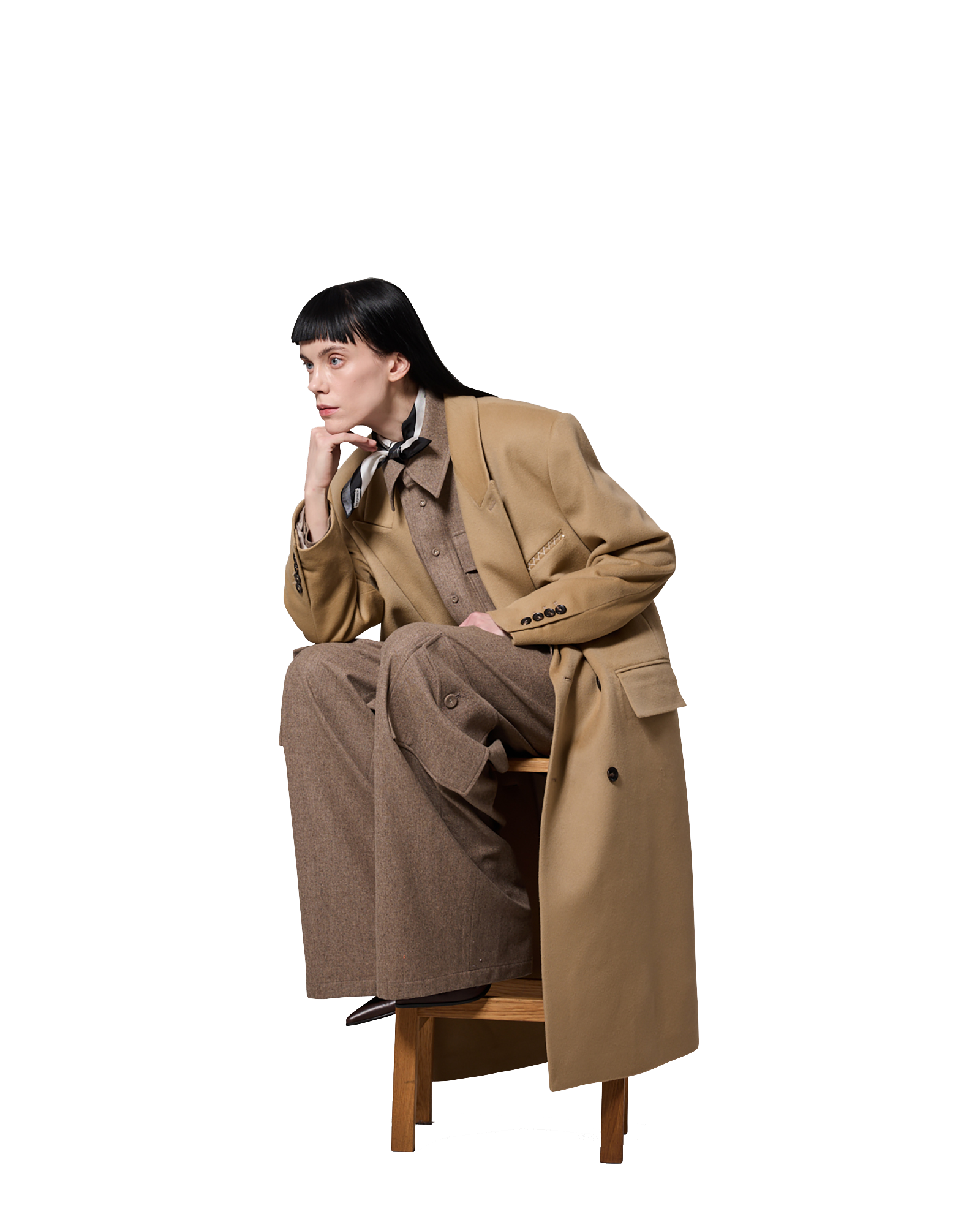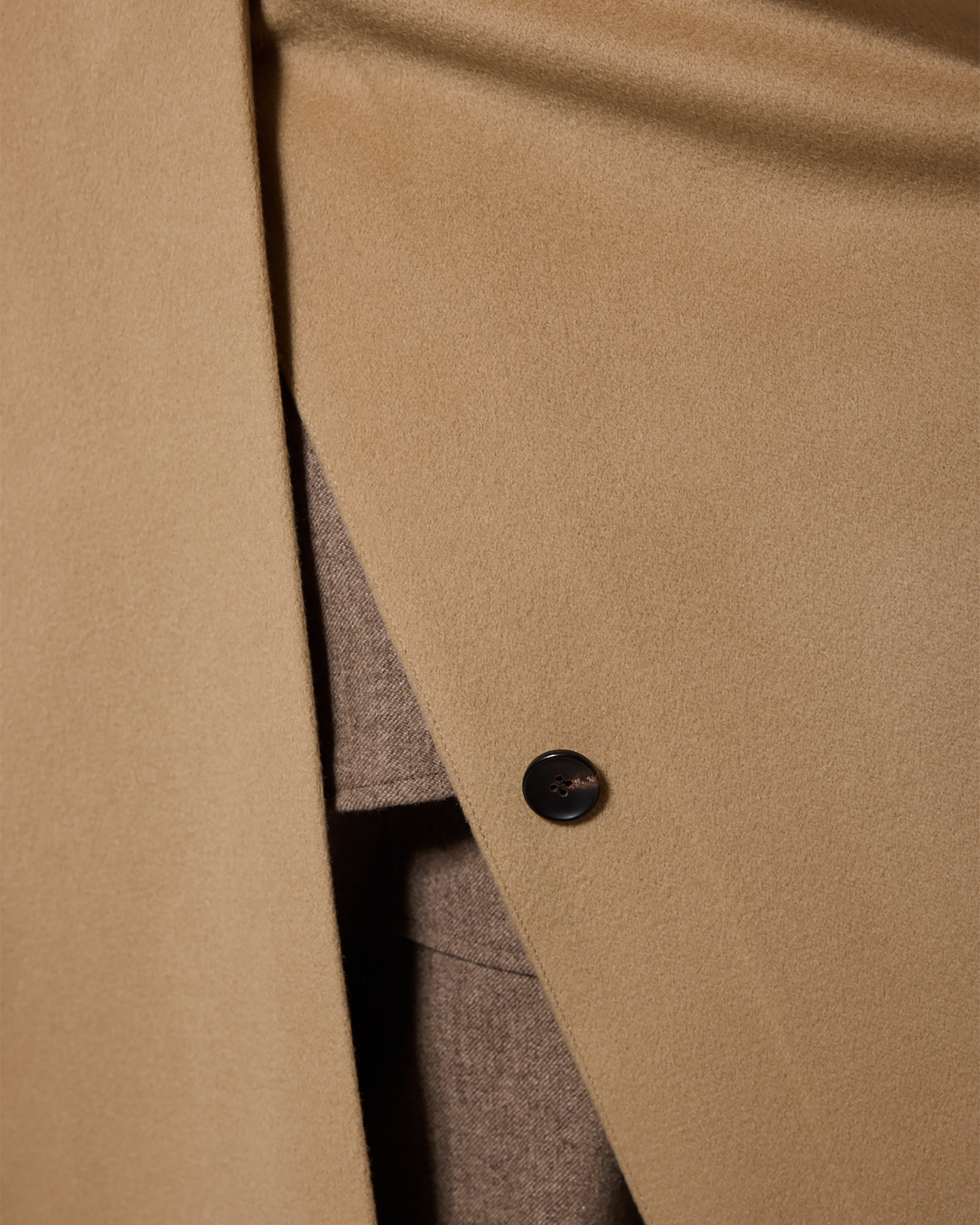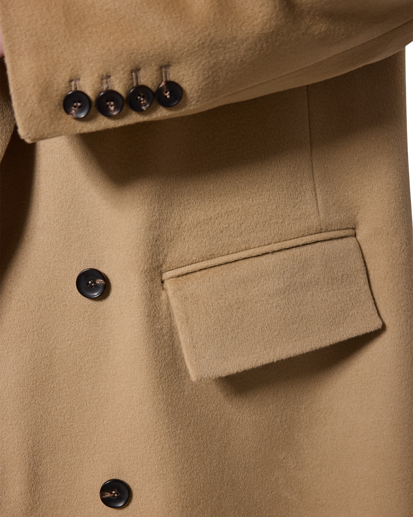 -An oversized double-breasted coat made from a wool-cashmere blend fabric.