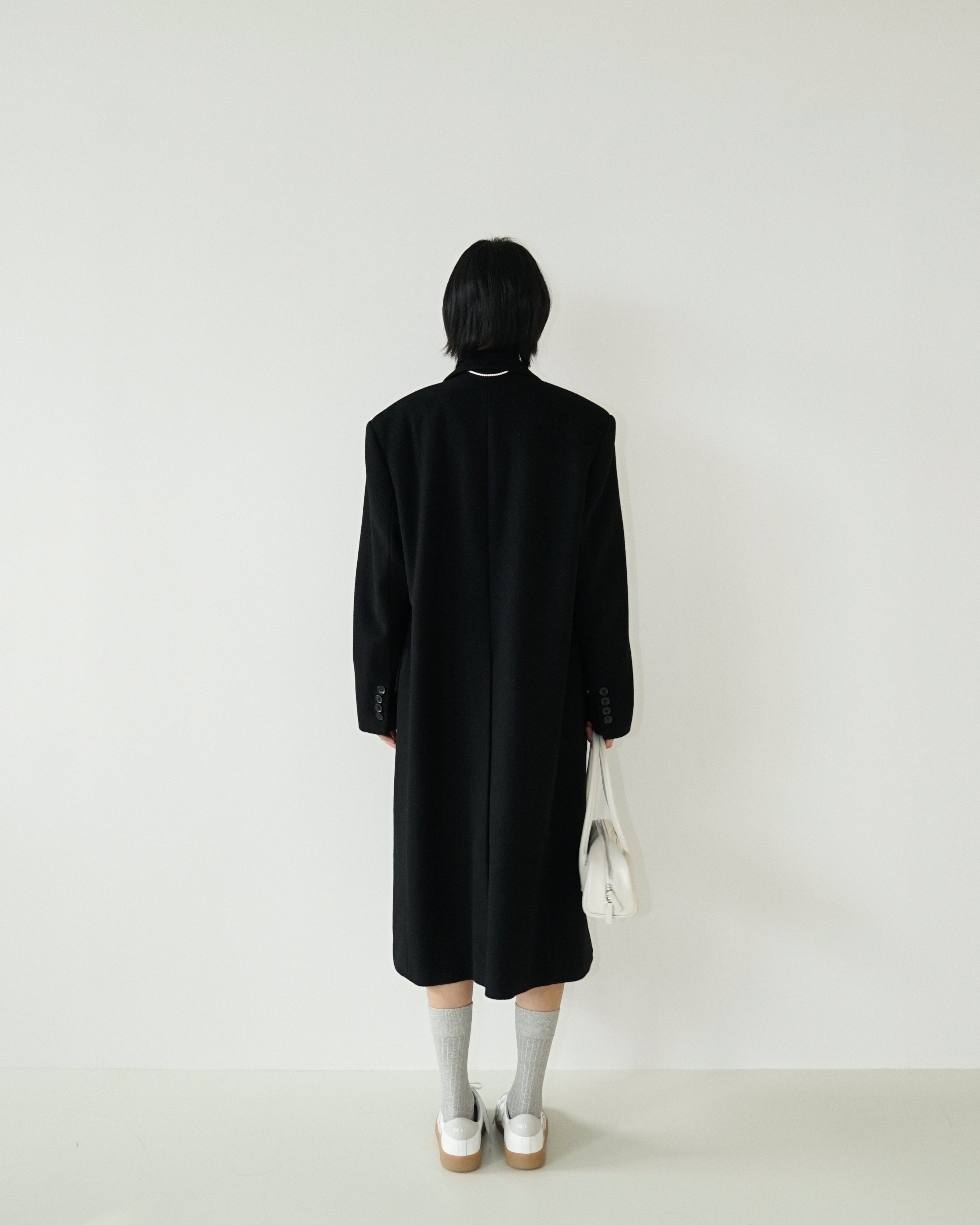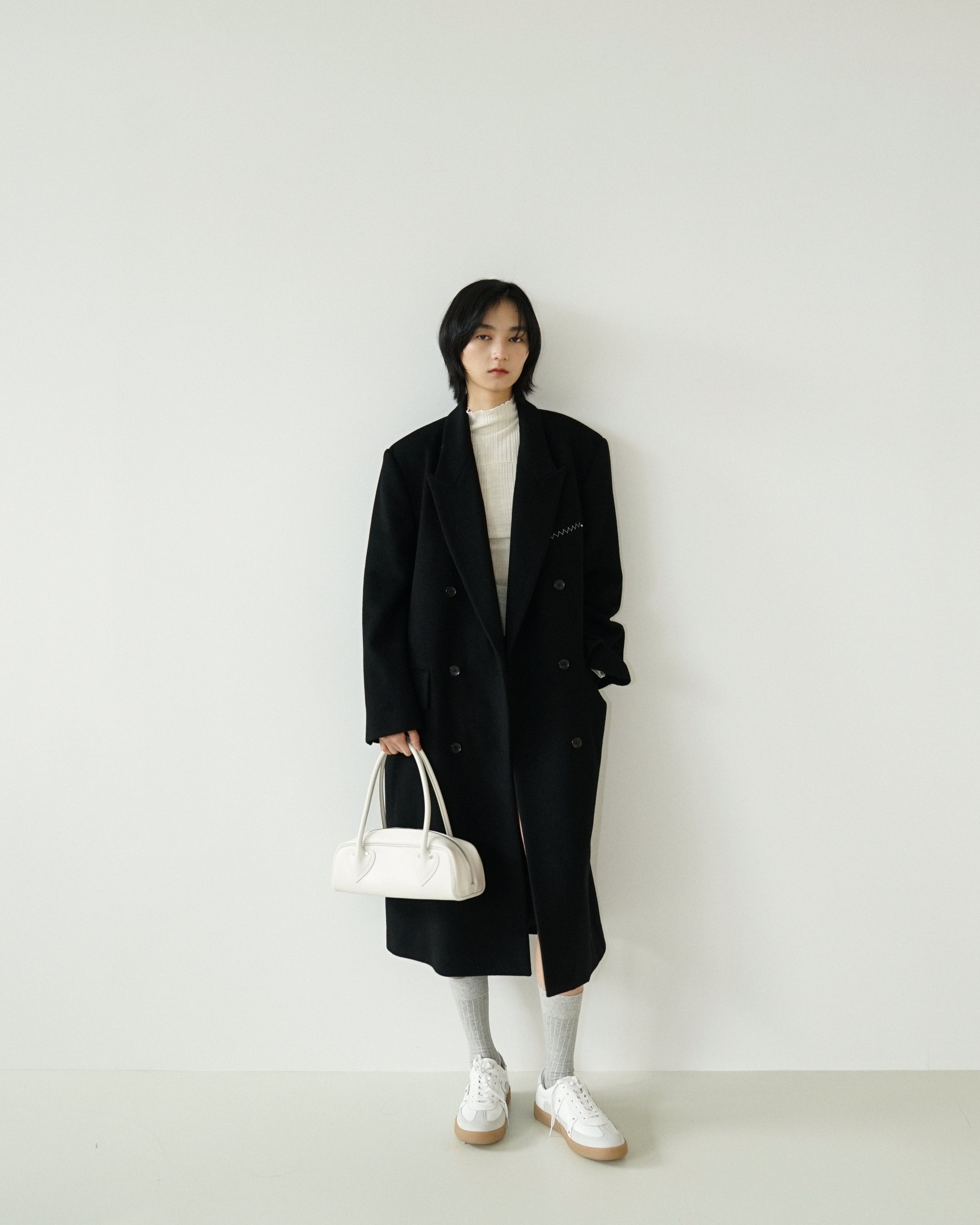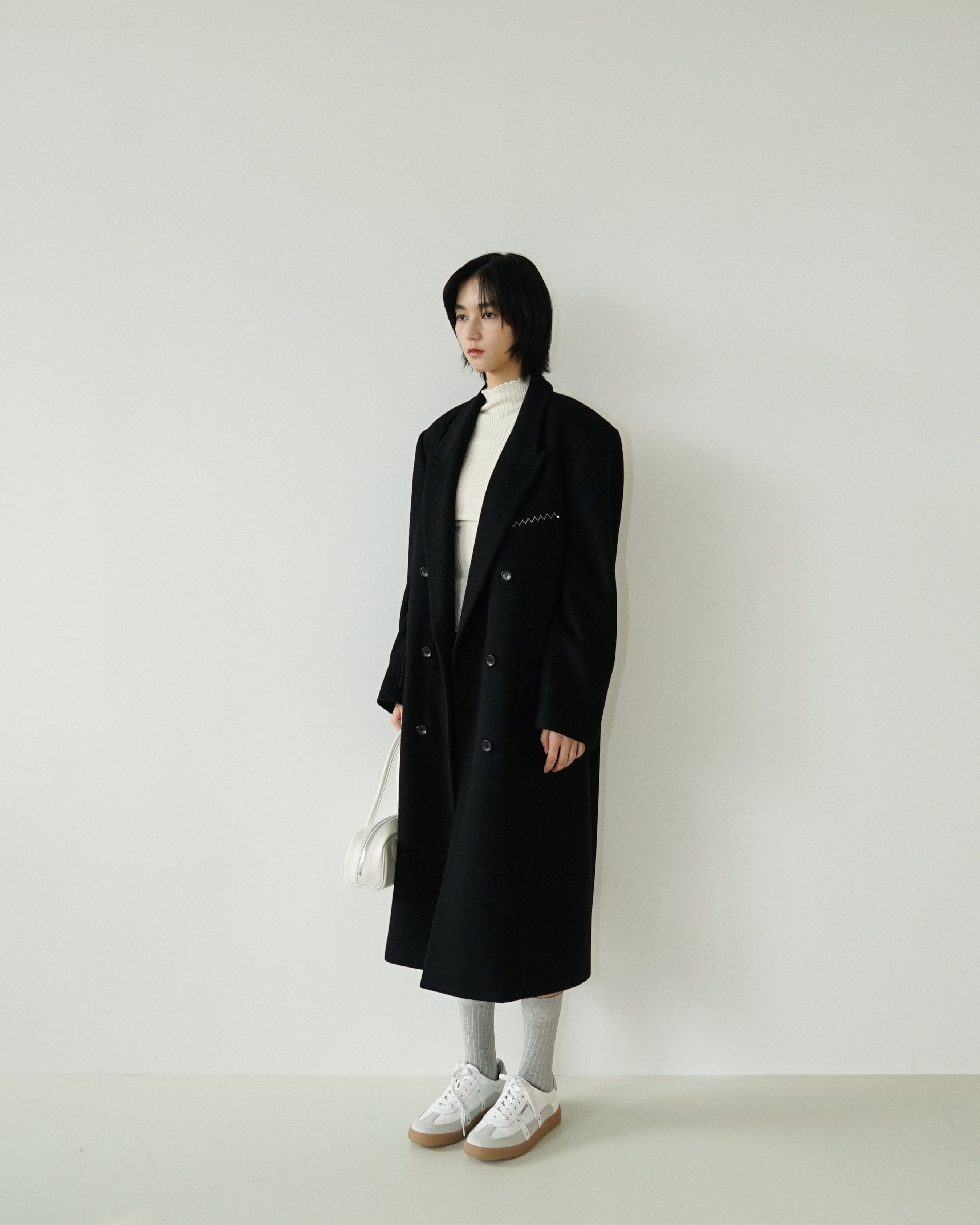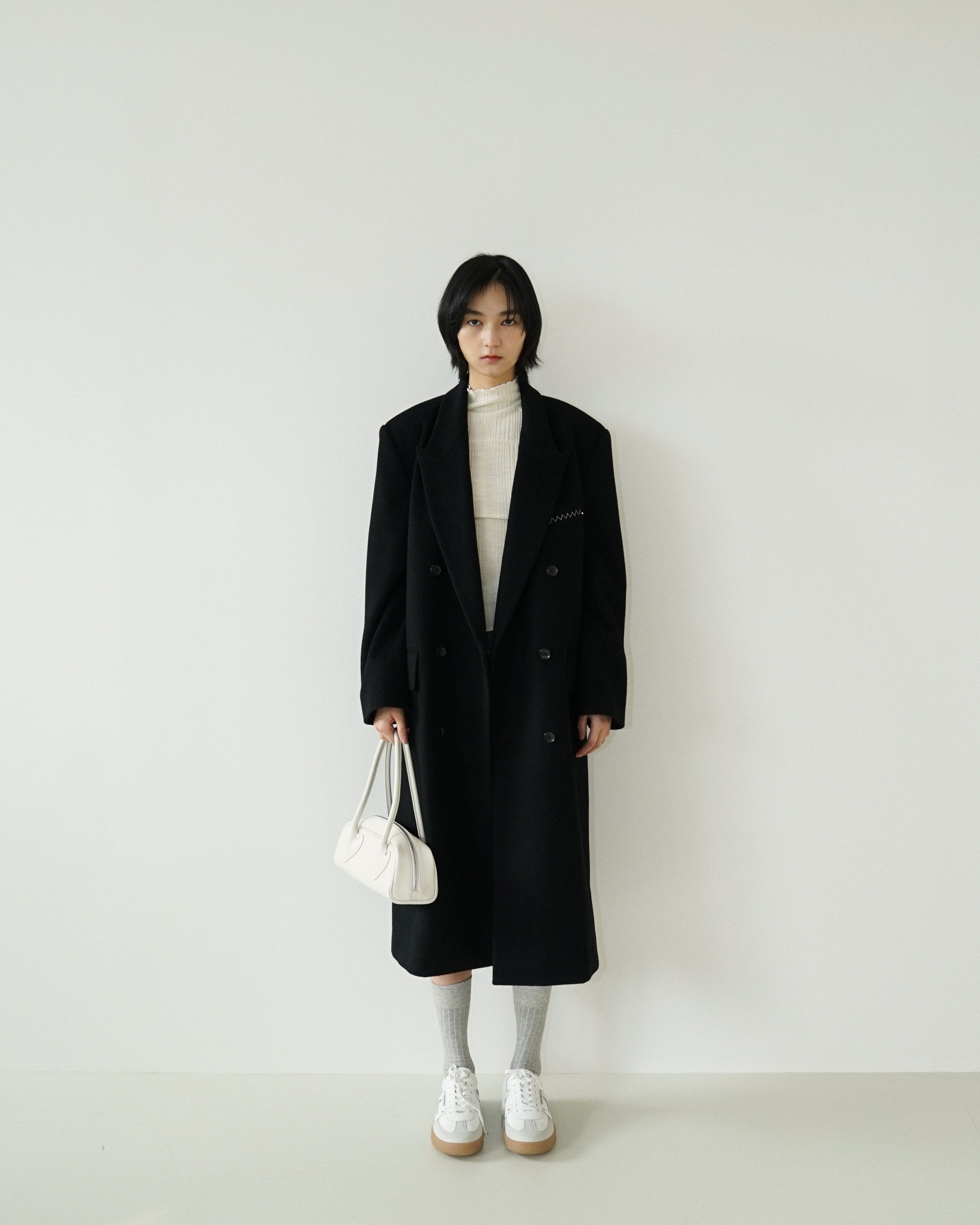 -An oversized double-breasted coat made from a wool-cashmere blend fabric.