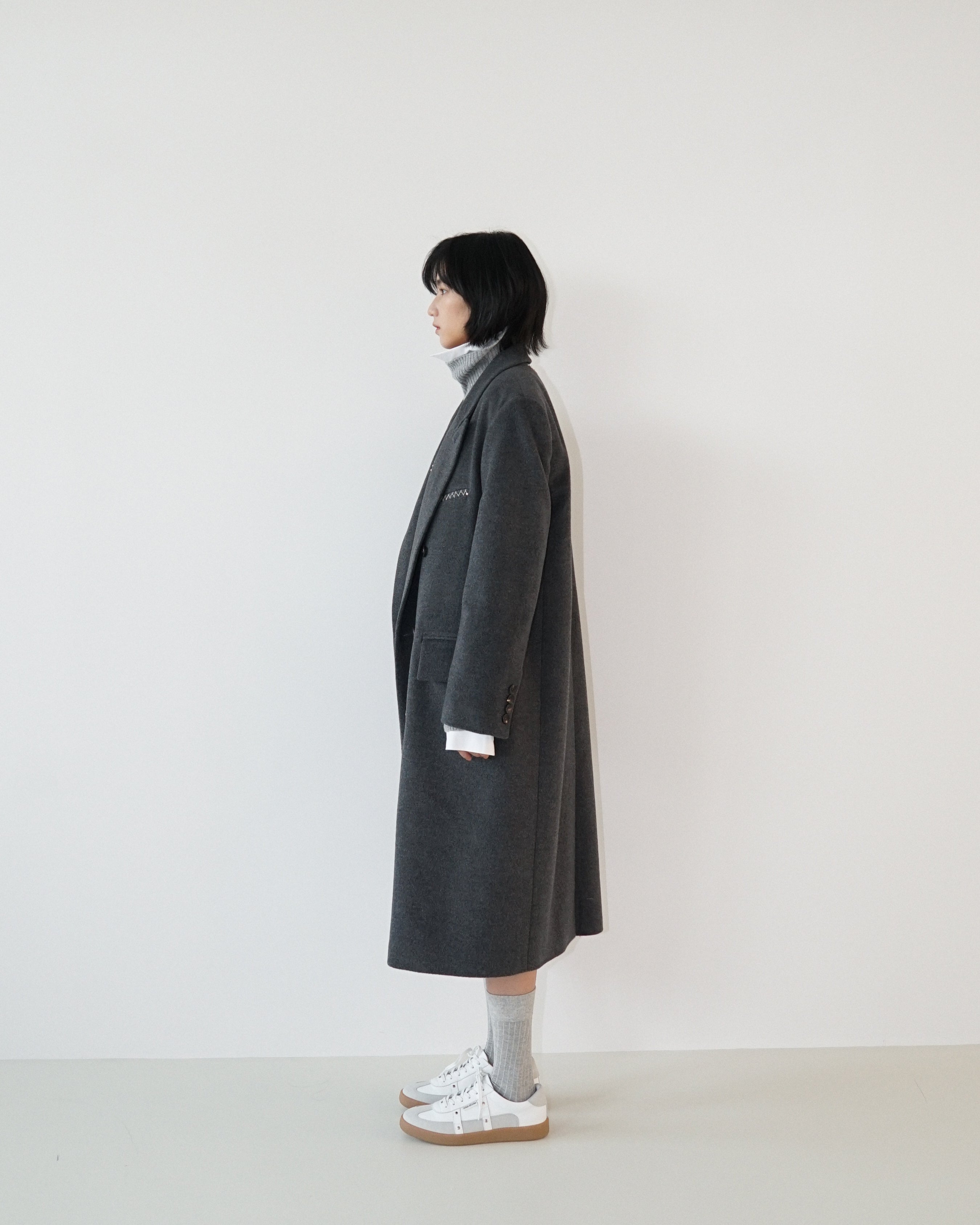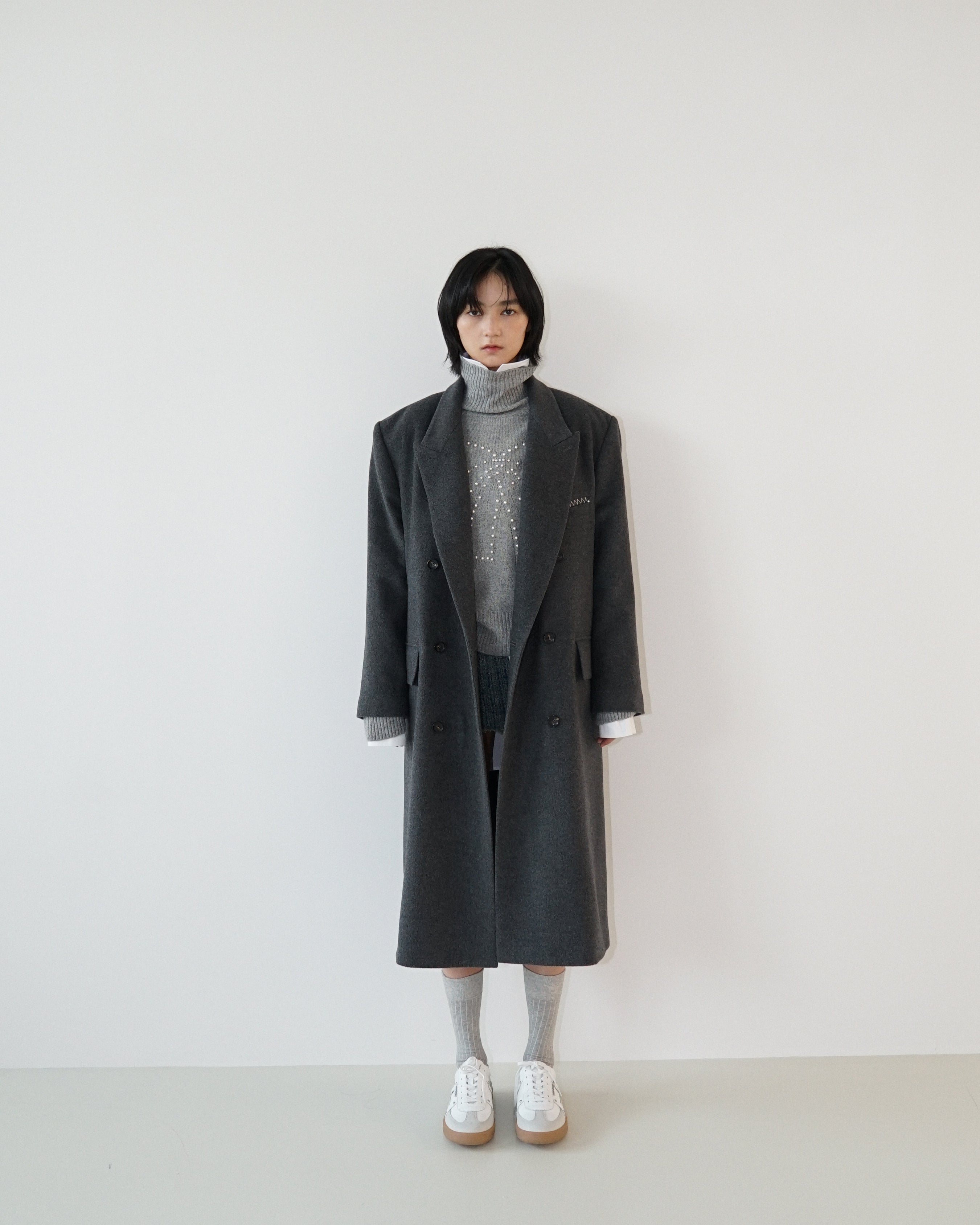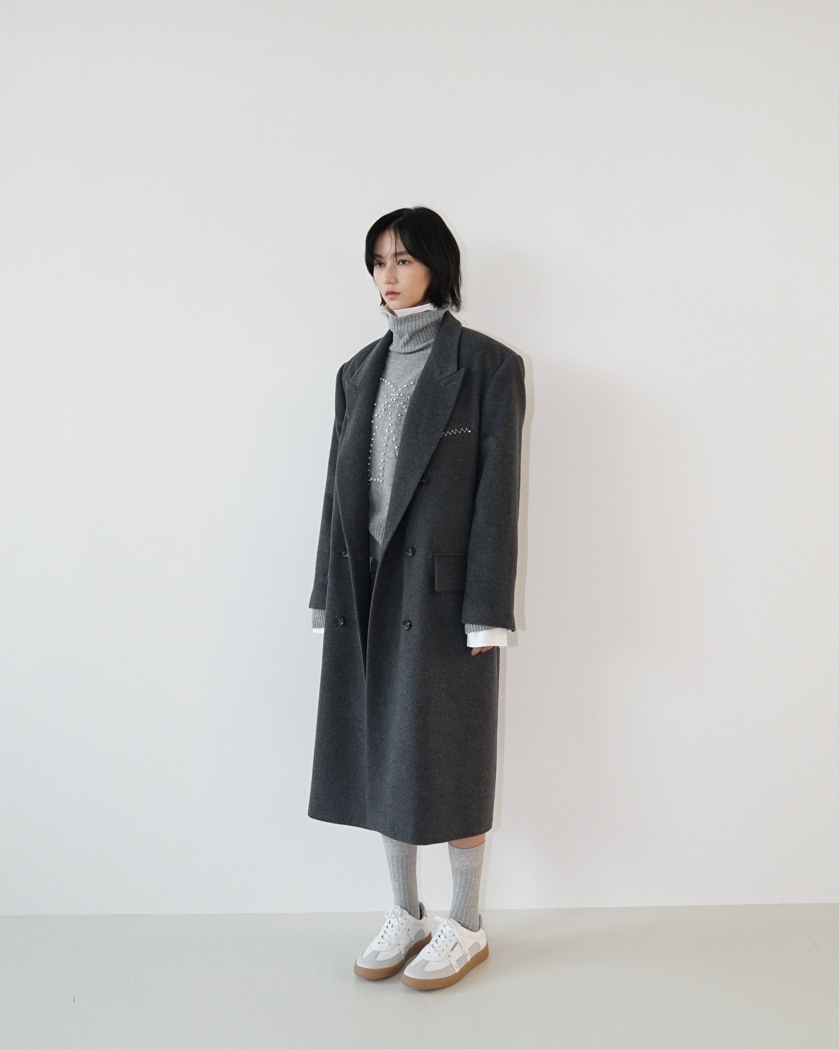 -An oversized double-breasted coat made from a wool-cashmere blend fabric.