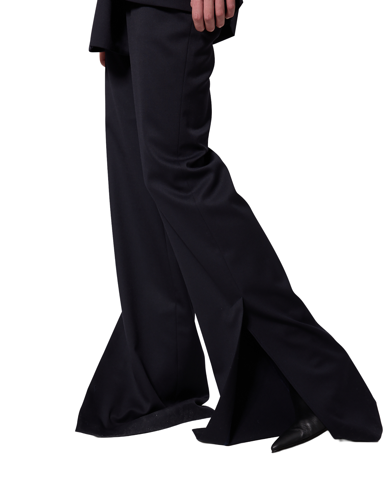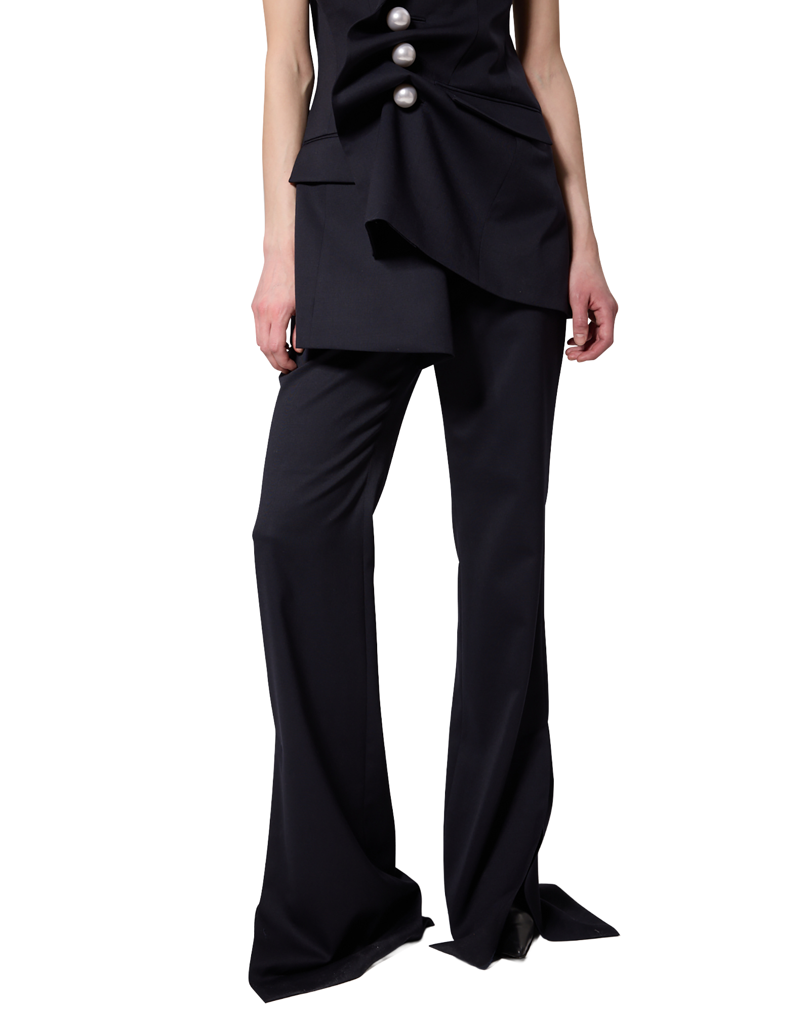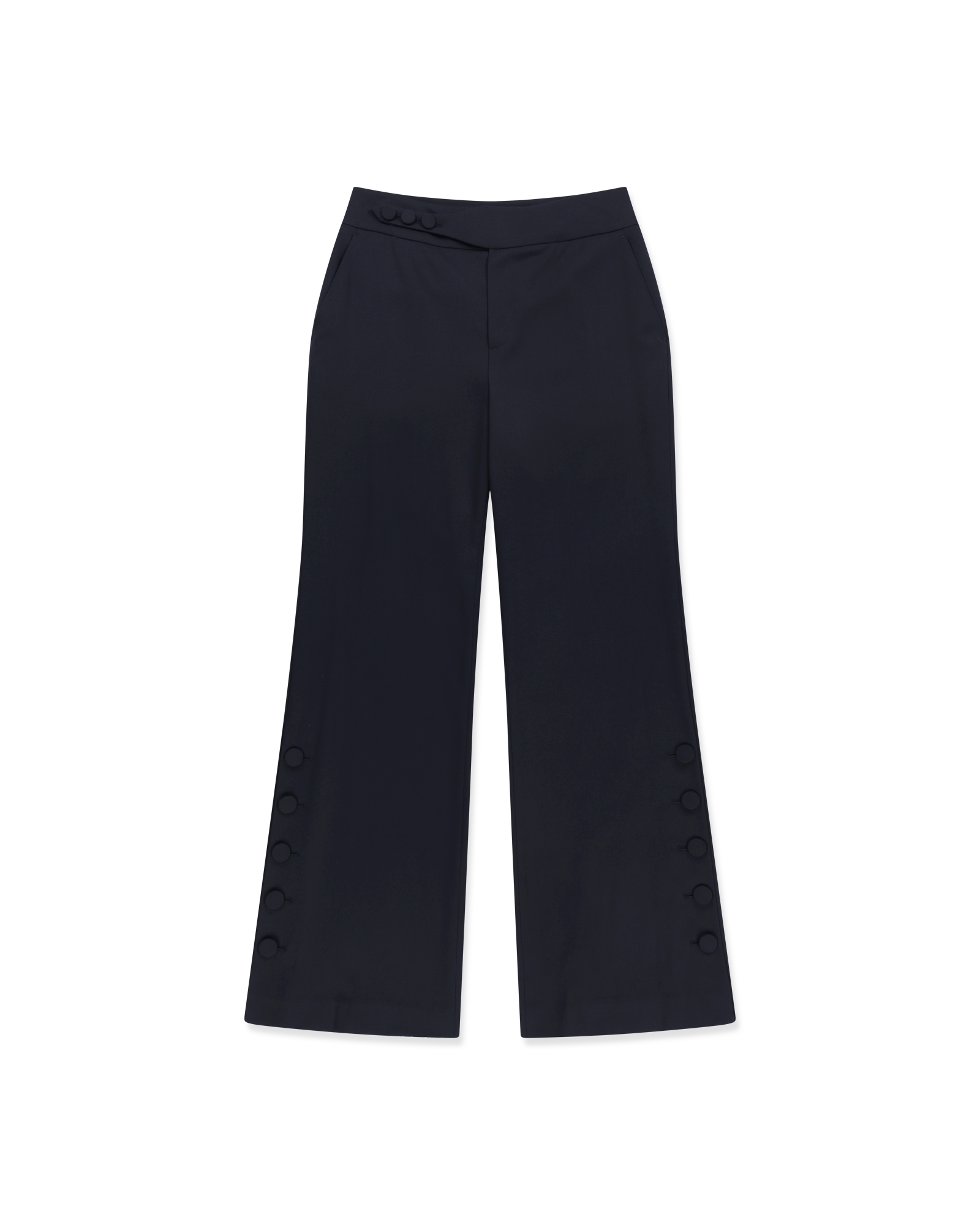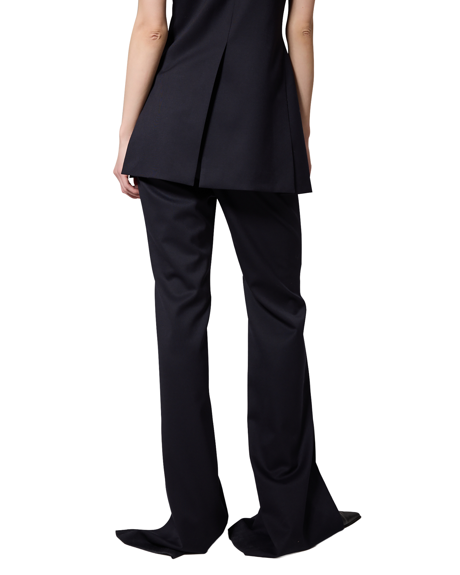 -Flared pants made from a wool-blend fabric.