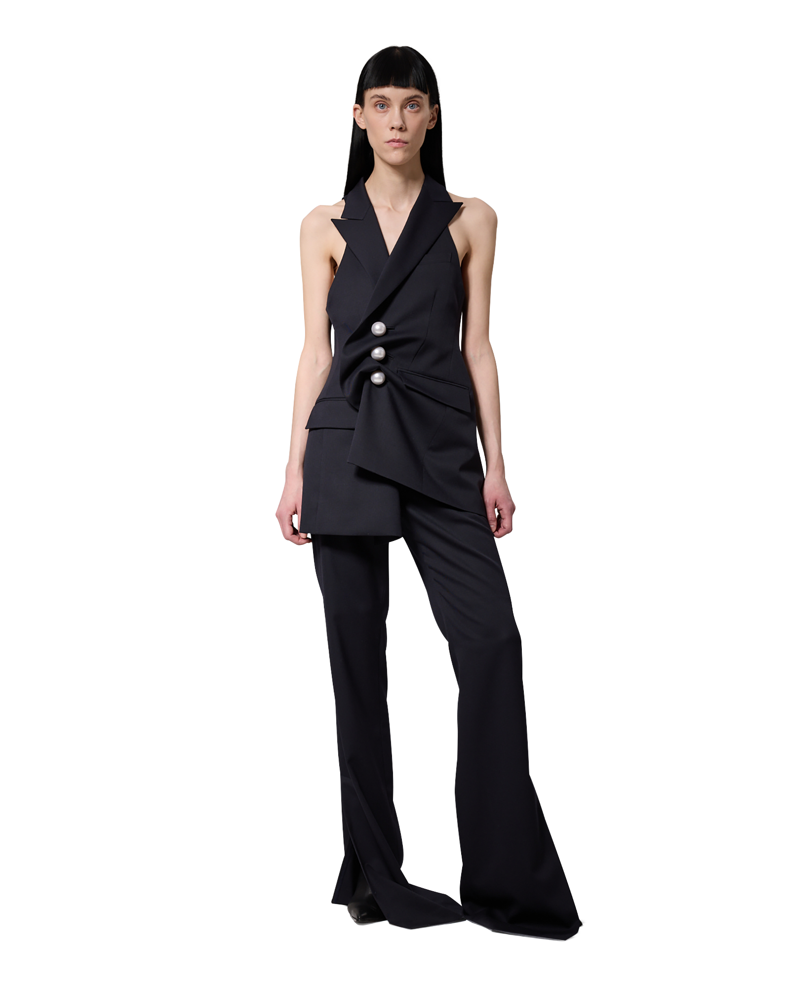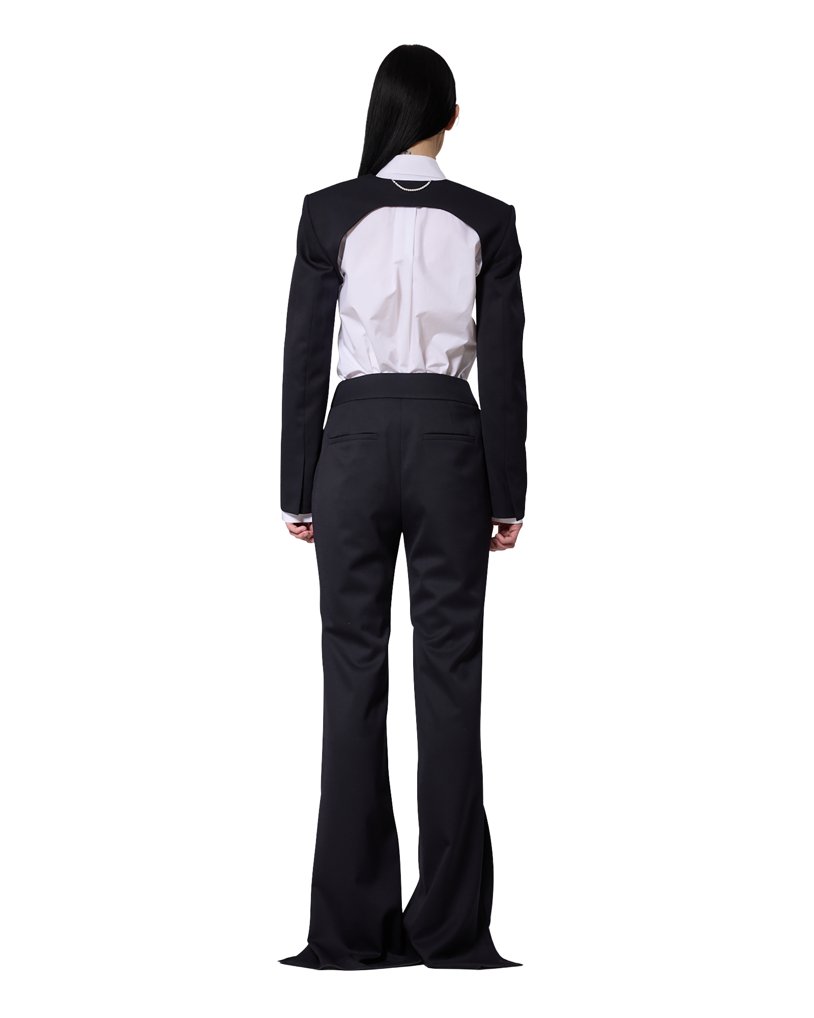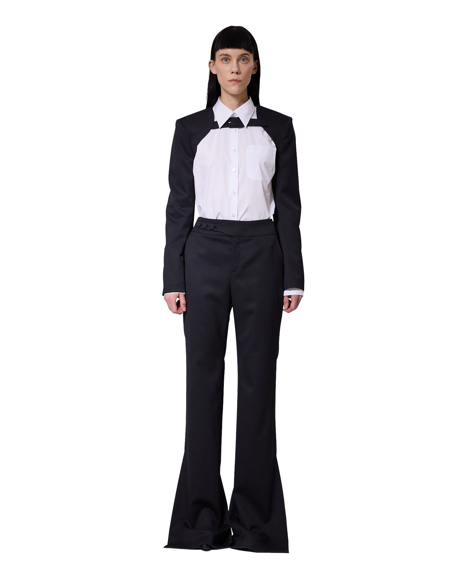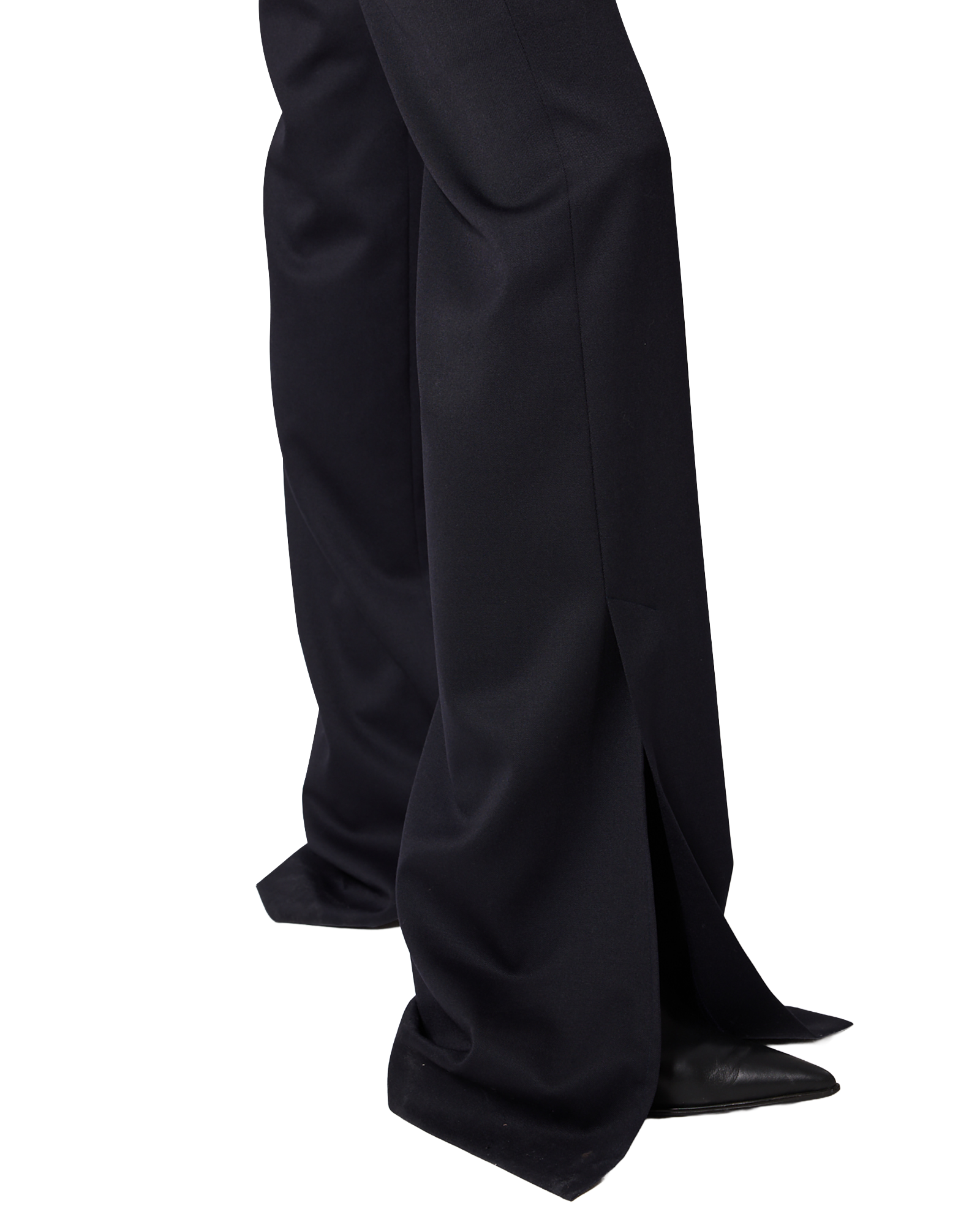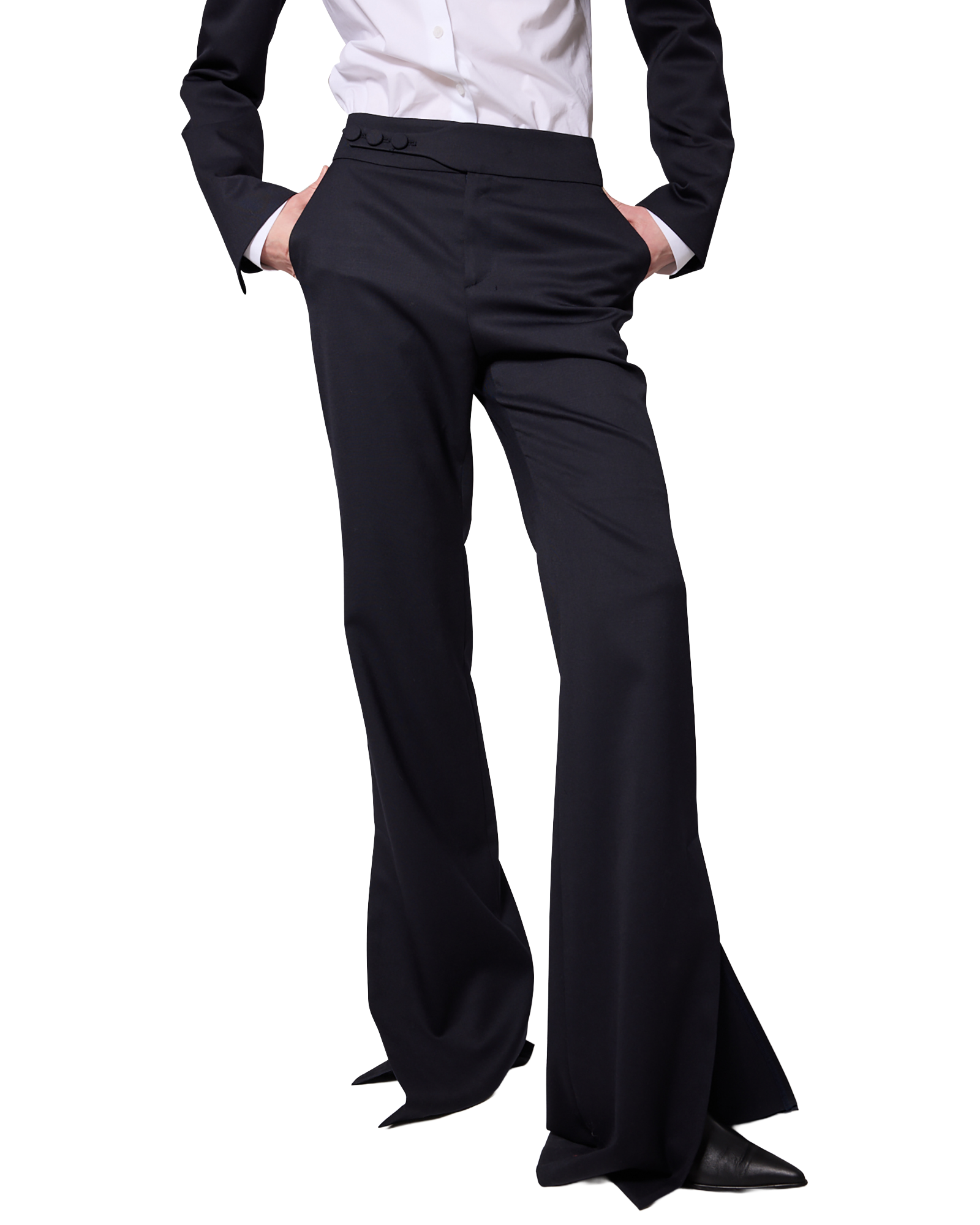 -Flared pants made from a wool-blend fabric.