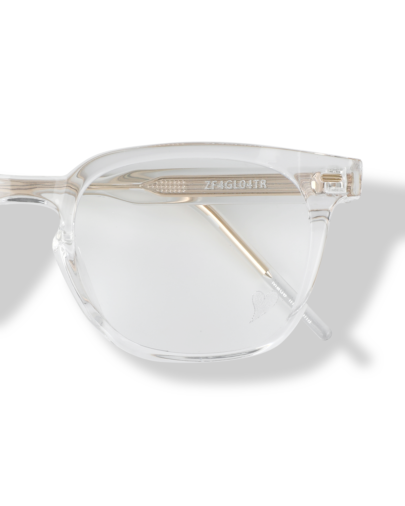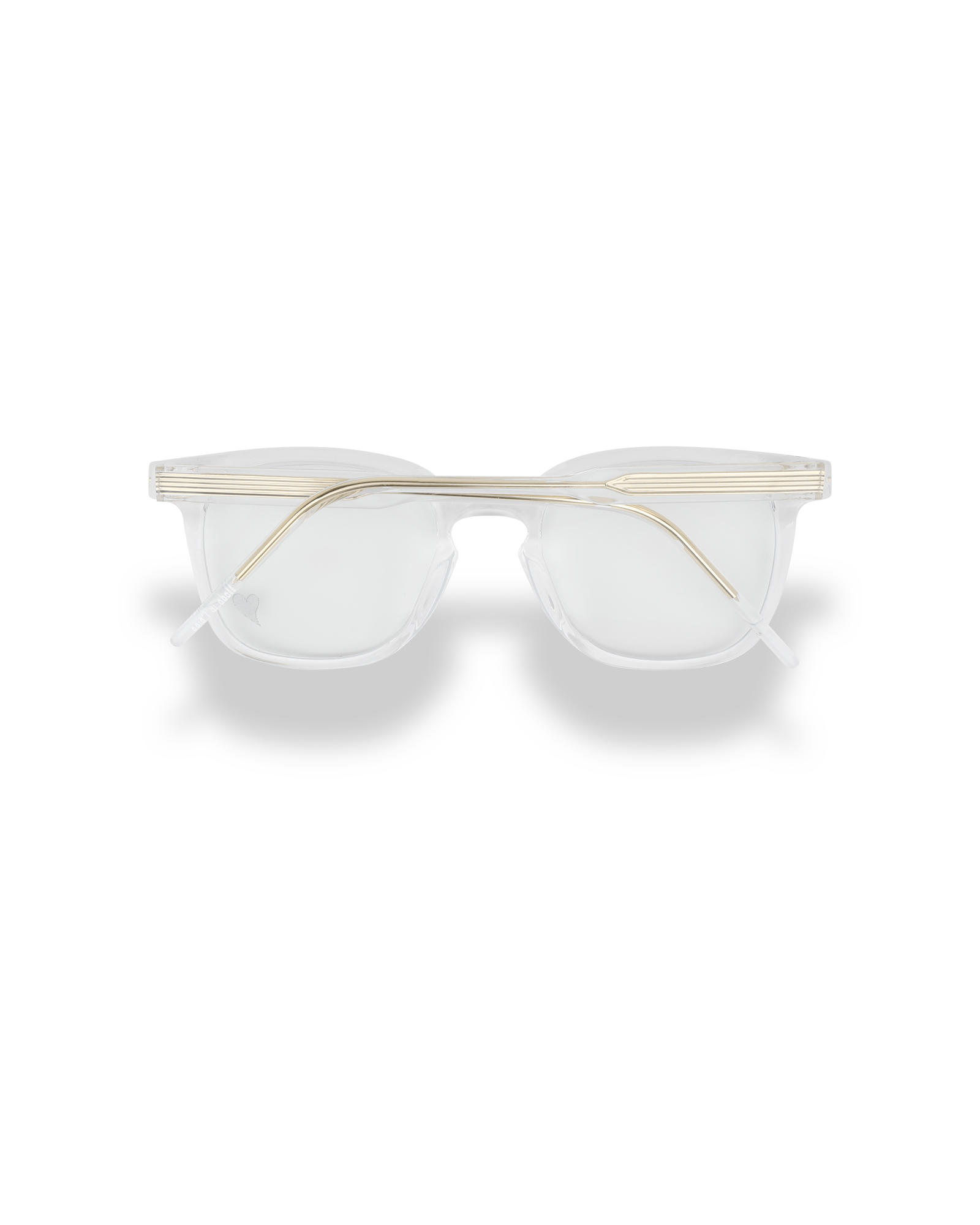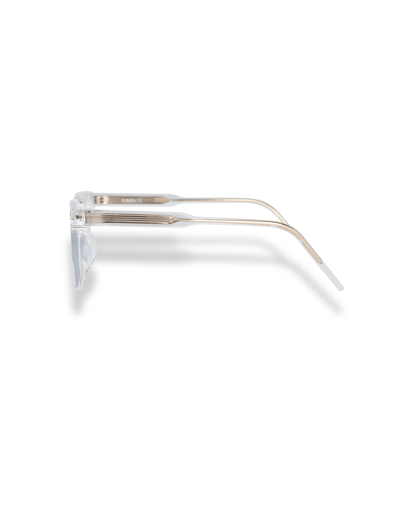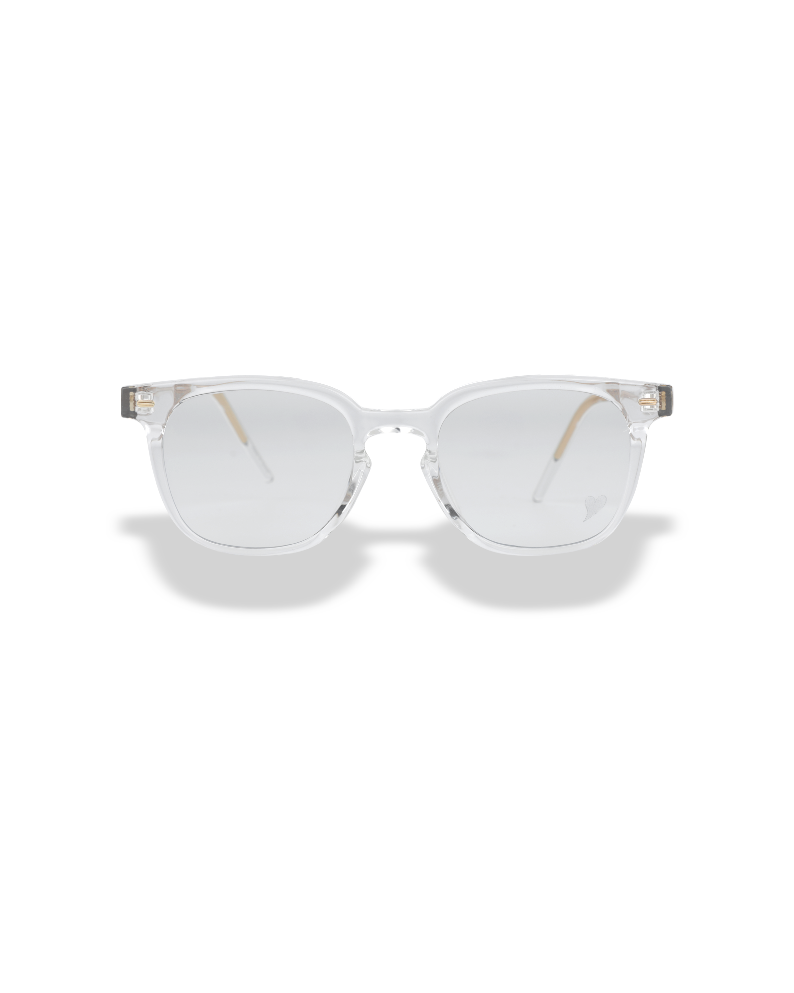 -Square-shaped glasses with a transparent polycarbonate frame.