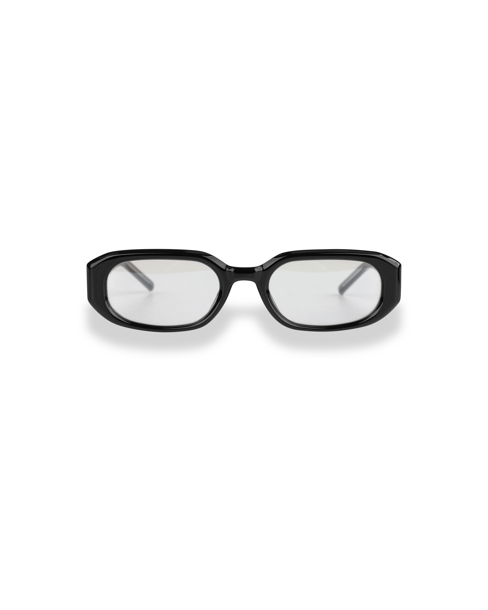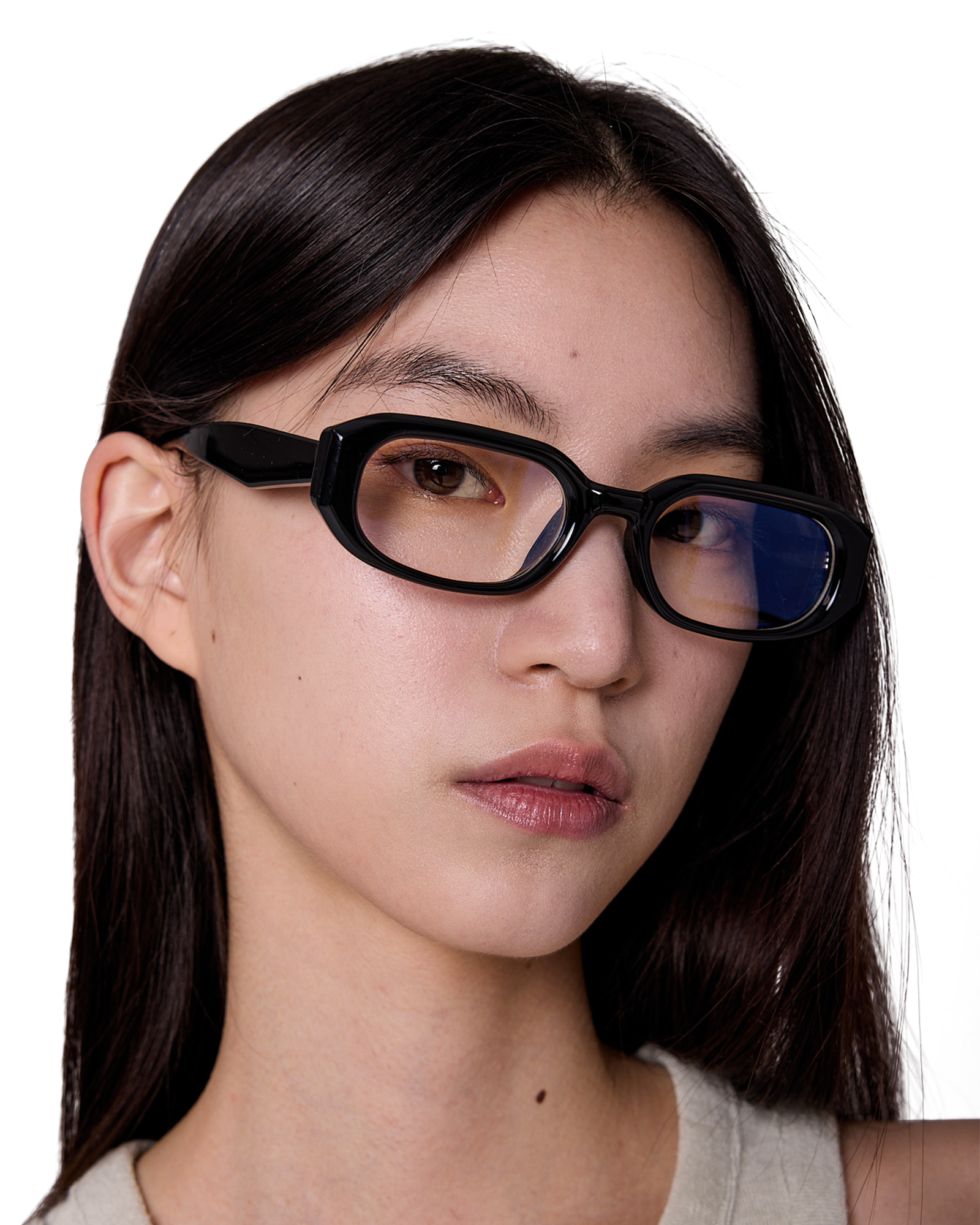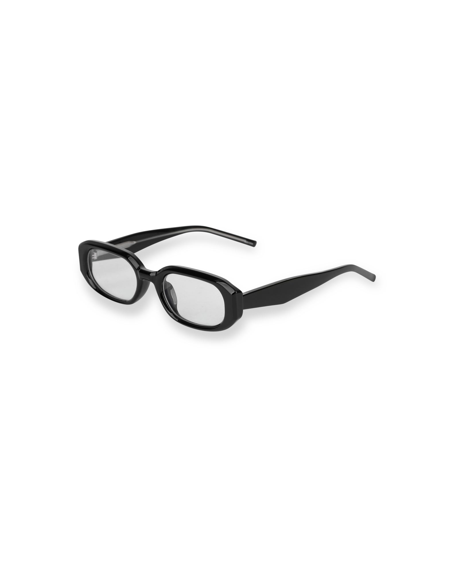 -Full-rim glasses with a black frame, designed with a narrow, rectangular silhouette.