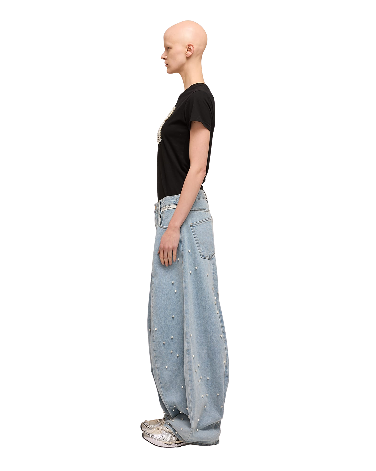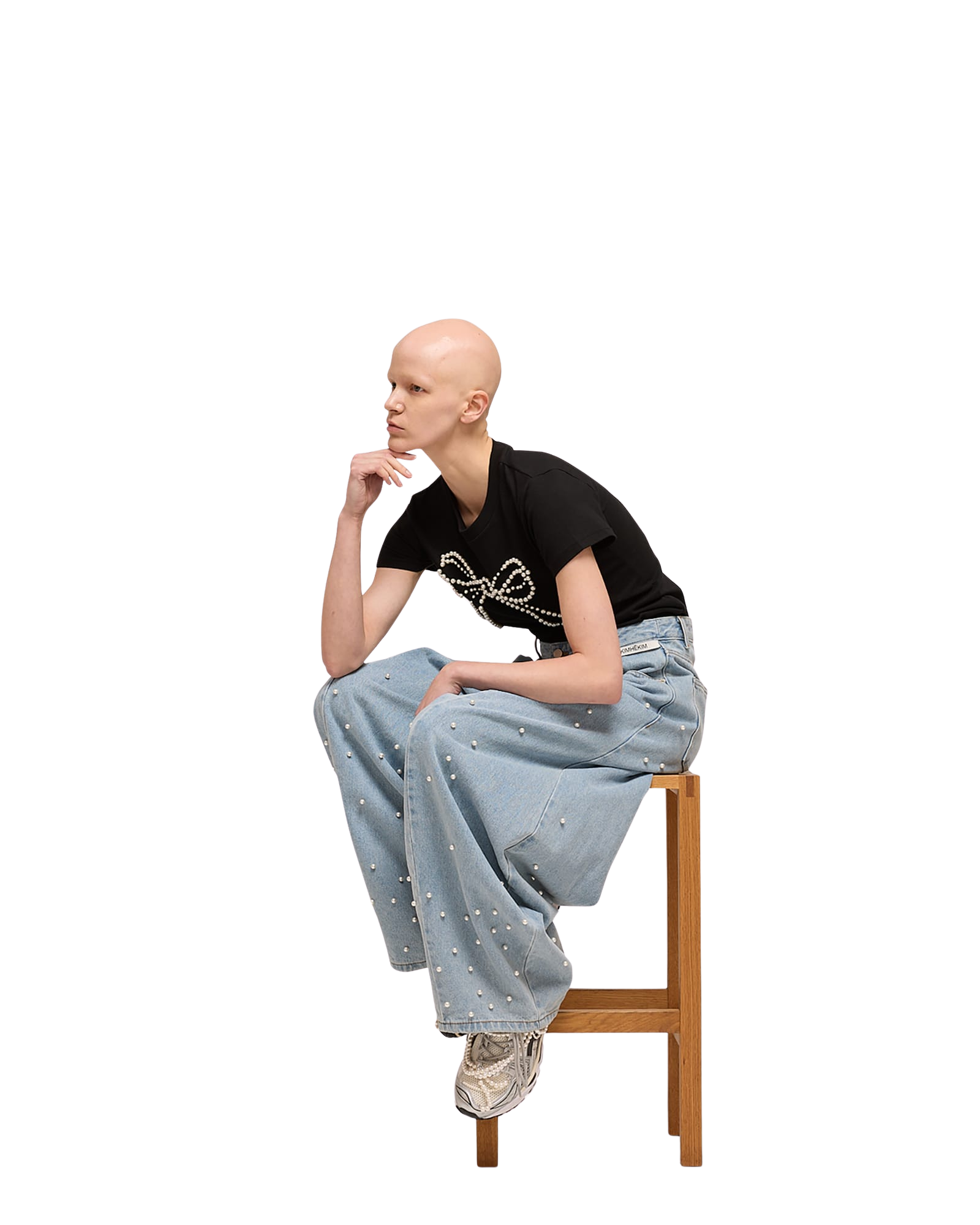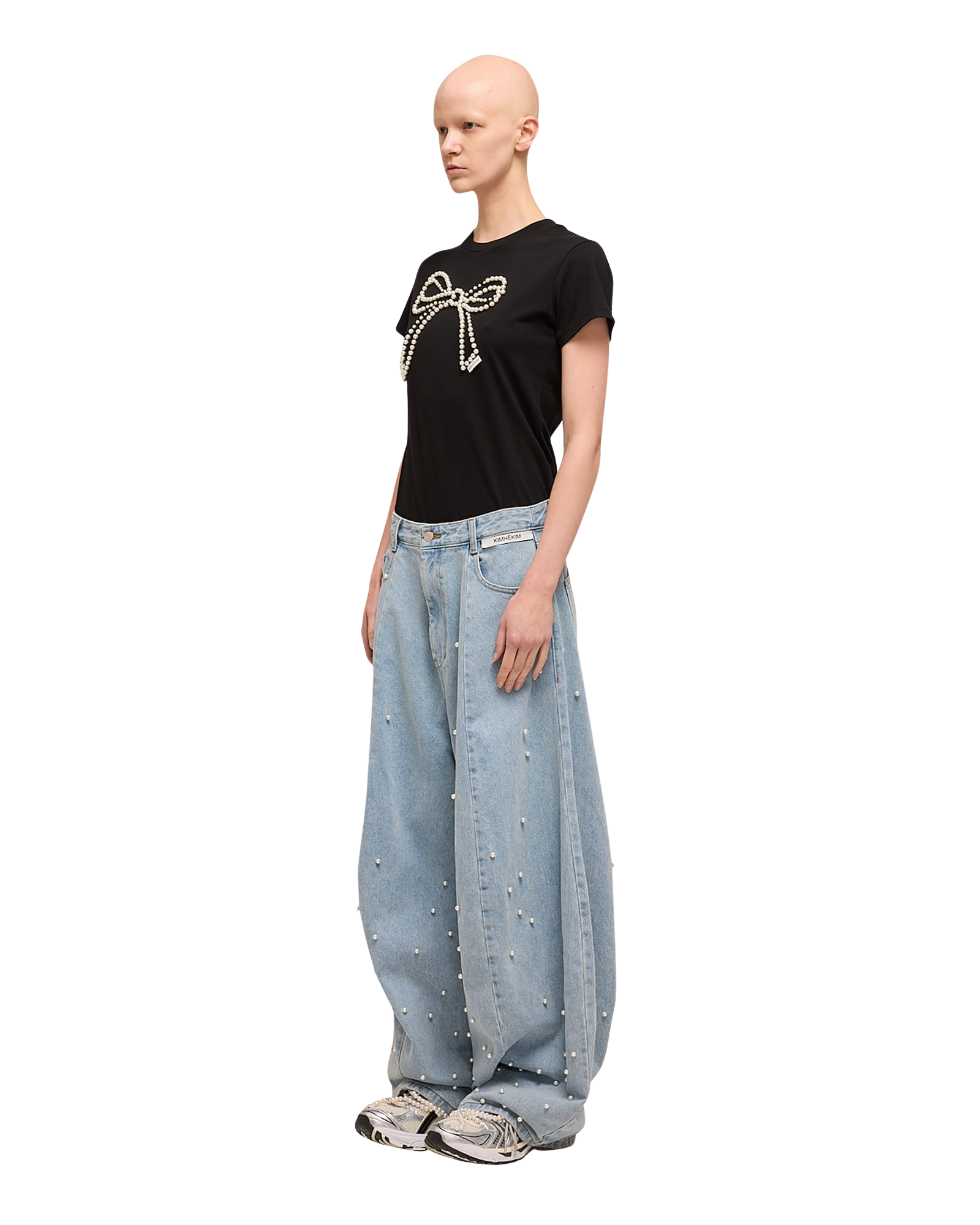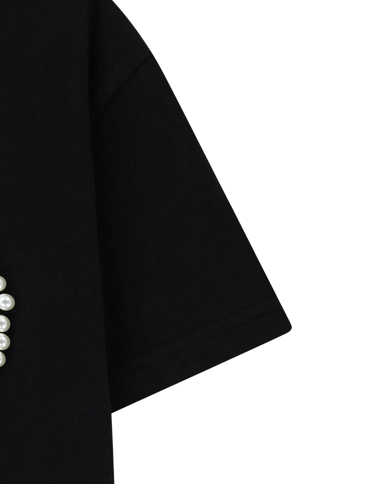 Pearl Embellished Bow Slim T-Shirt (Black)