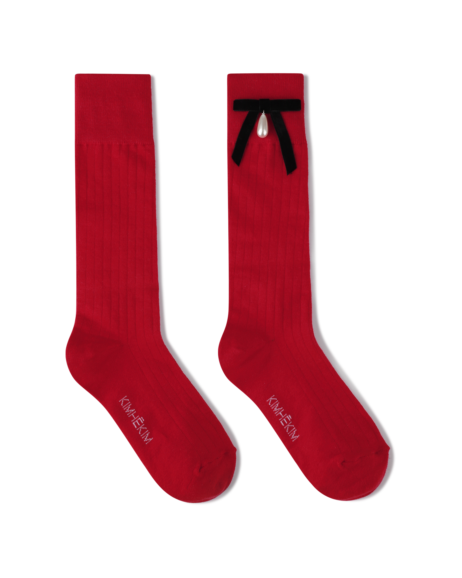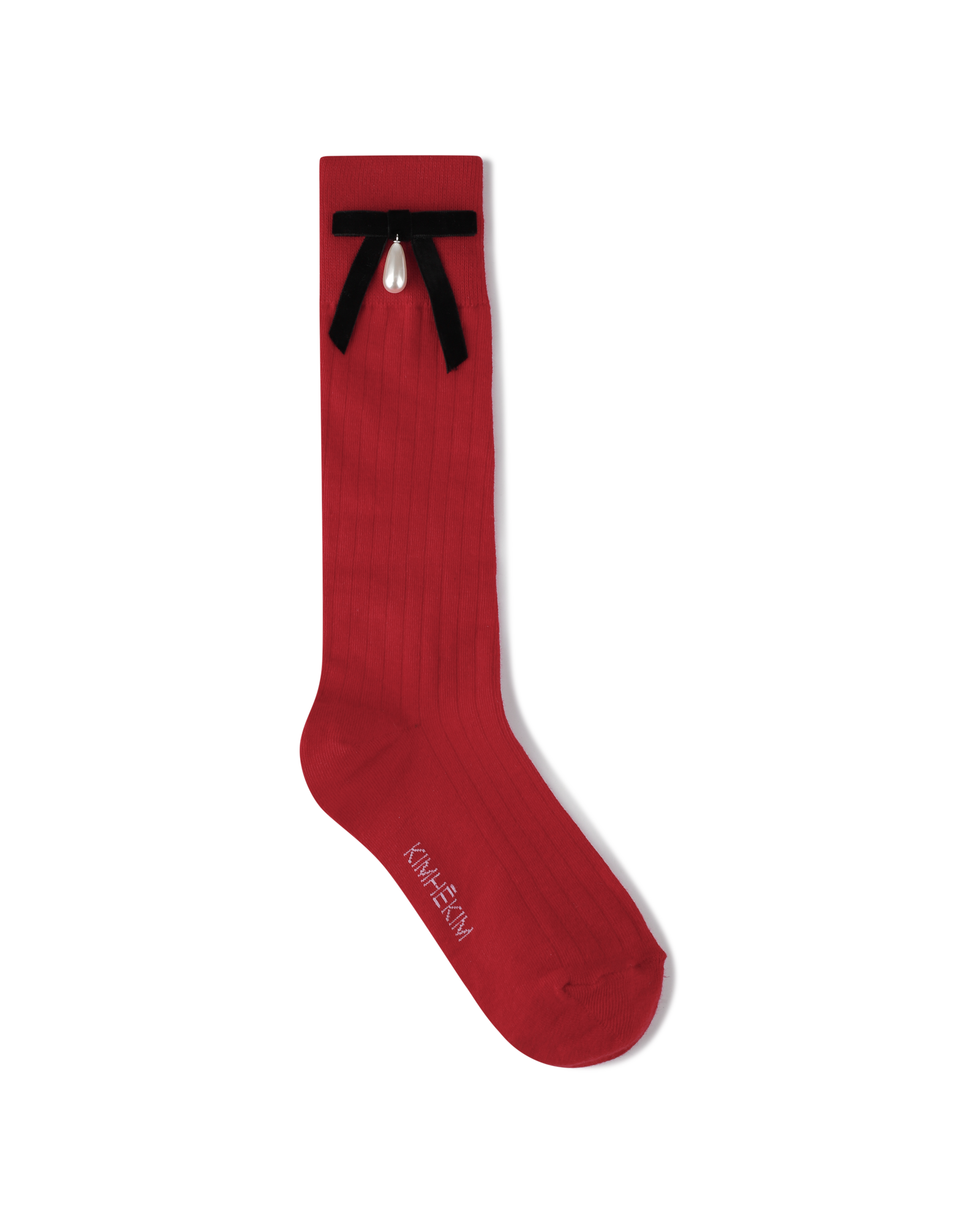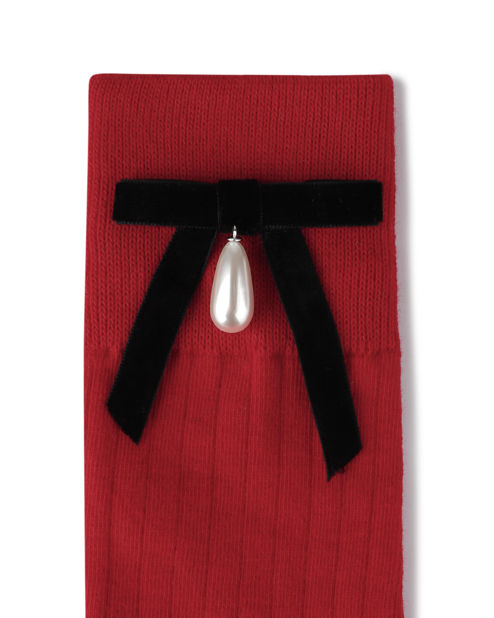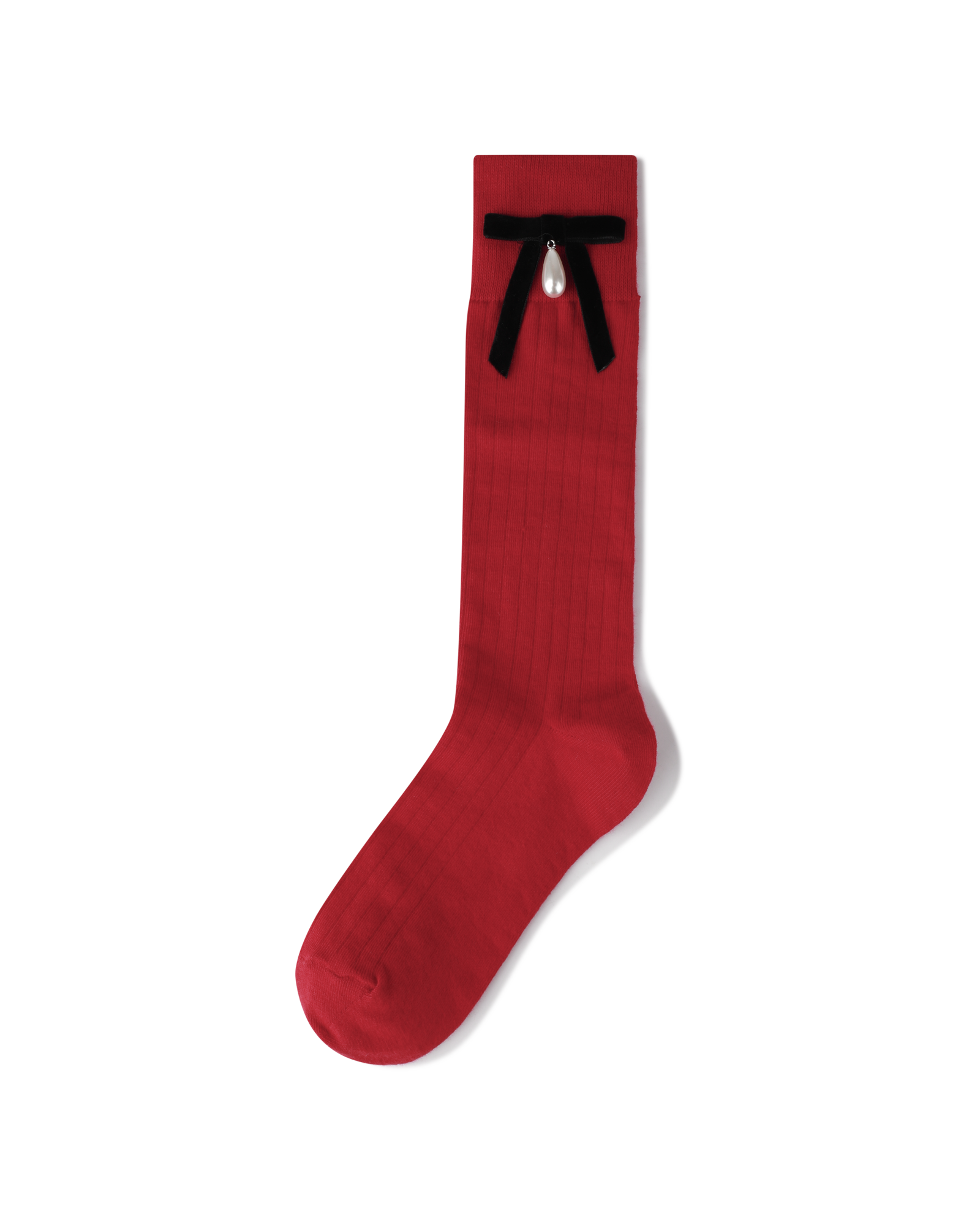 Pearl Ribbon Detail Cotton -Blended Knee-High Socks (Red)