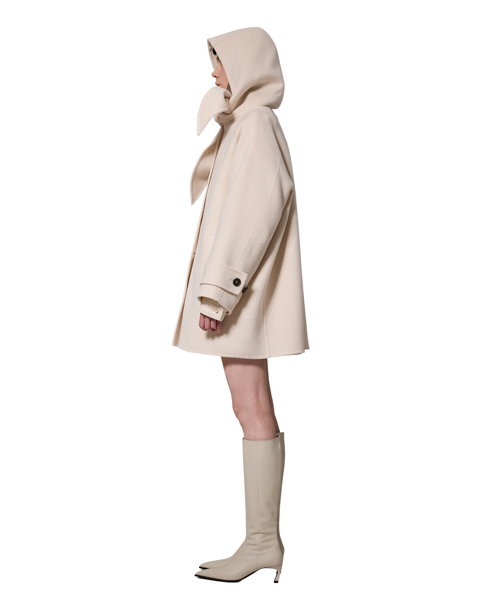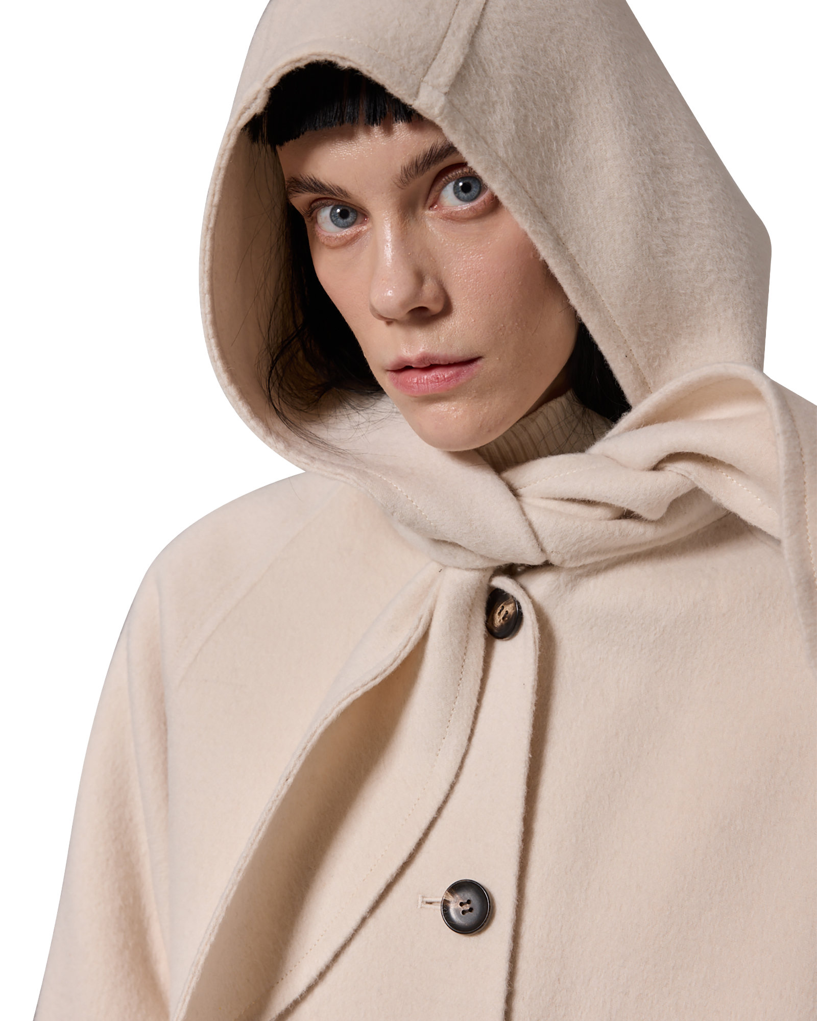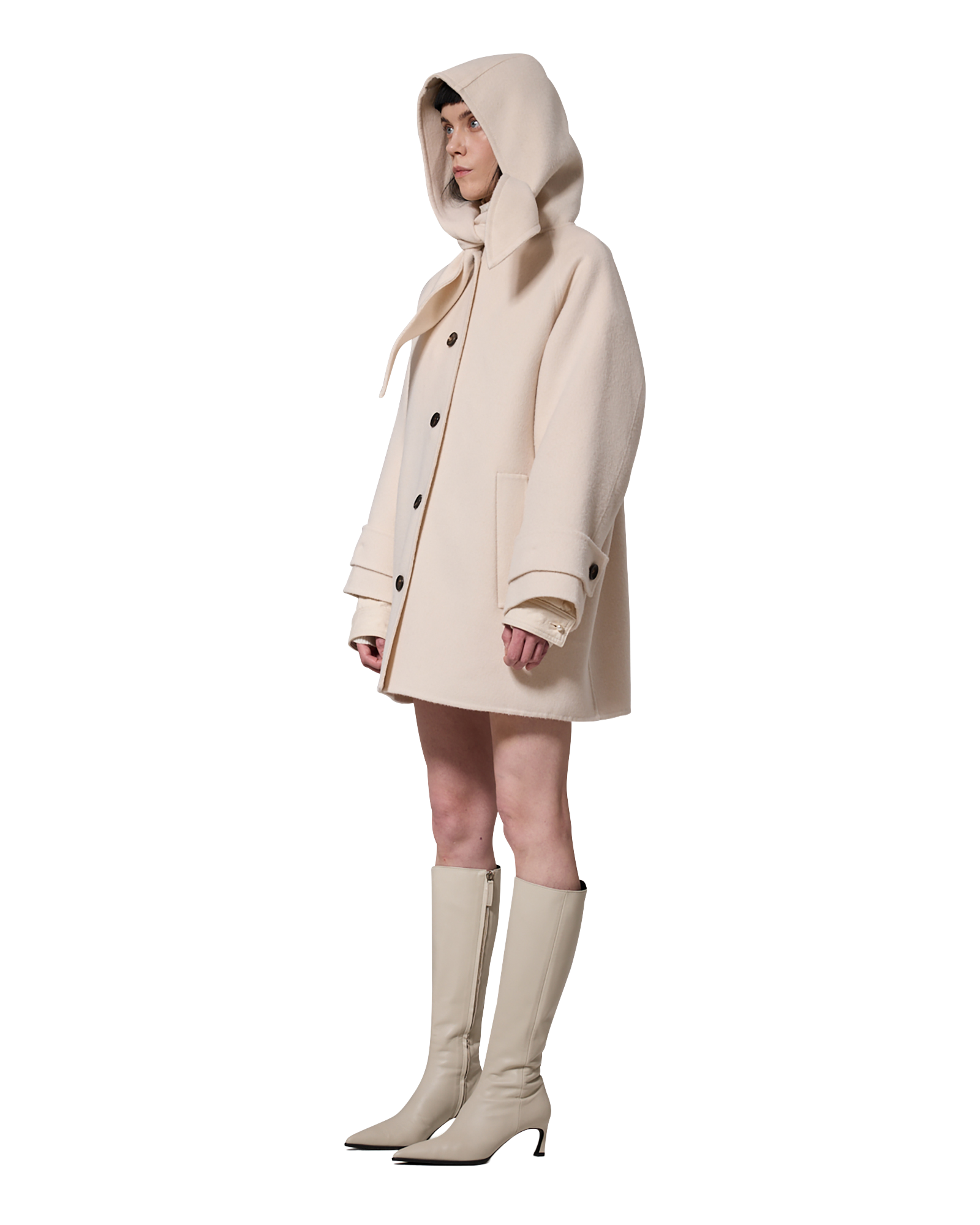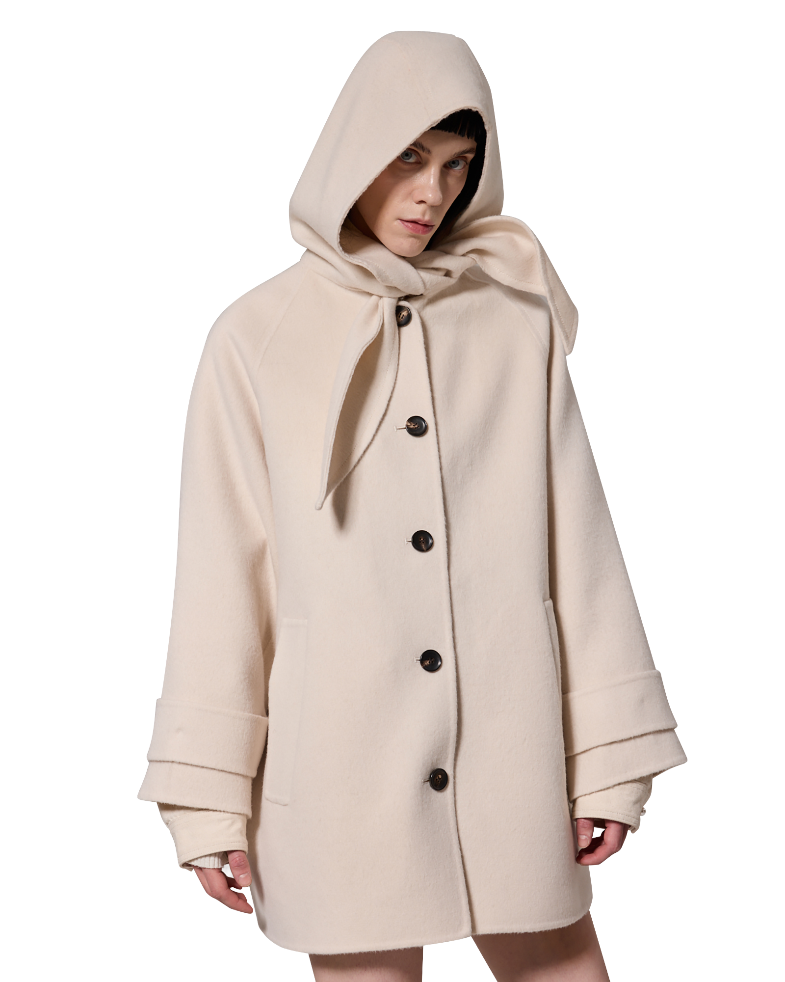 -A hooded short coat inspired by “Little Red Riding Hood,” made from a wool-alpaca blend fabric.
