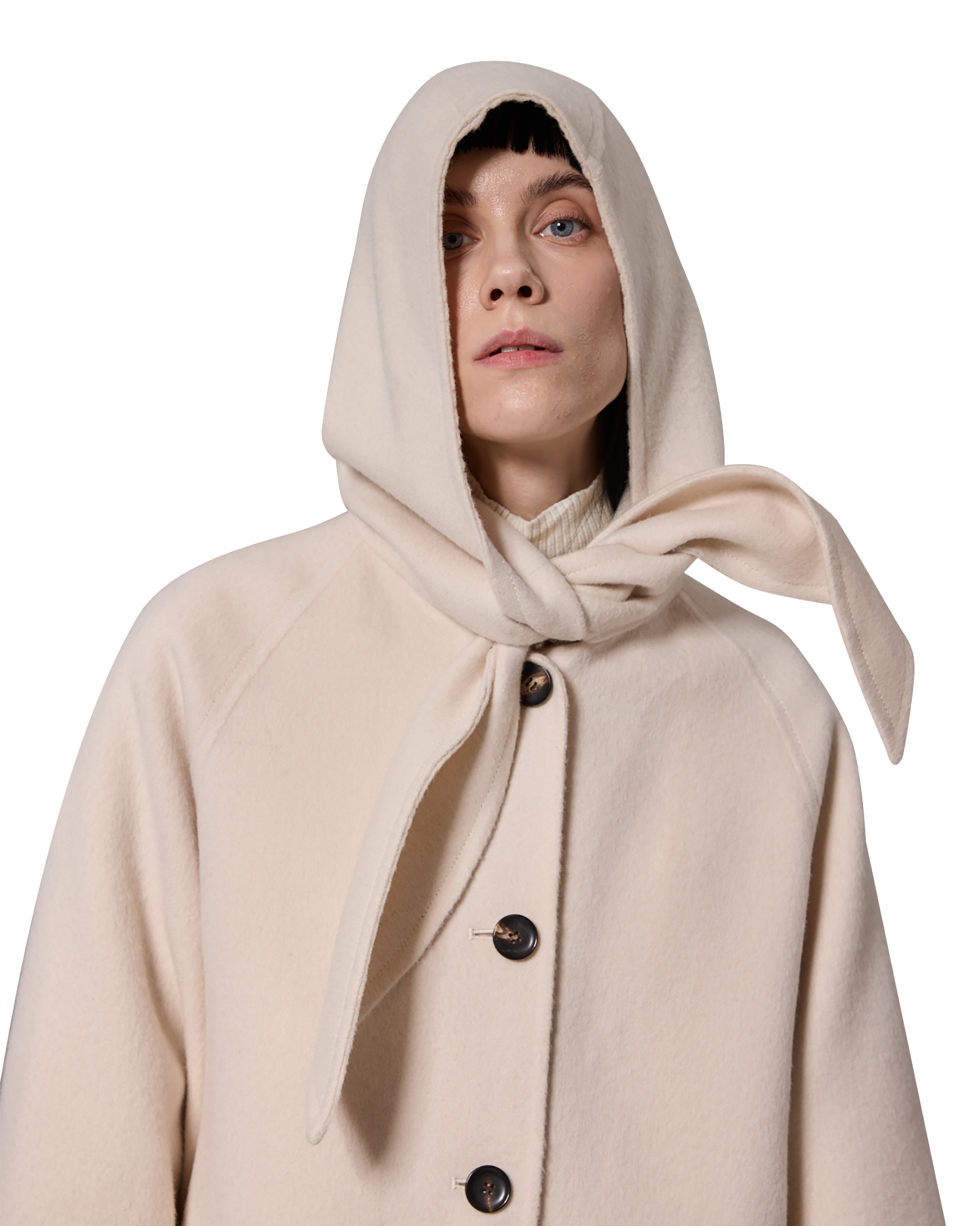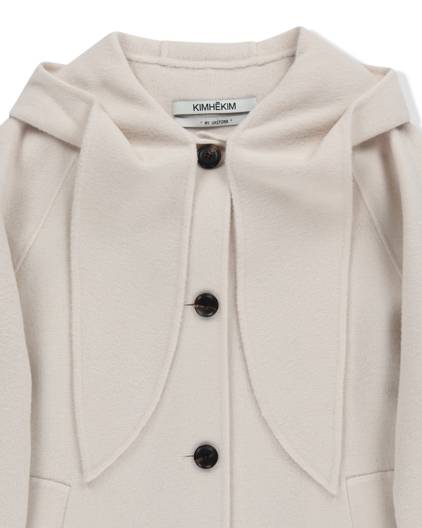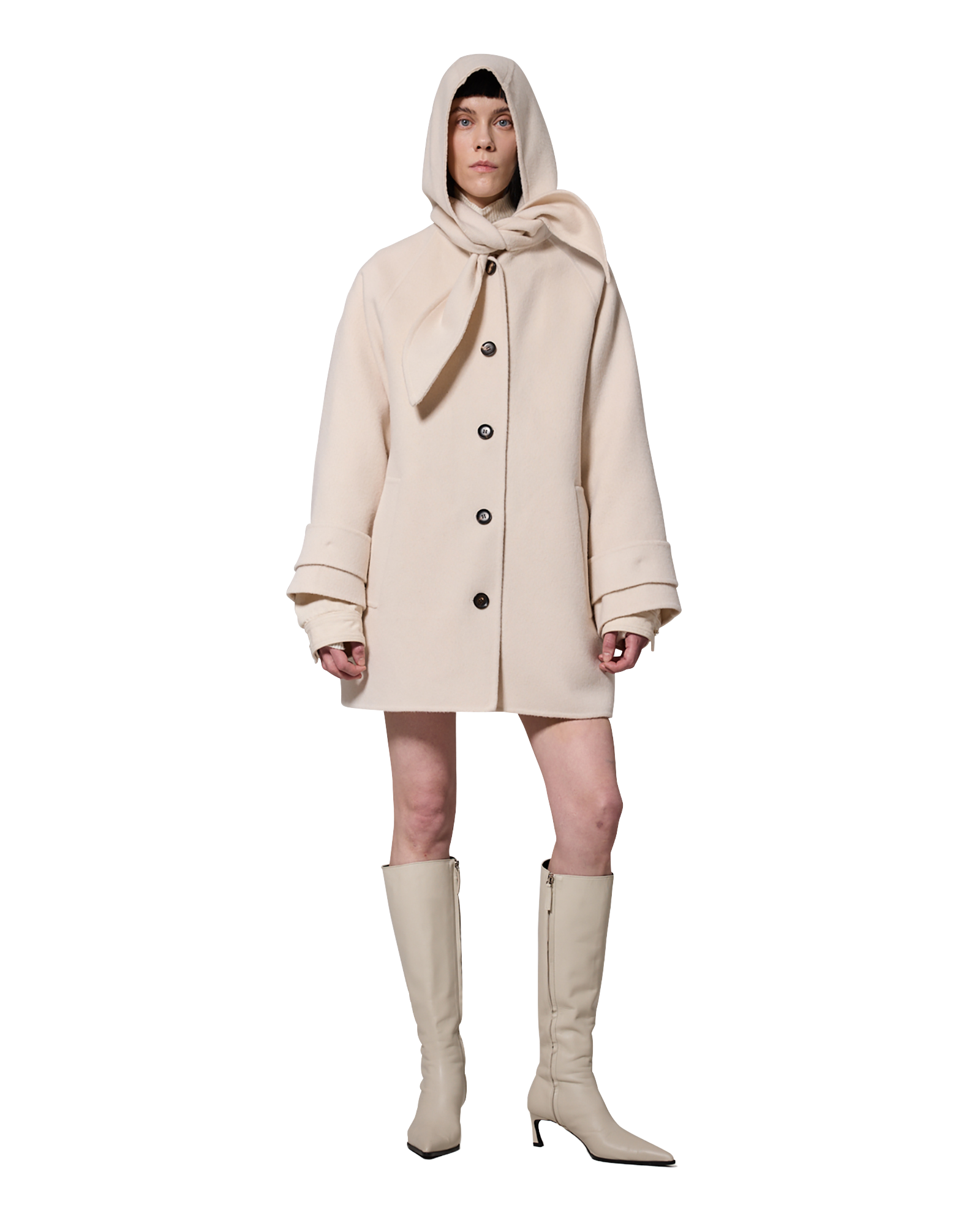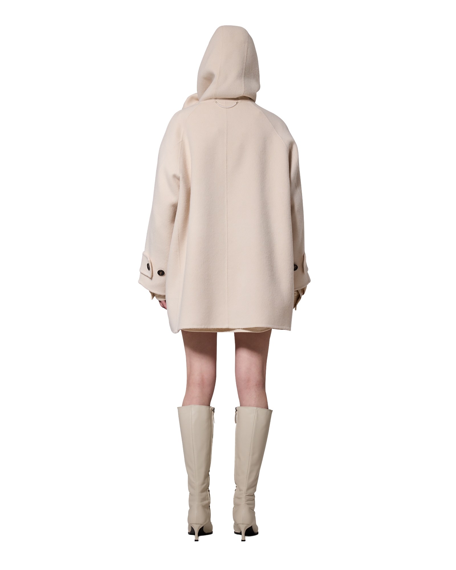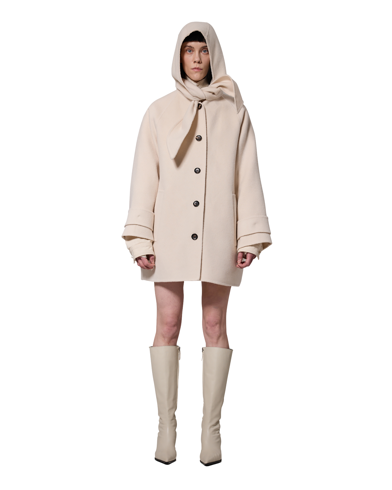 -A hooded short coat inspired by “Little Red Riding Hood,” made from a wool-alpaca blend fabric.