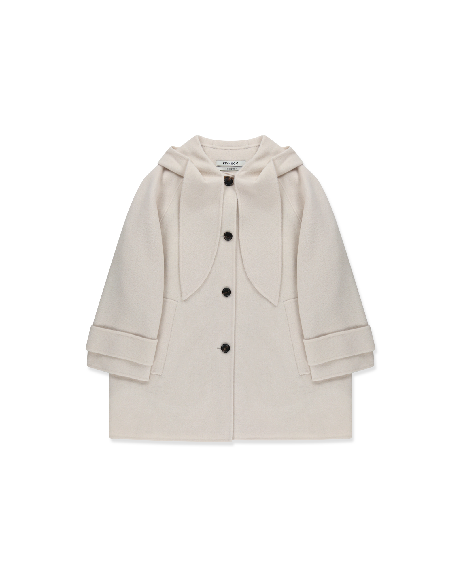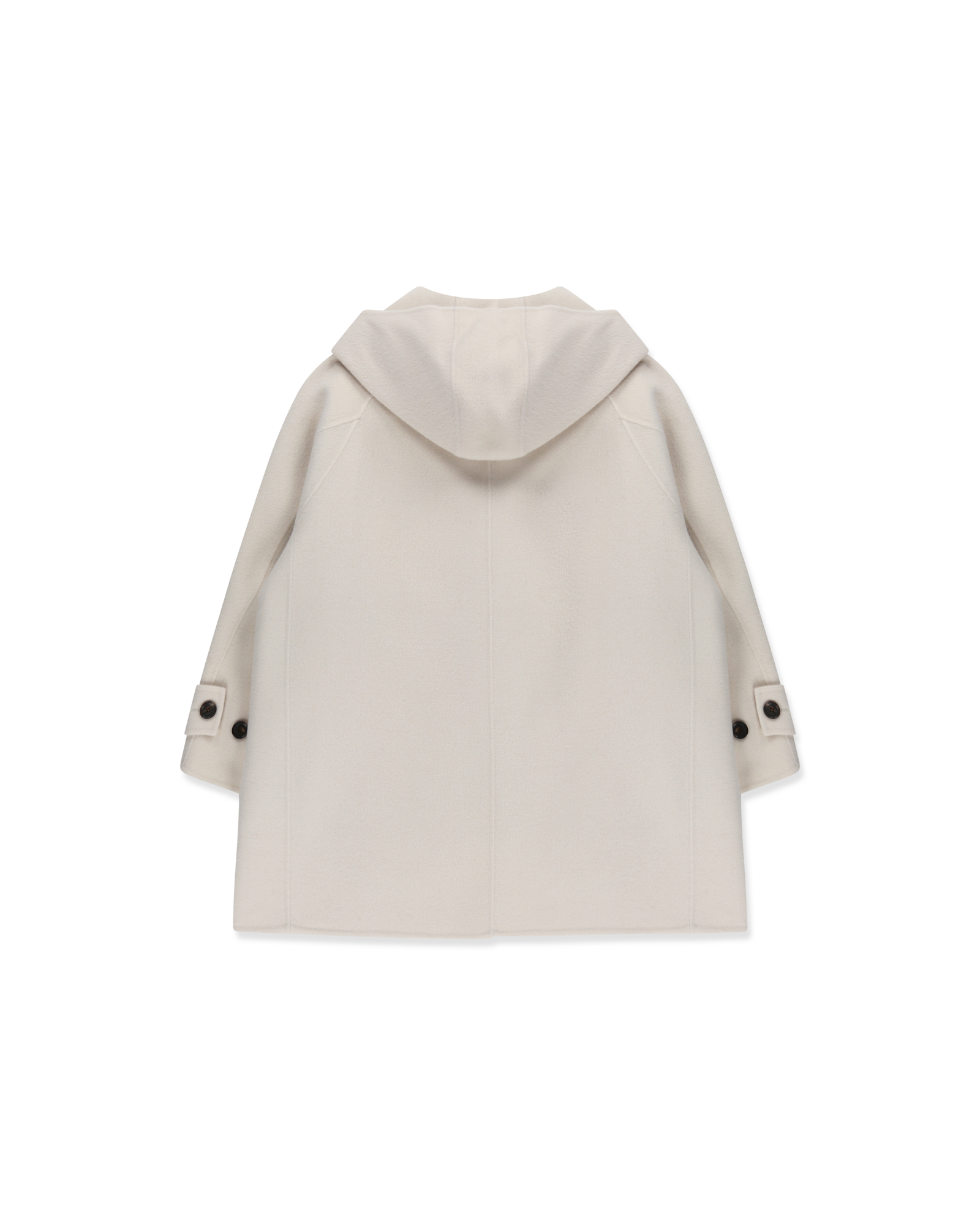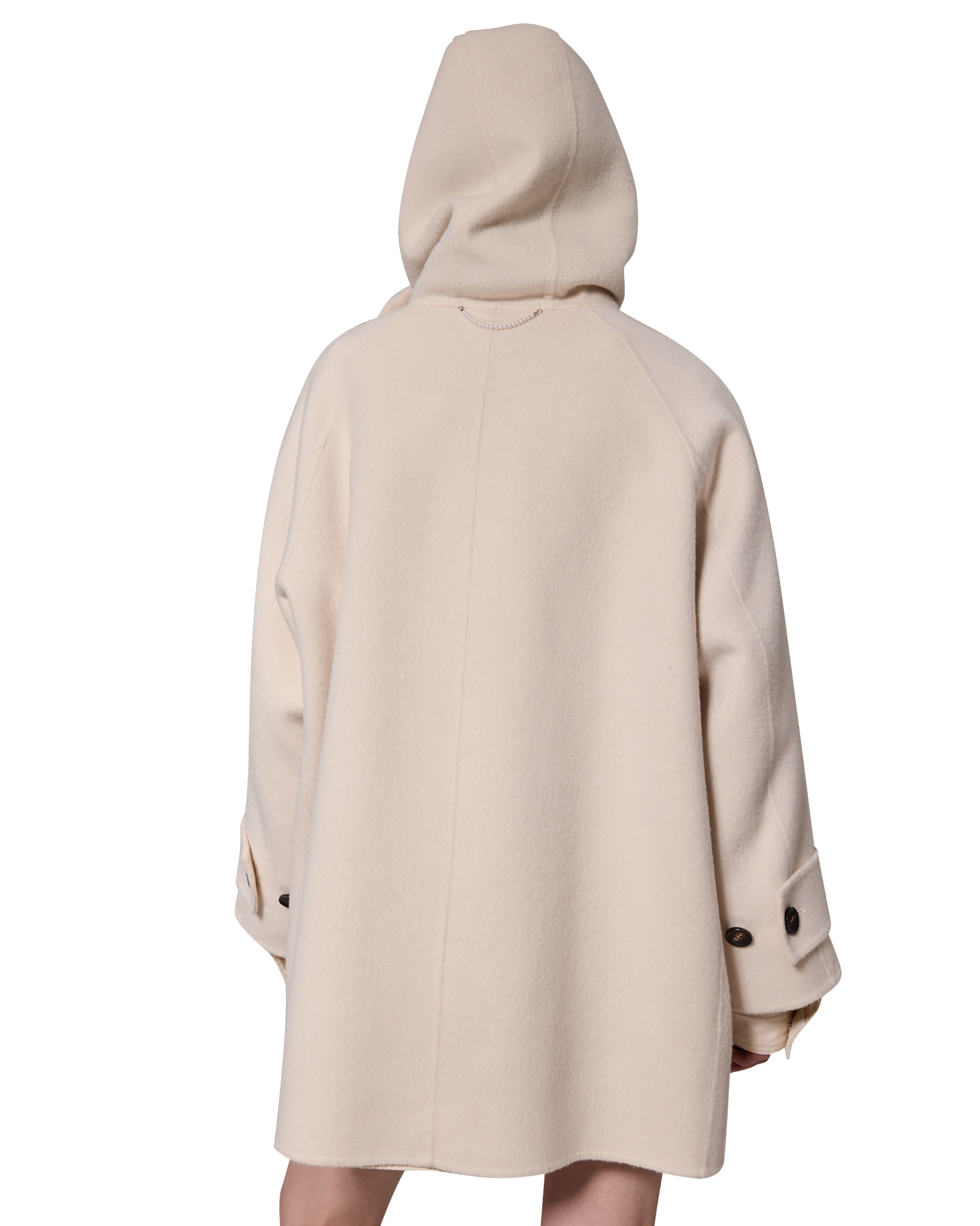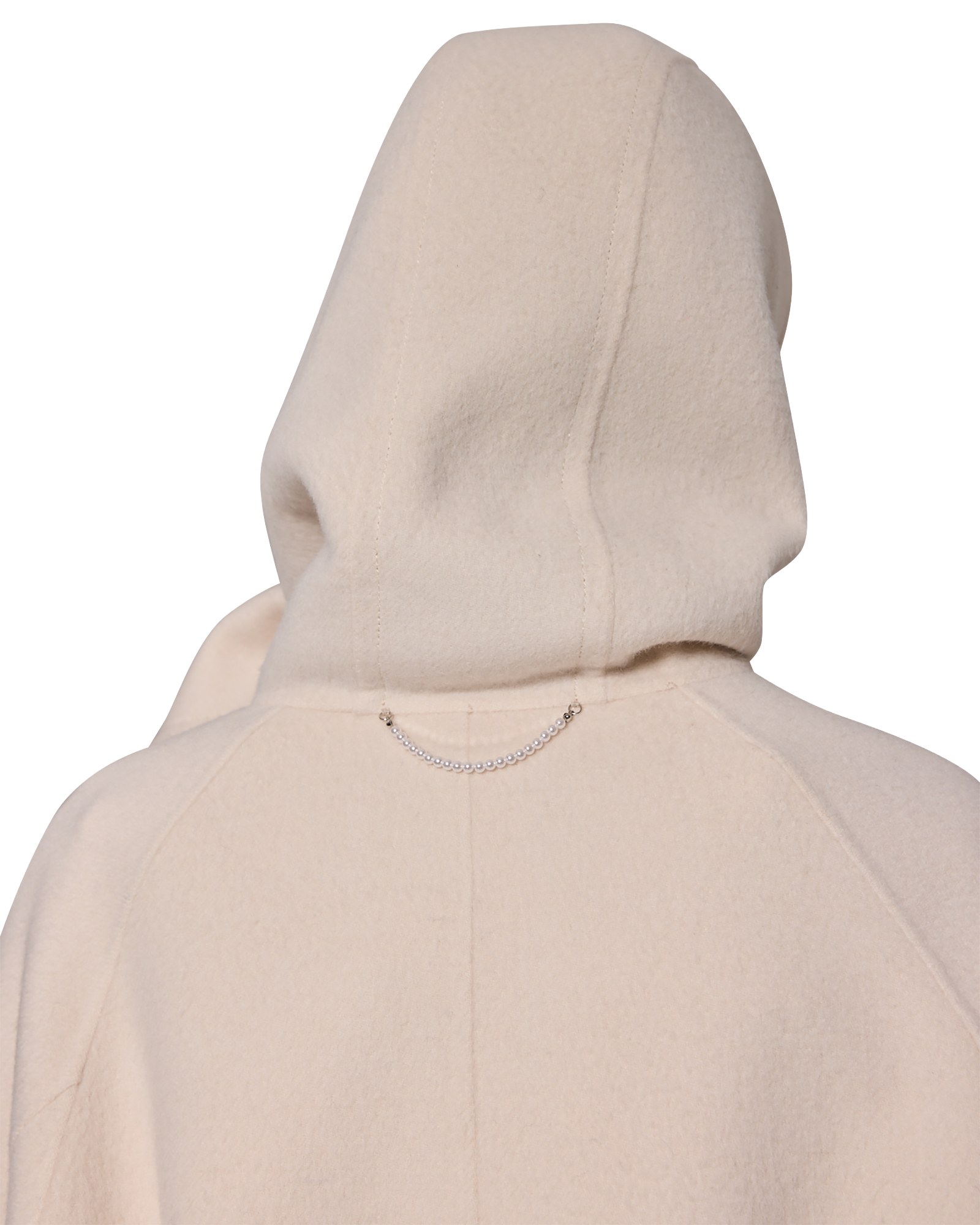 -A hooded short coat inspired by “Little Red Riding Hood,” made from a wool-alpaca blend fabric.