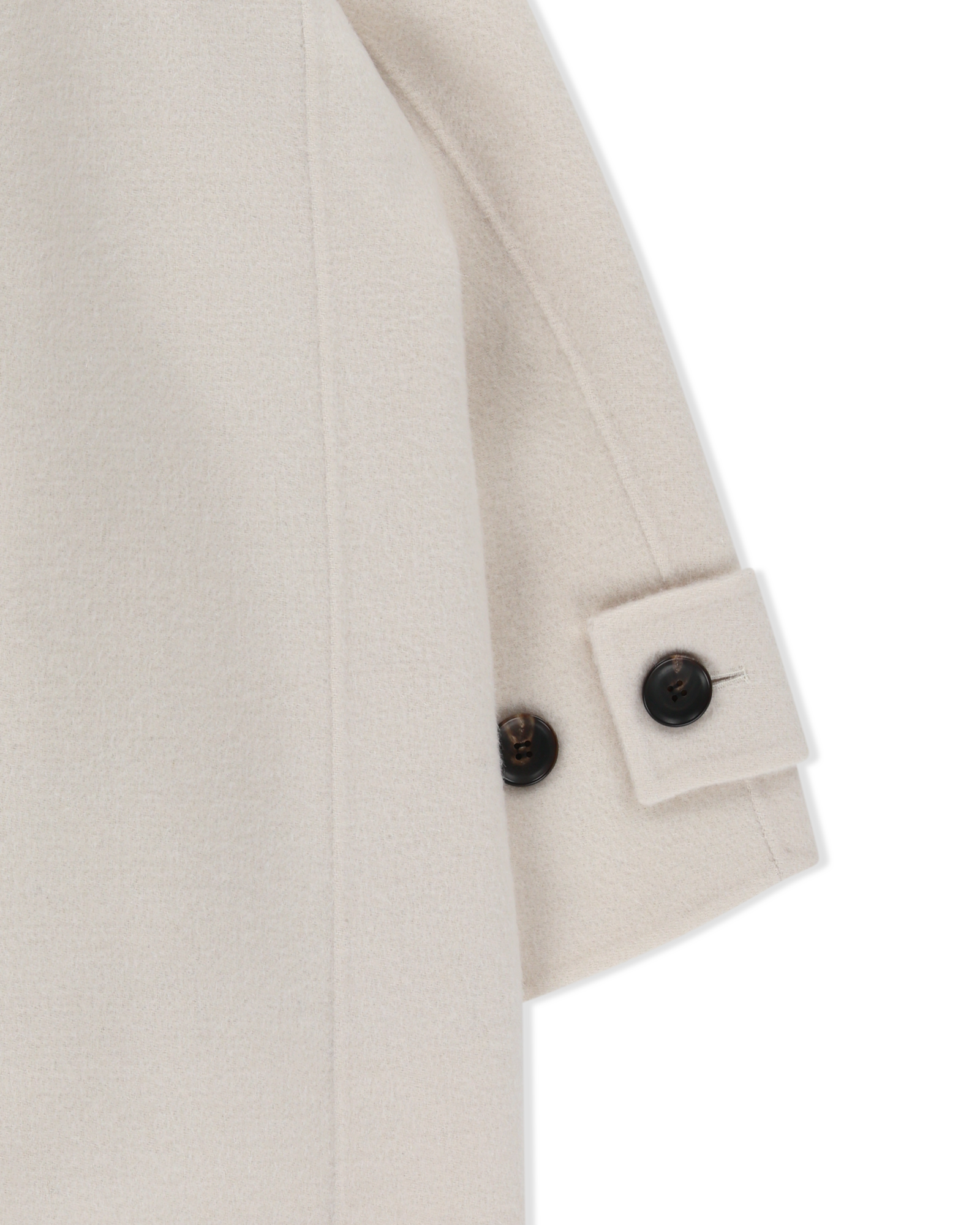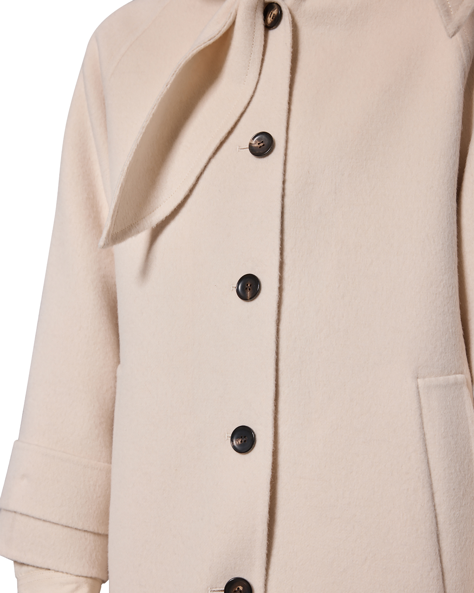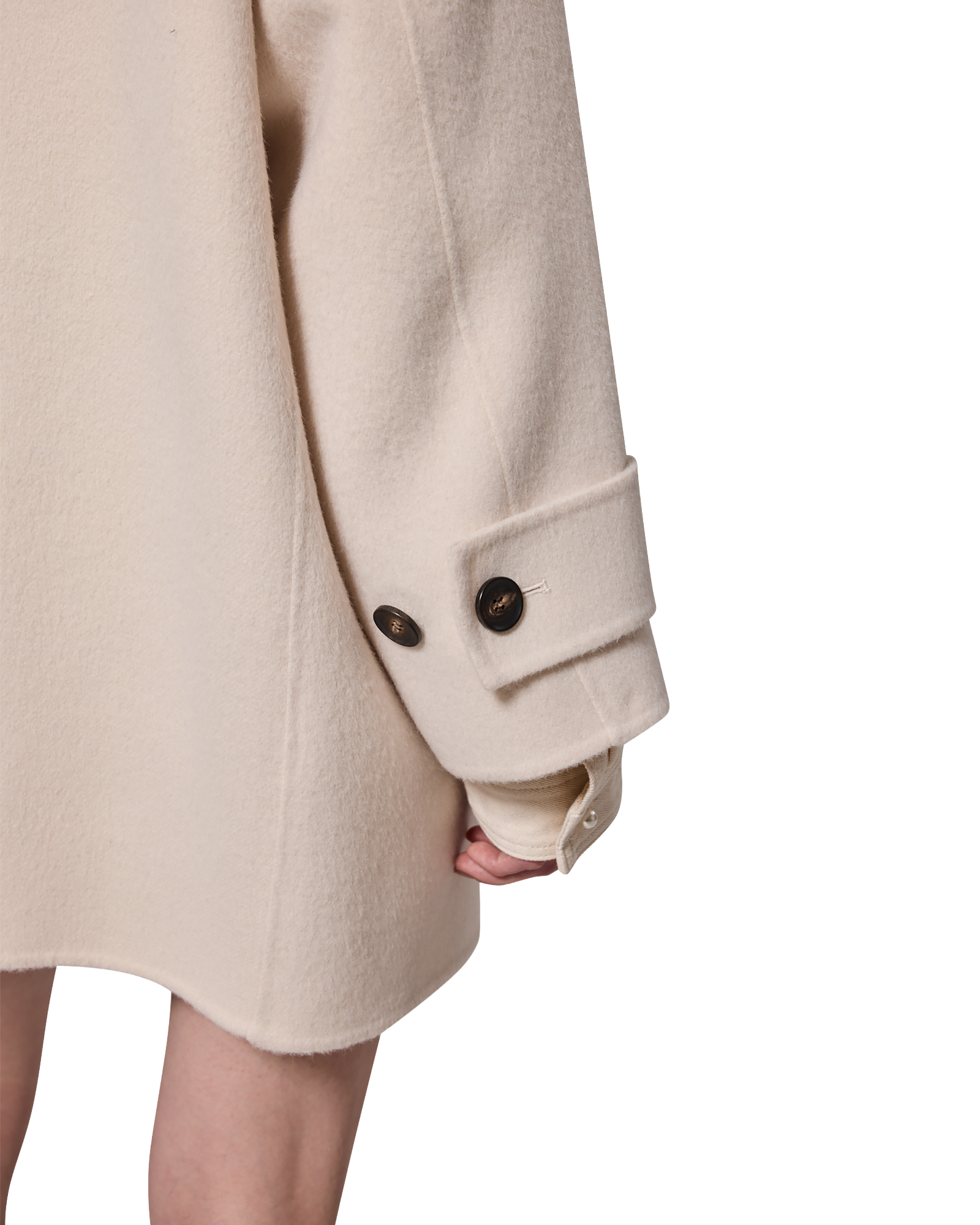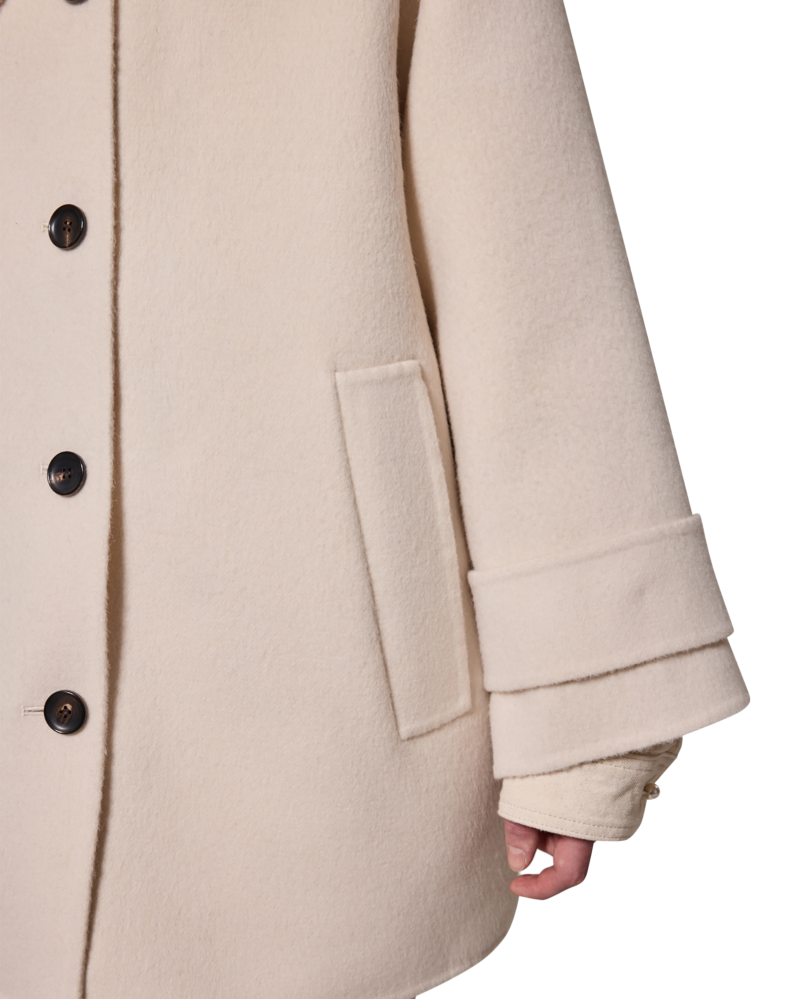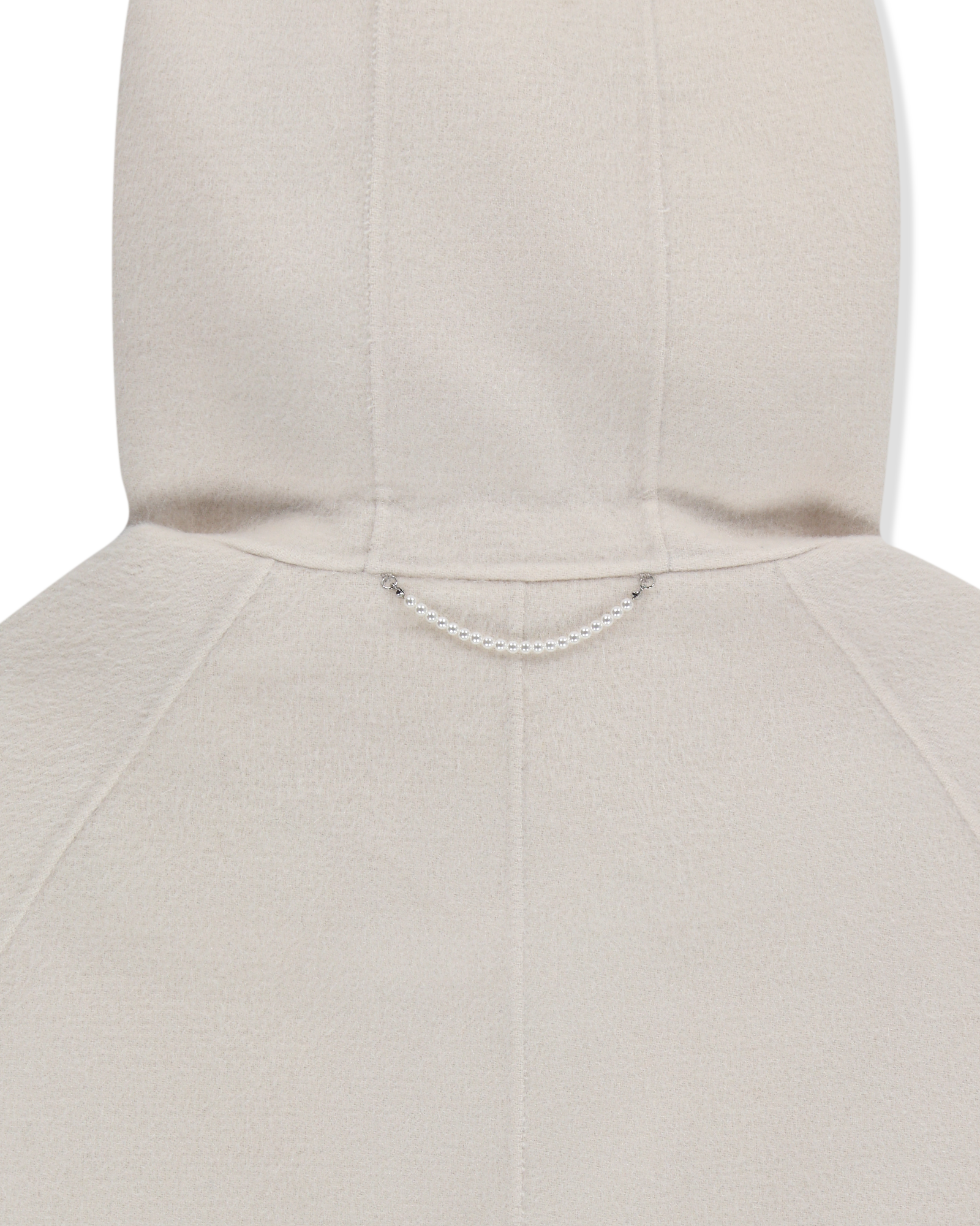 -A hooded short coat inspired by “Little Red Riding Hood,” made from a wool-alpaca blend fabric.