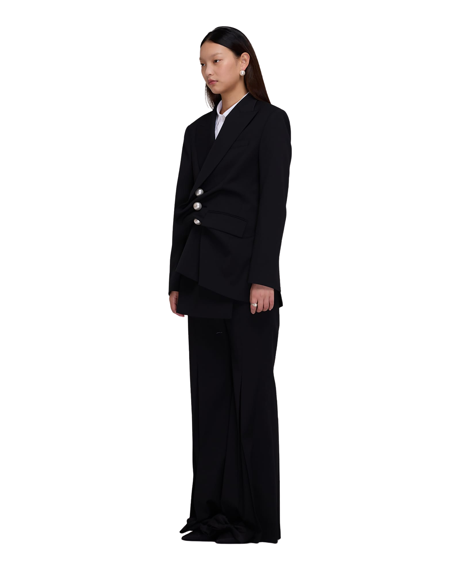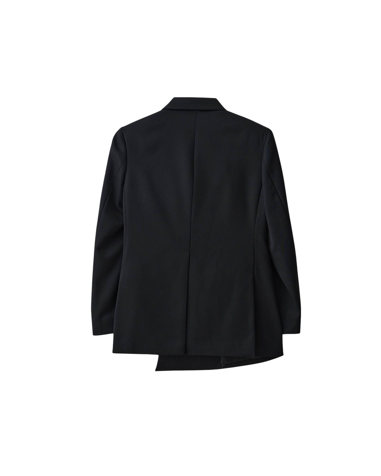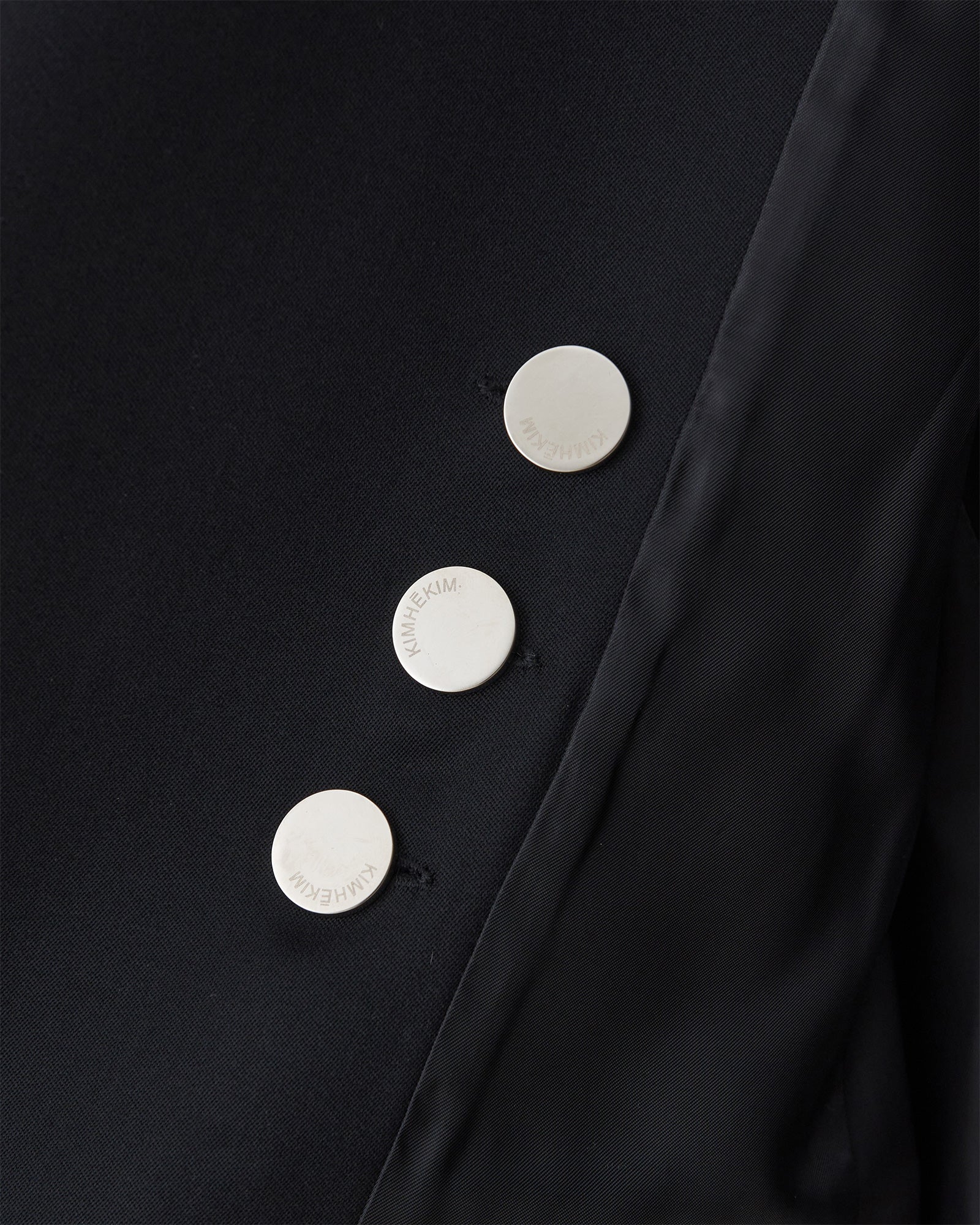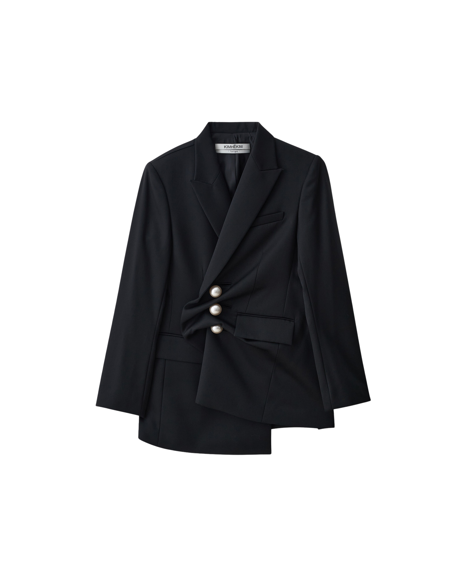 It's tailored for a slightly loose fit and shows draped asymmetric construction when it's closed with pearl buttons.