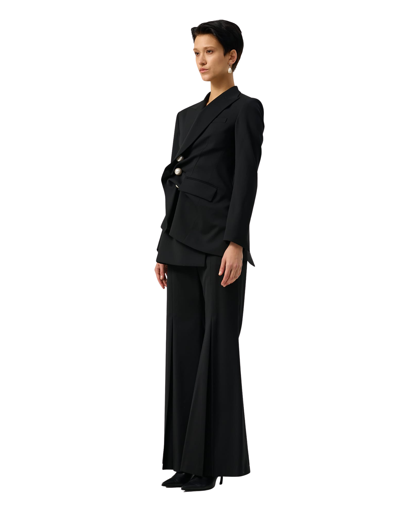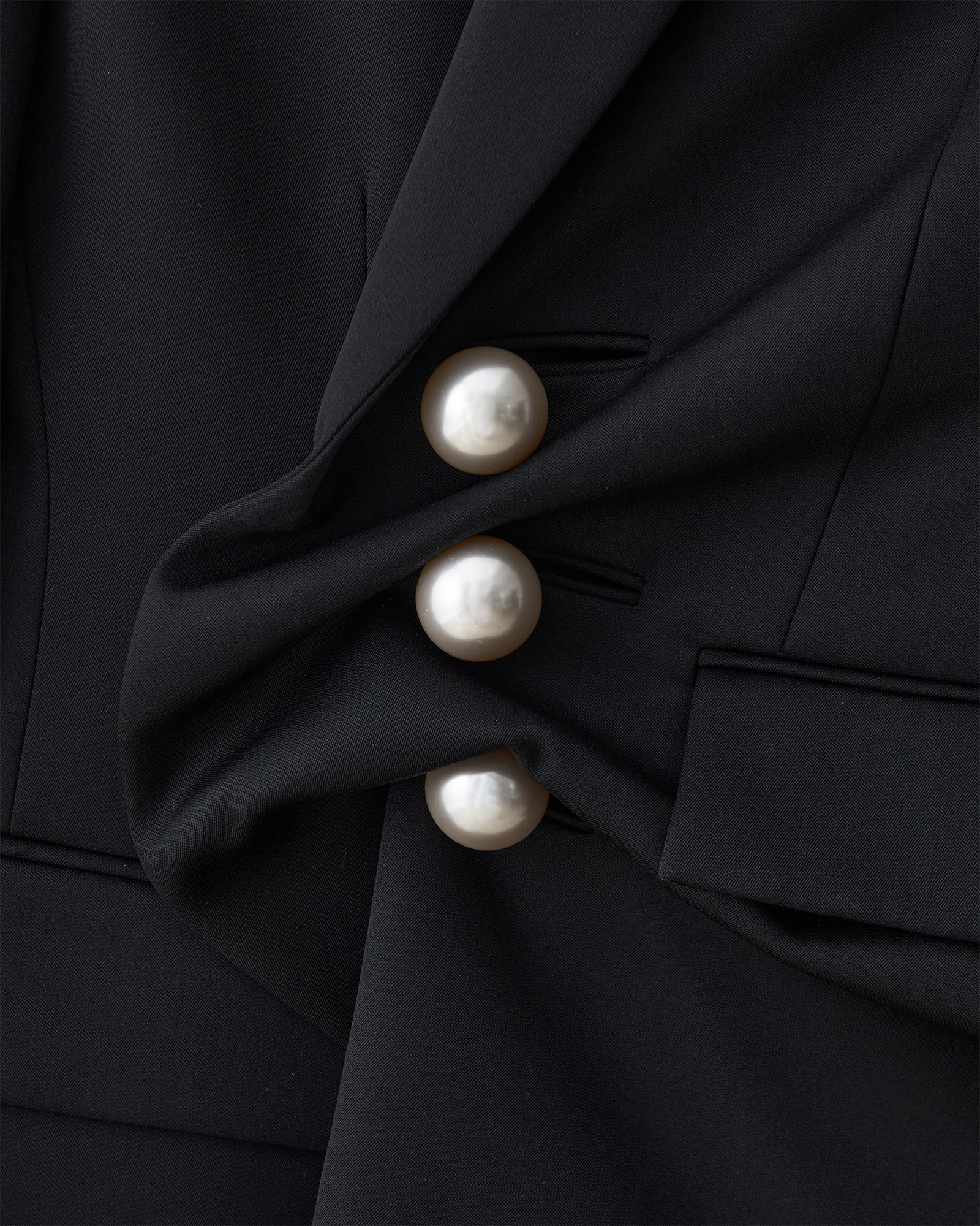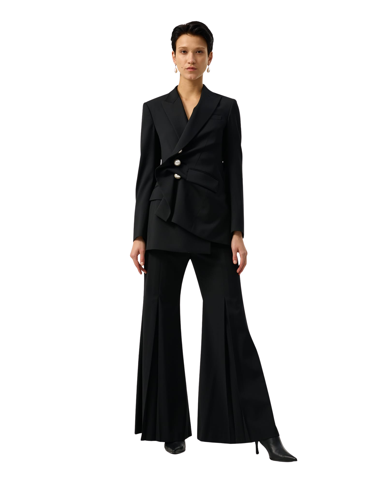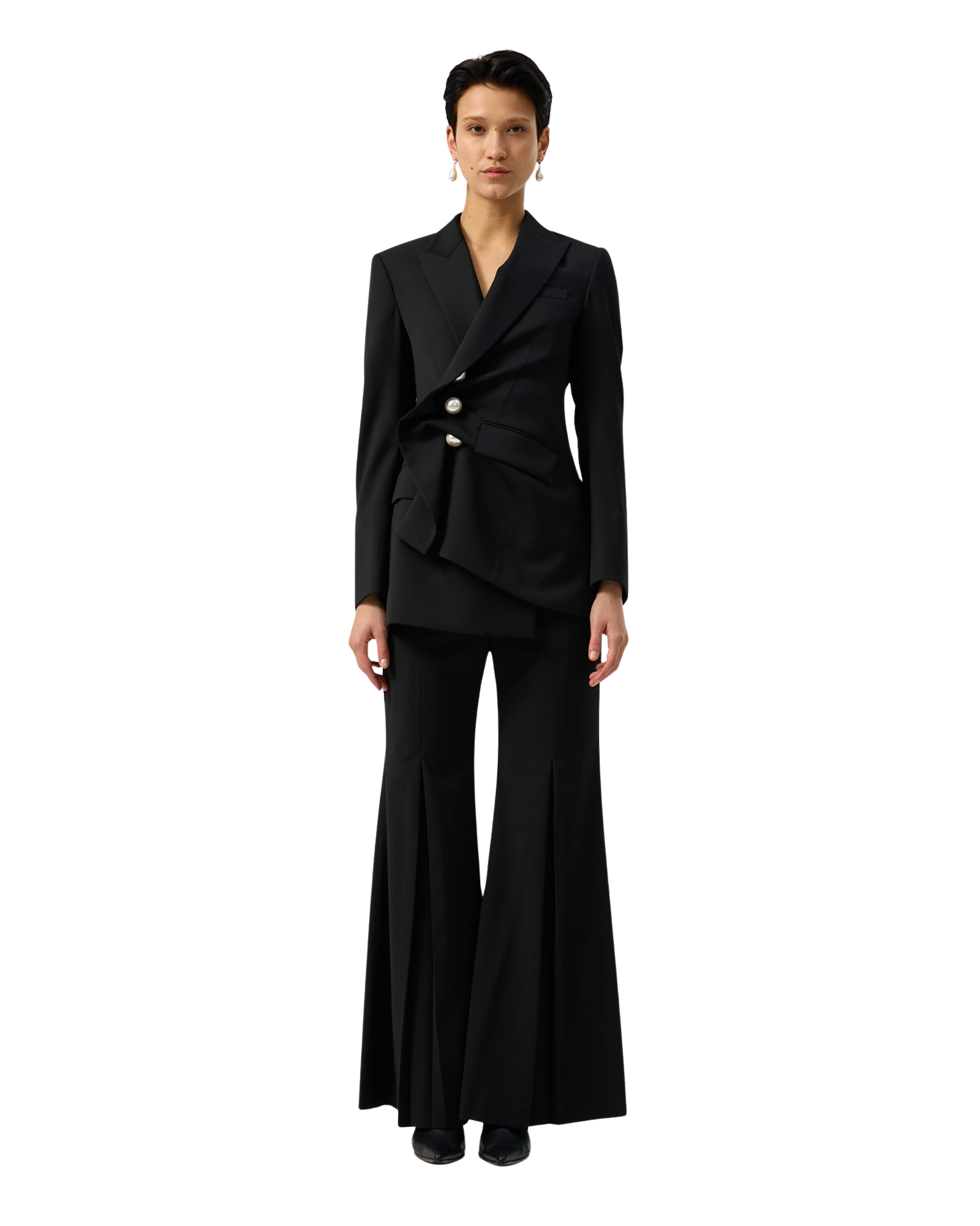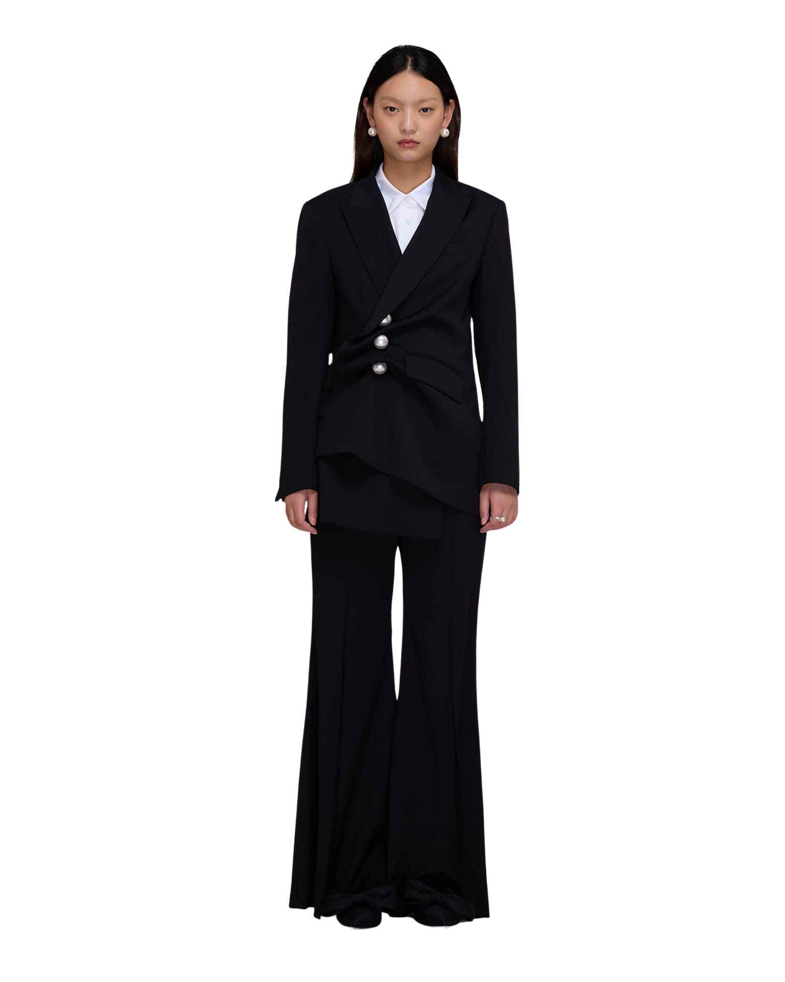 It's tailored for a slightly loose fit and shows draped asymmetric construction when it's closed with pearl buttons.