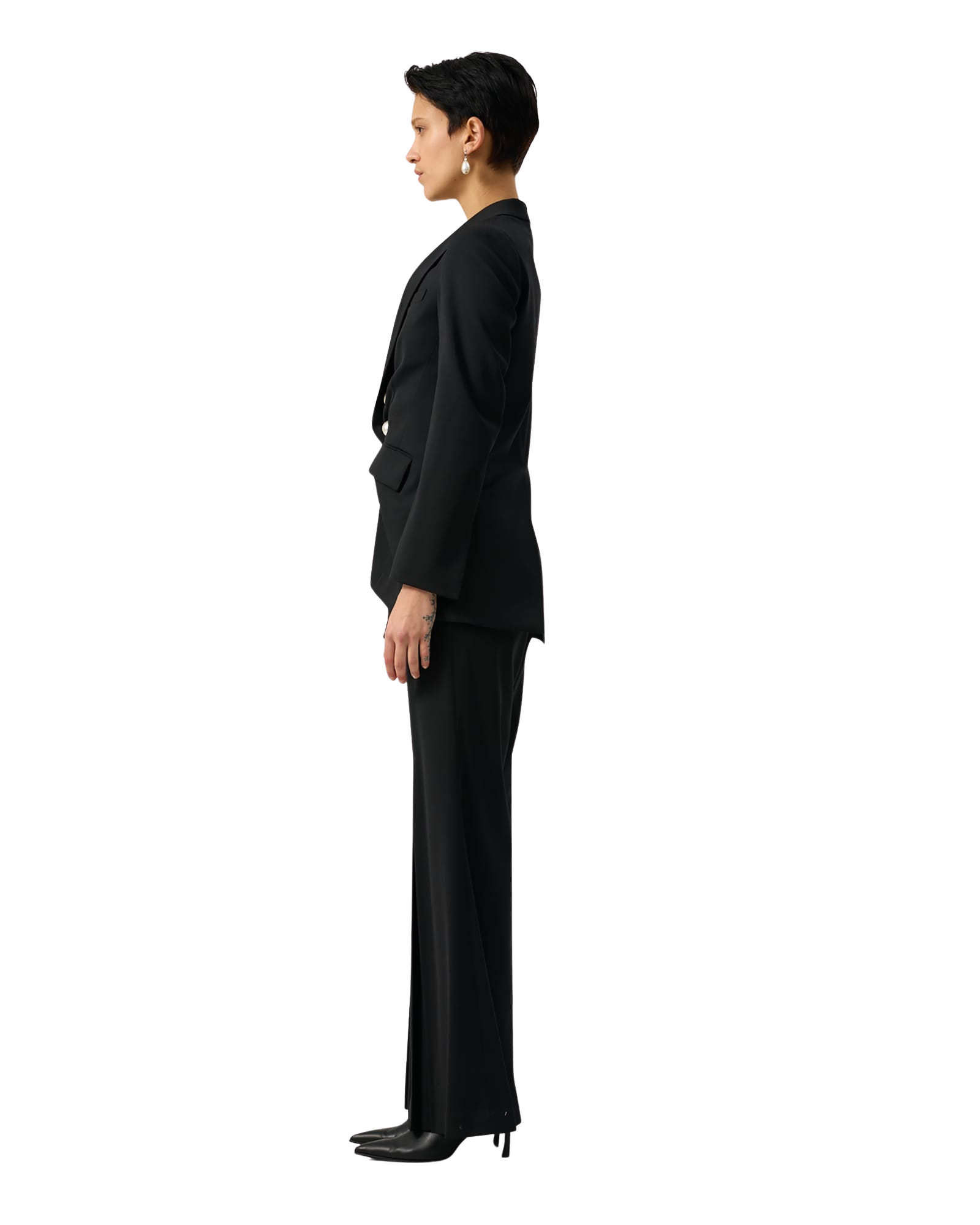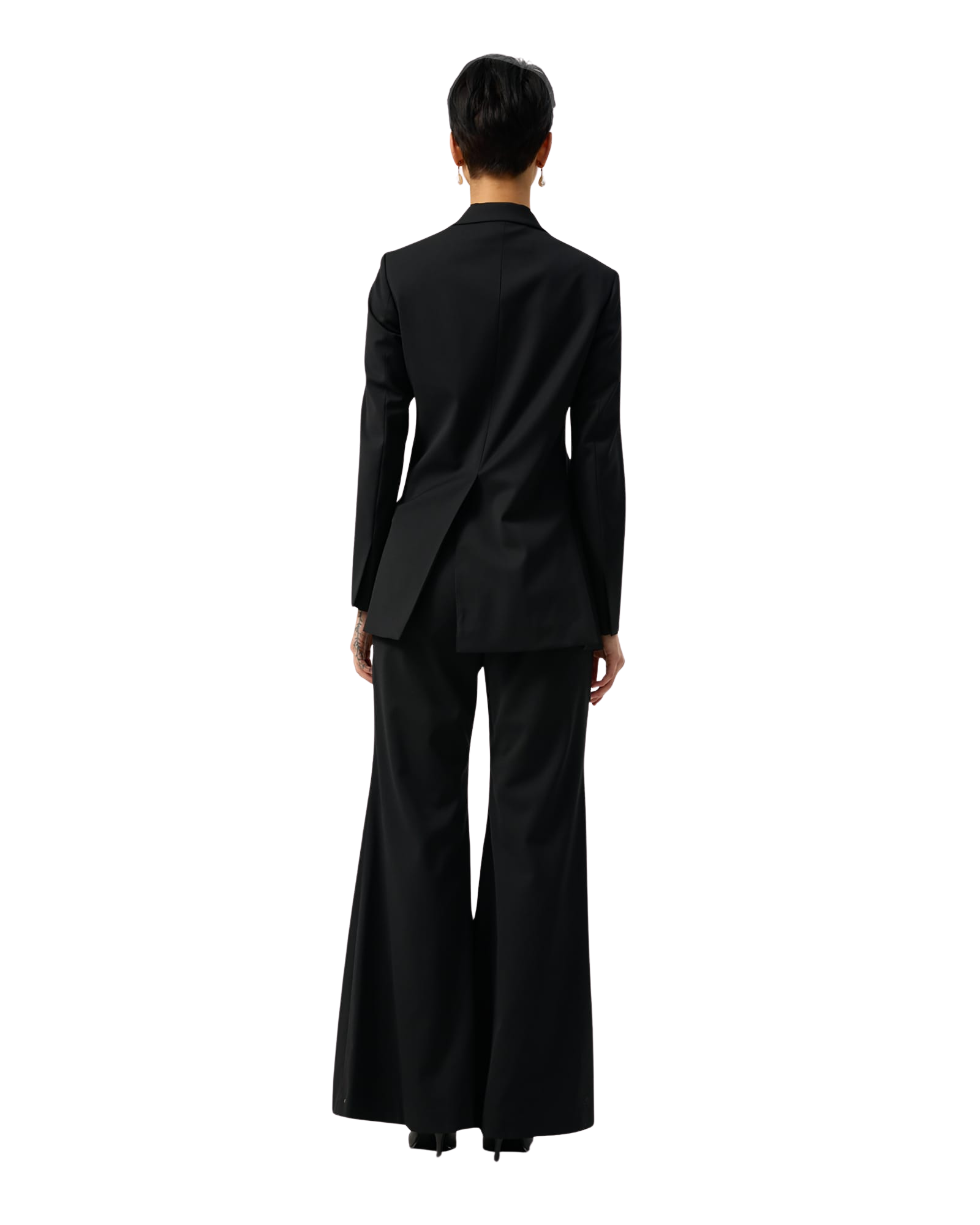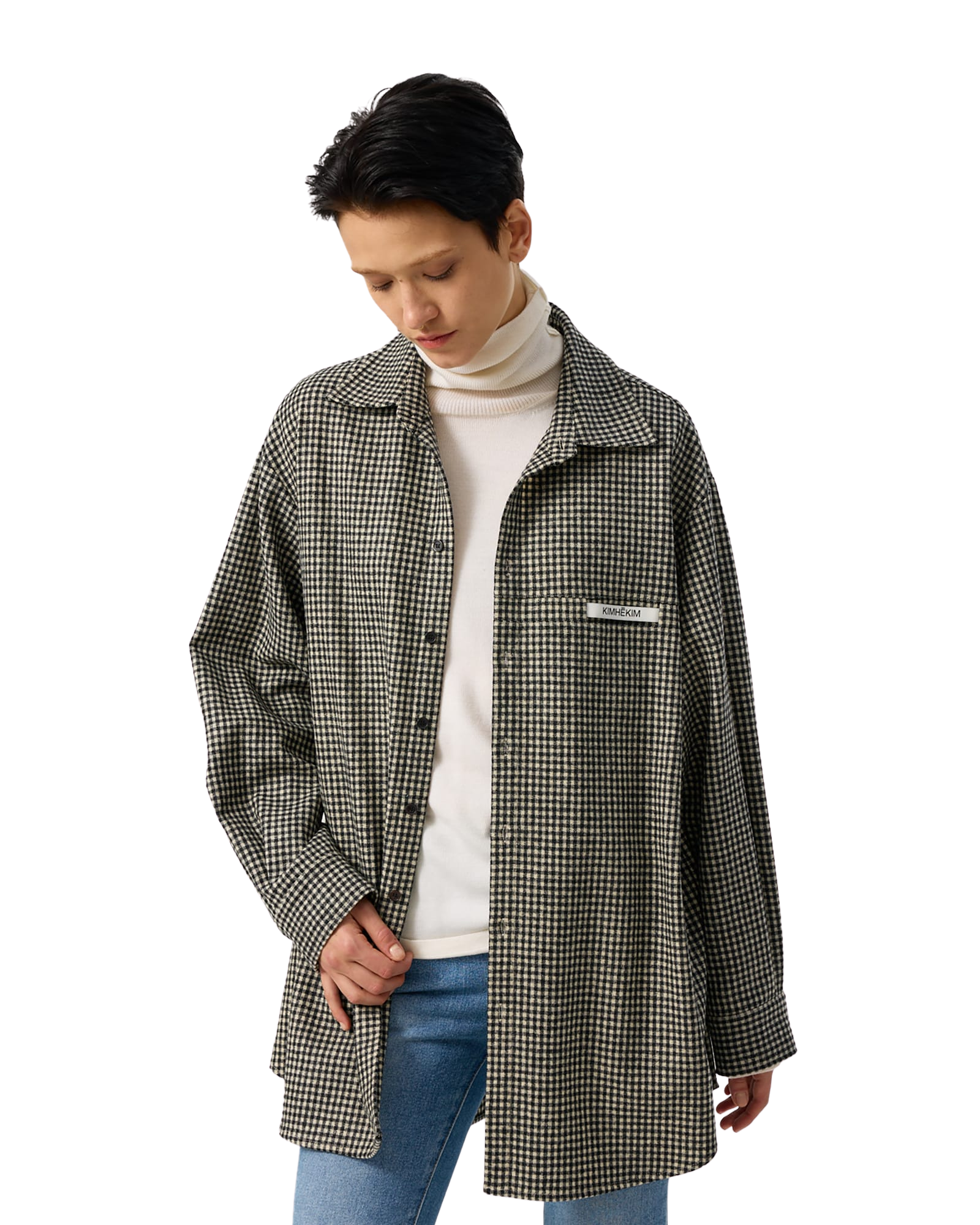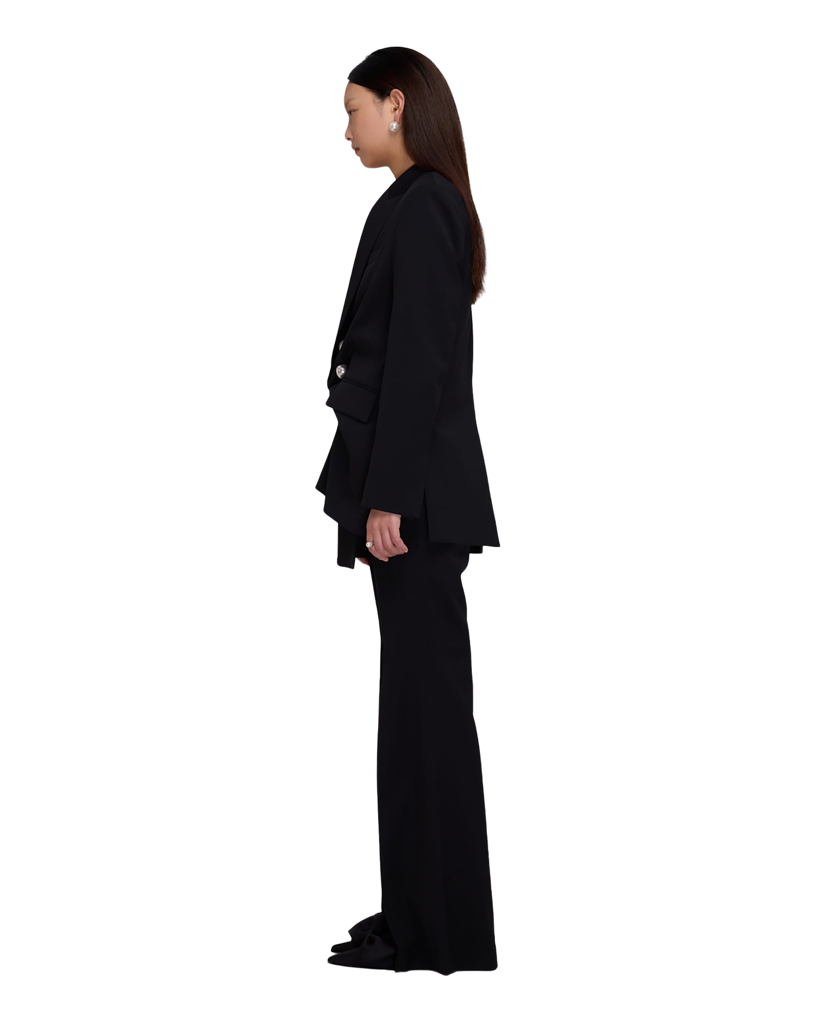 It's tailored for a slightly loose fit and shows draped asymmetric construction when it's closed with pearl buttons.