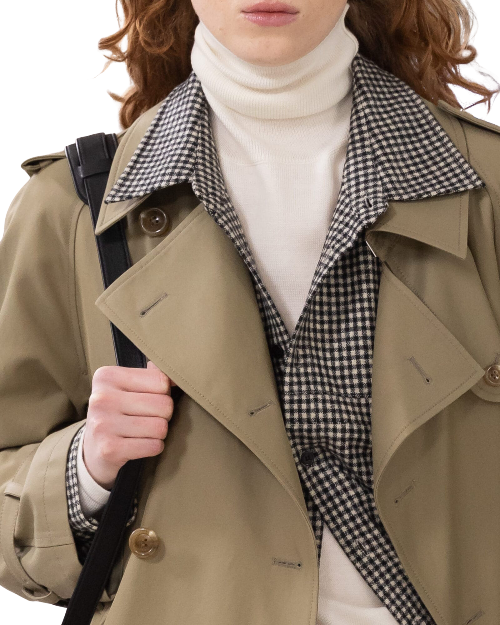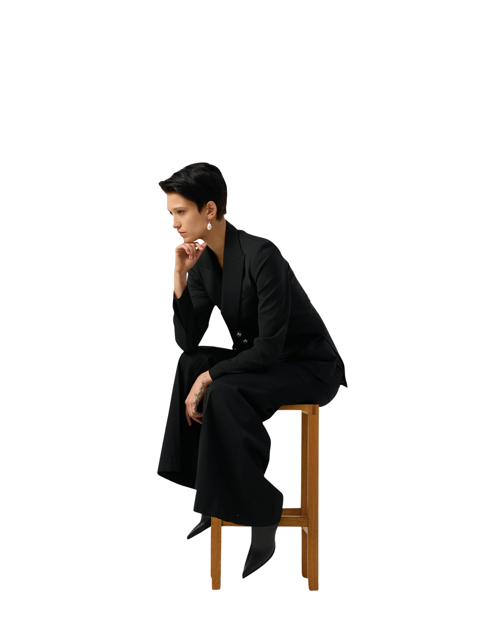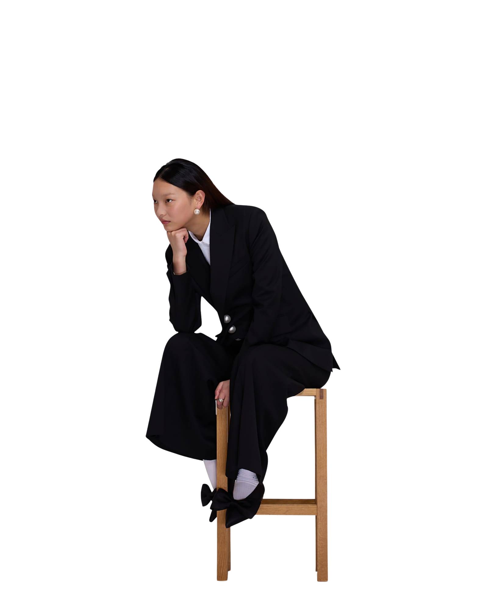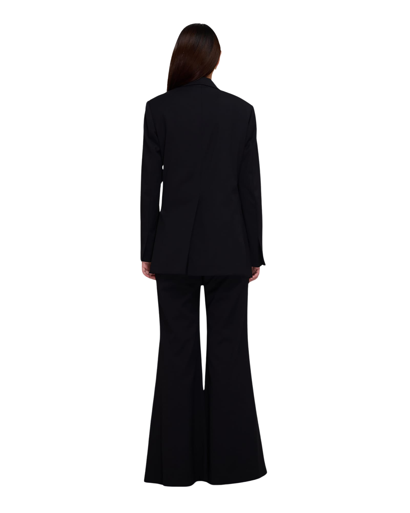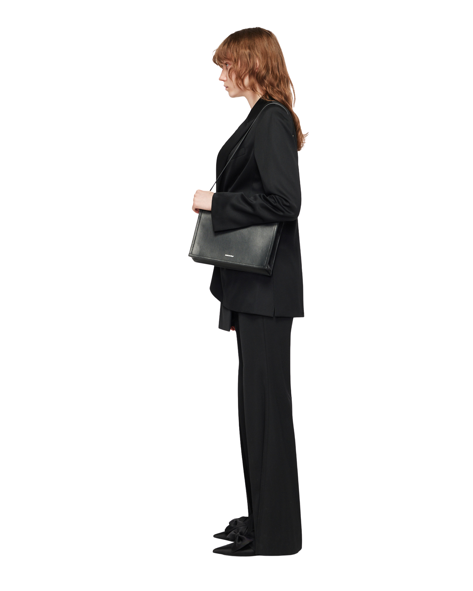 It's tailored for a slightly loose fit and shows draped asymmetric construction when it's closed with pearl buttons.