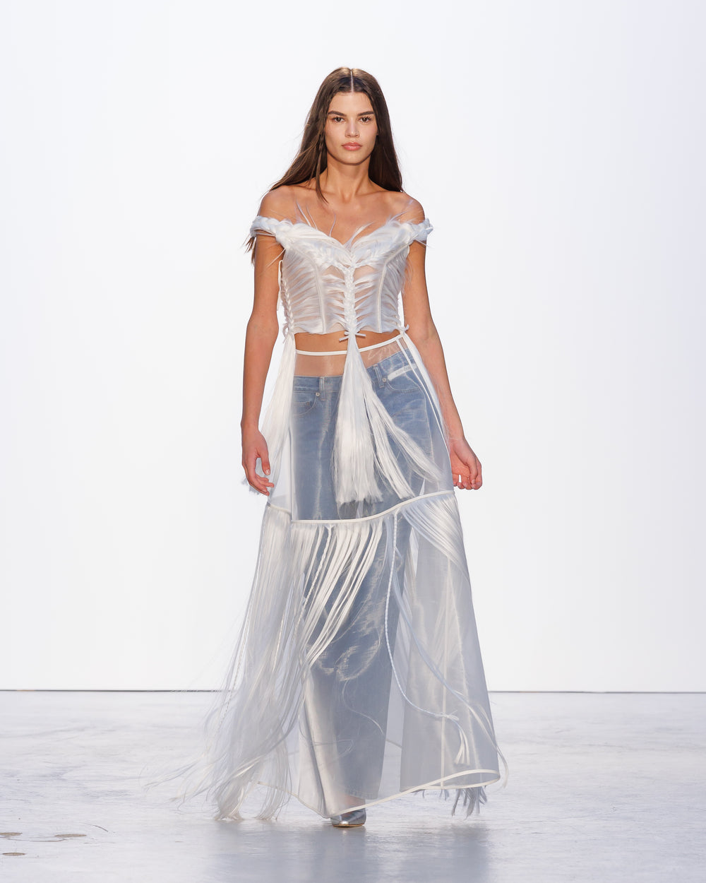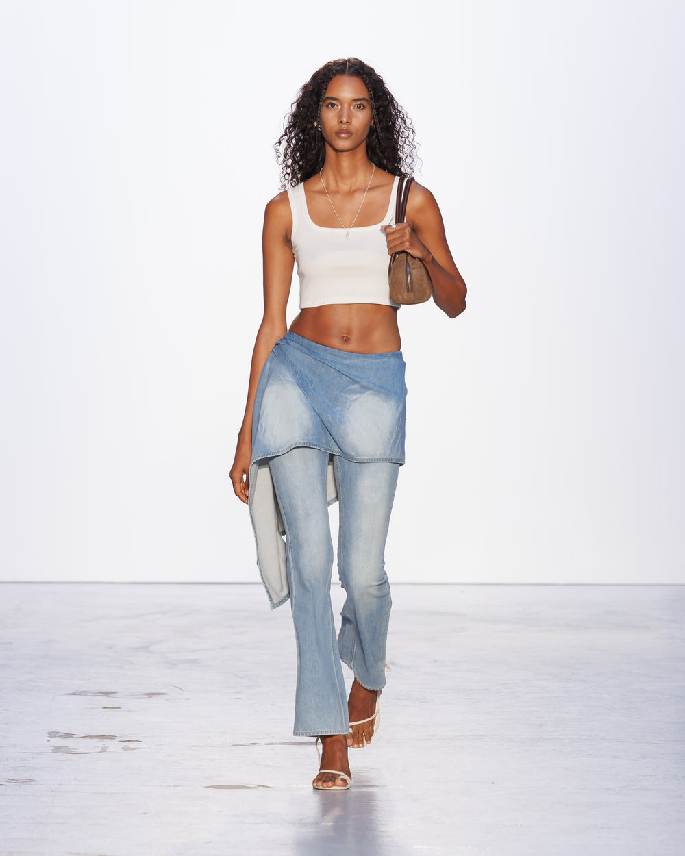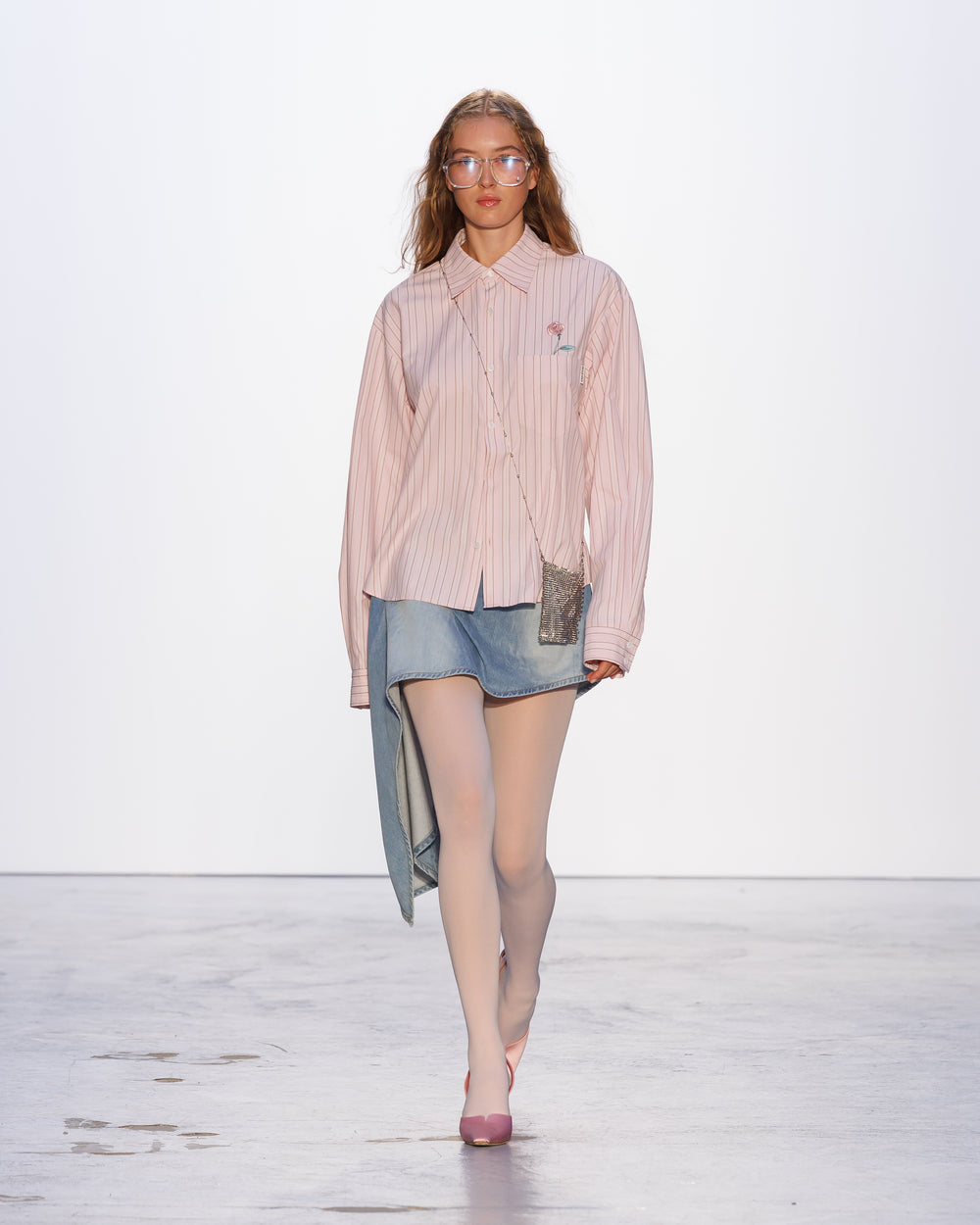 “I Feel Love” channels the euphoric rhythms of the 1970s disco era, reinterpreting freedom and sensuality through KIMHĒKIM’s craftsmanship and playfulness. Elements from the Obsession series including pearl details, bow accents, denim reformation, and heart motifs are reborn in the clean yet fluid silhouettes of the 70s, shimmering with renewed energy.