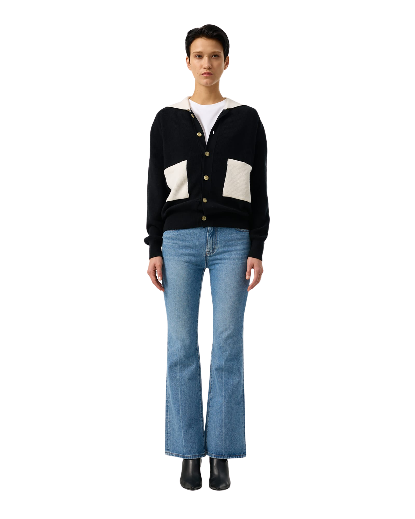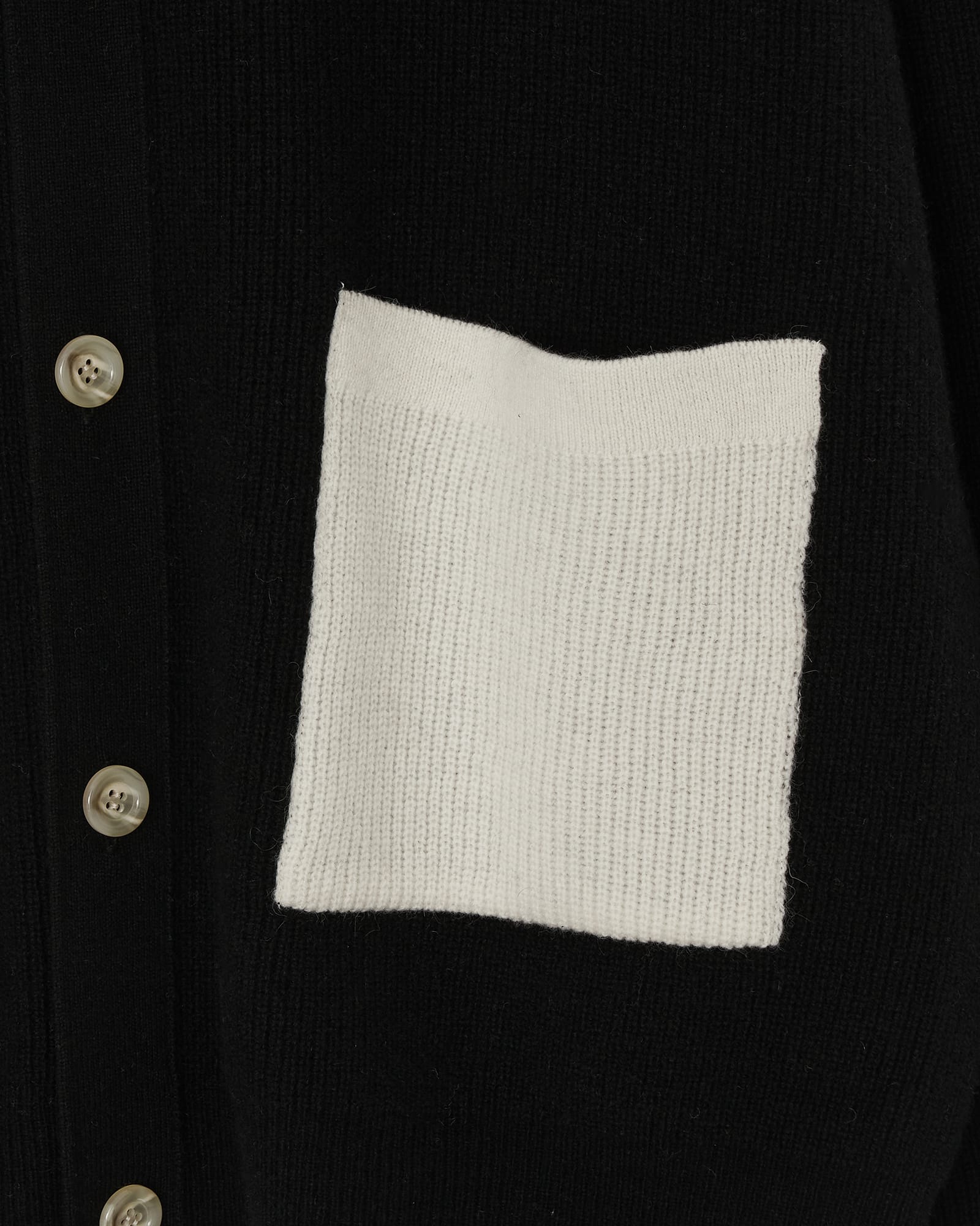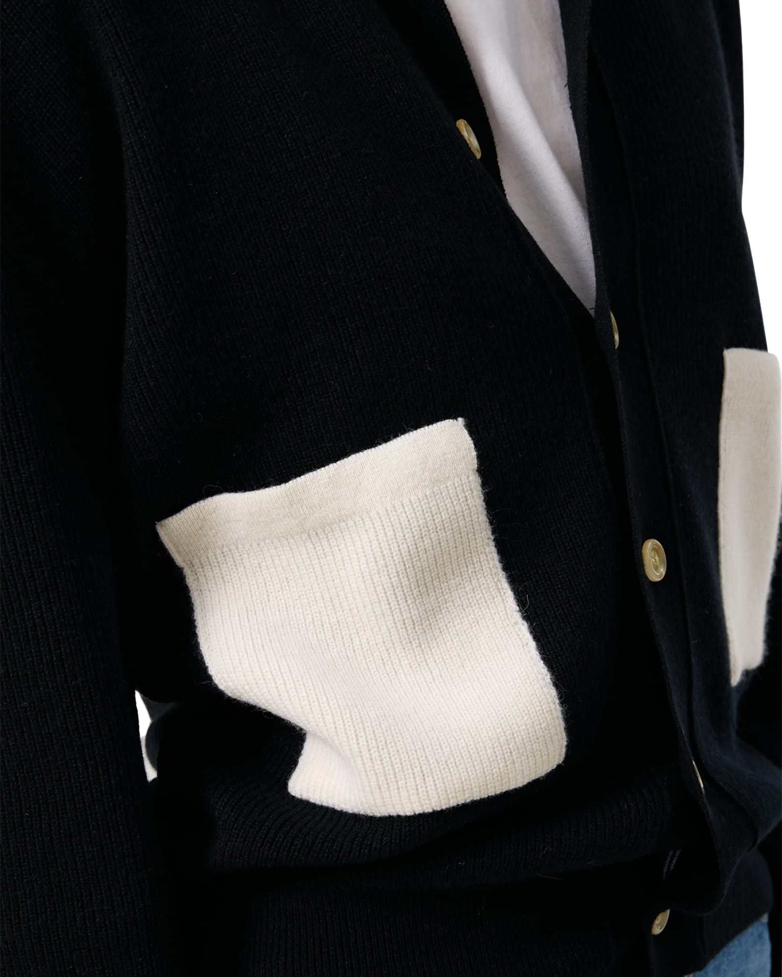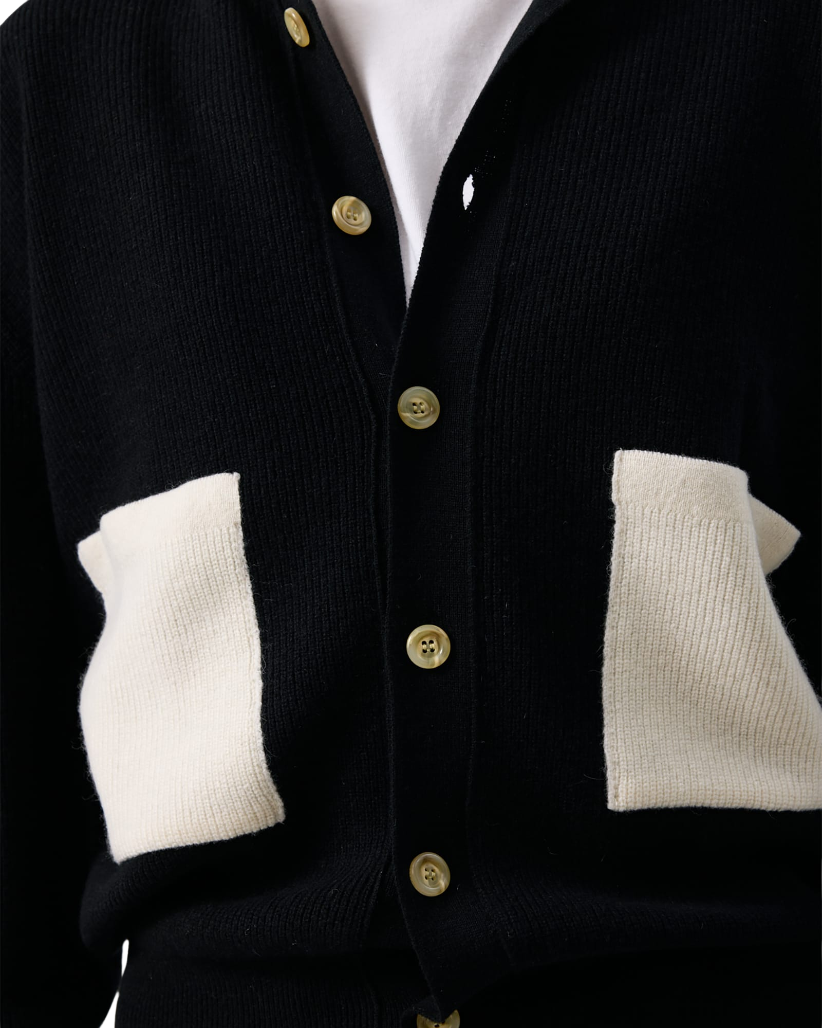 Designed to be color blocked cashmere-merino wool pocket cardigan.