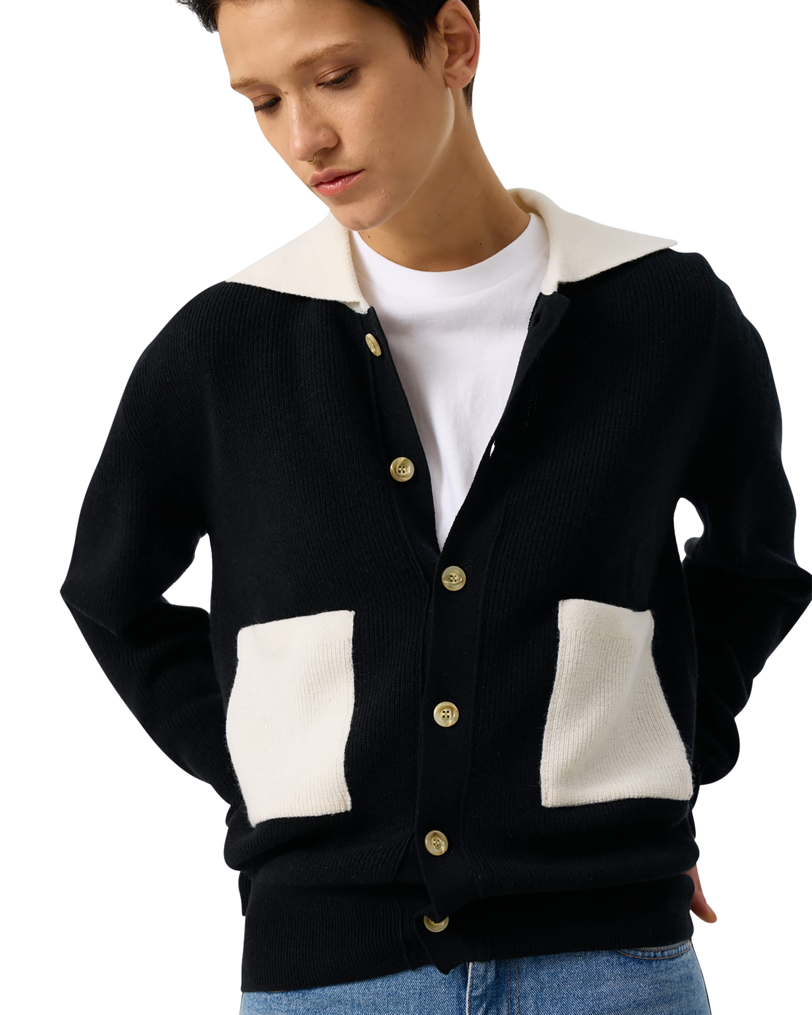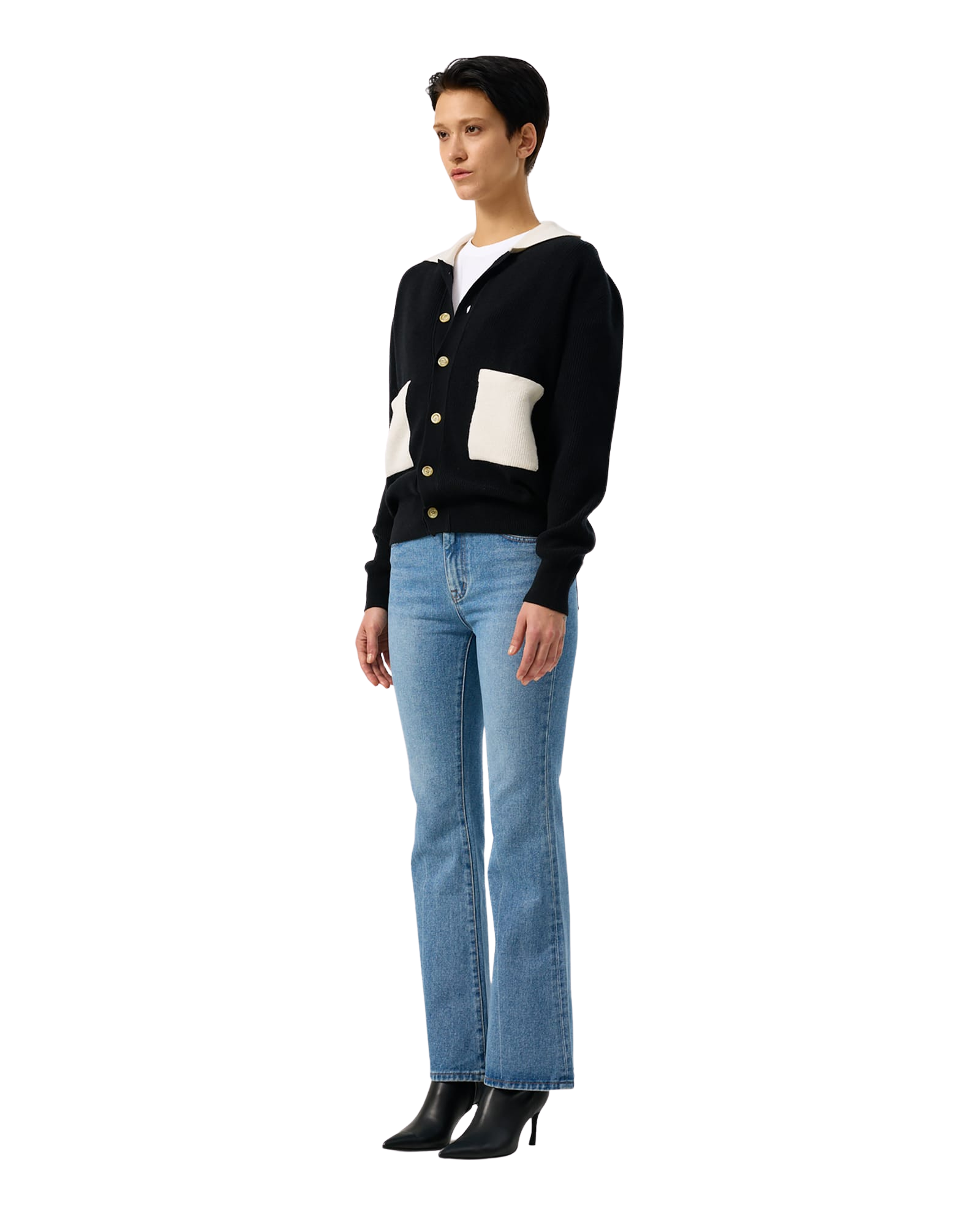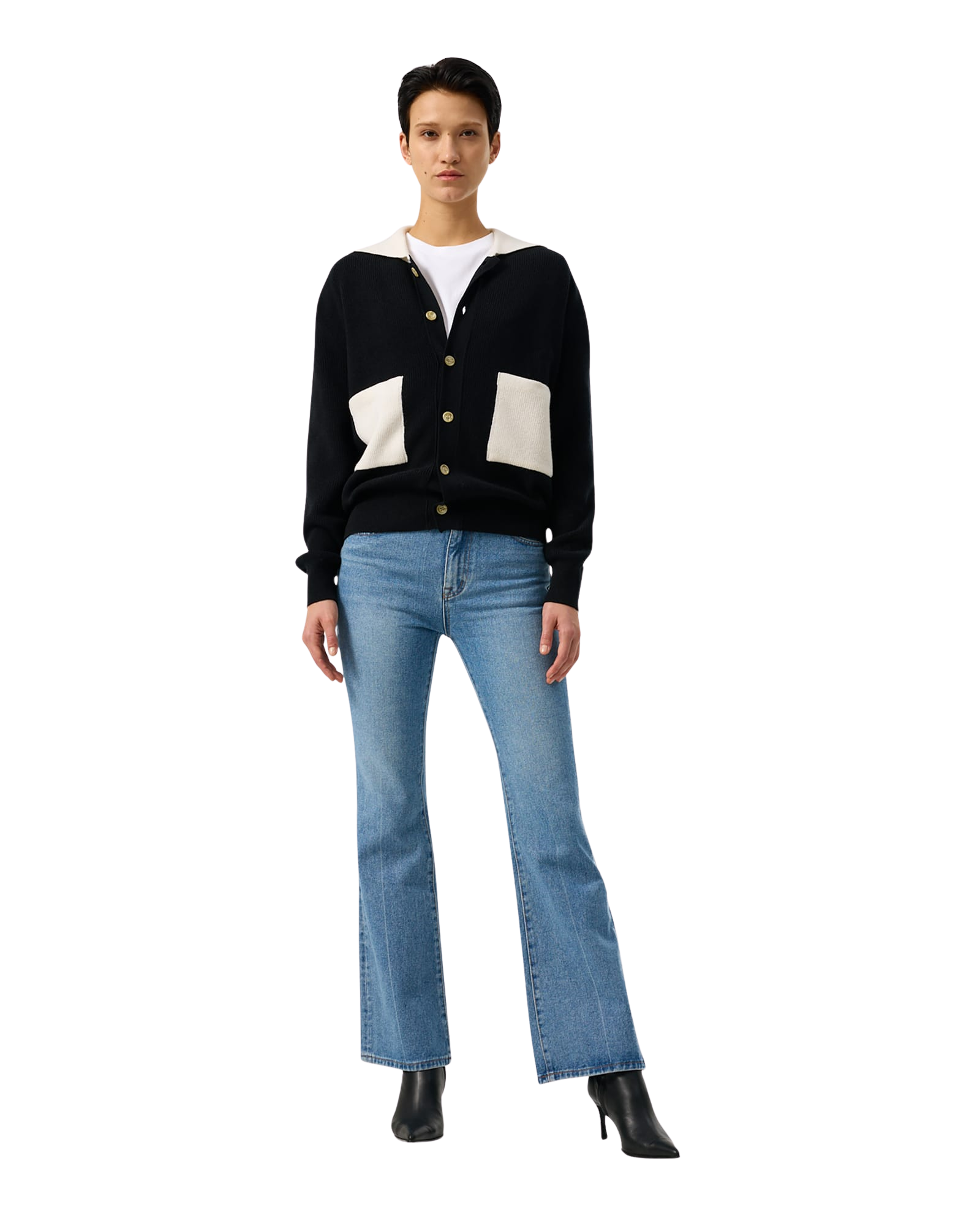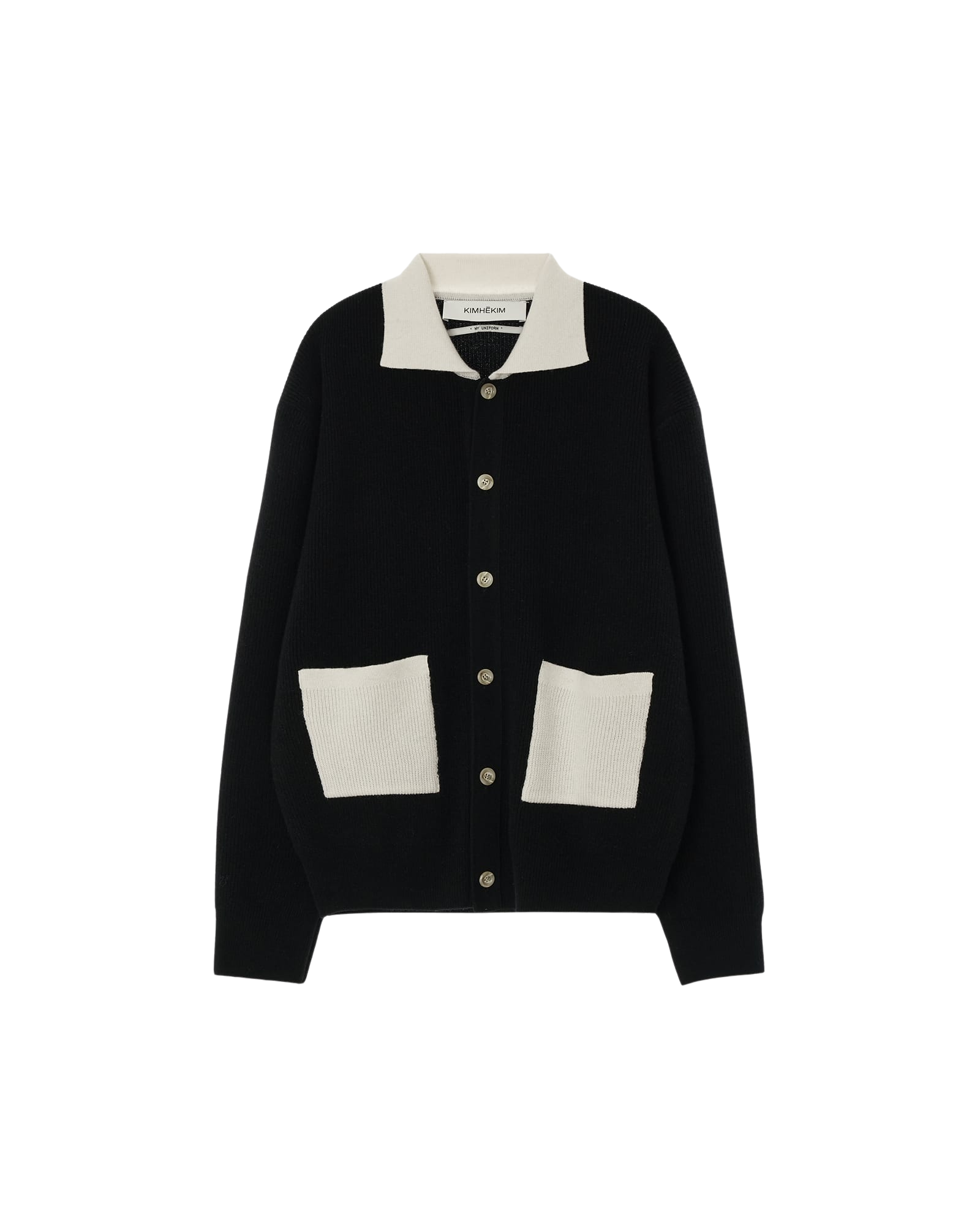 Designed to be color blocked cashmere-merino wool pocket cardigan.