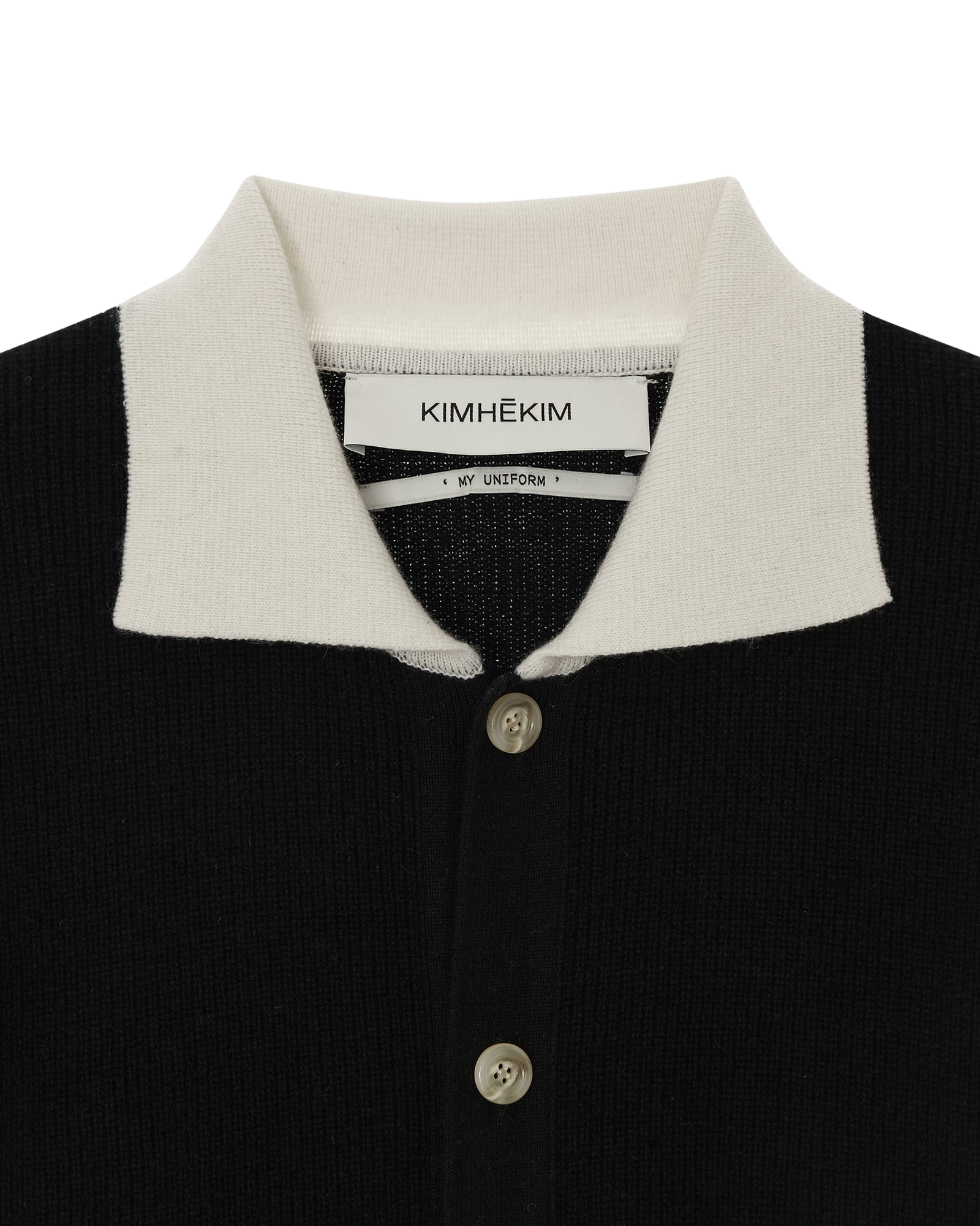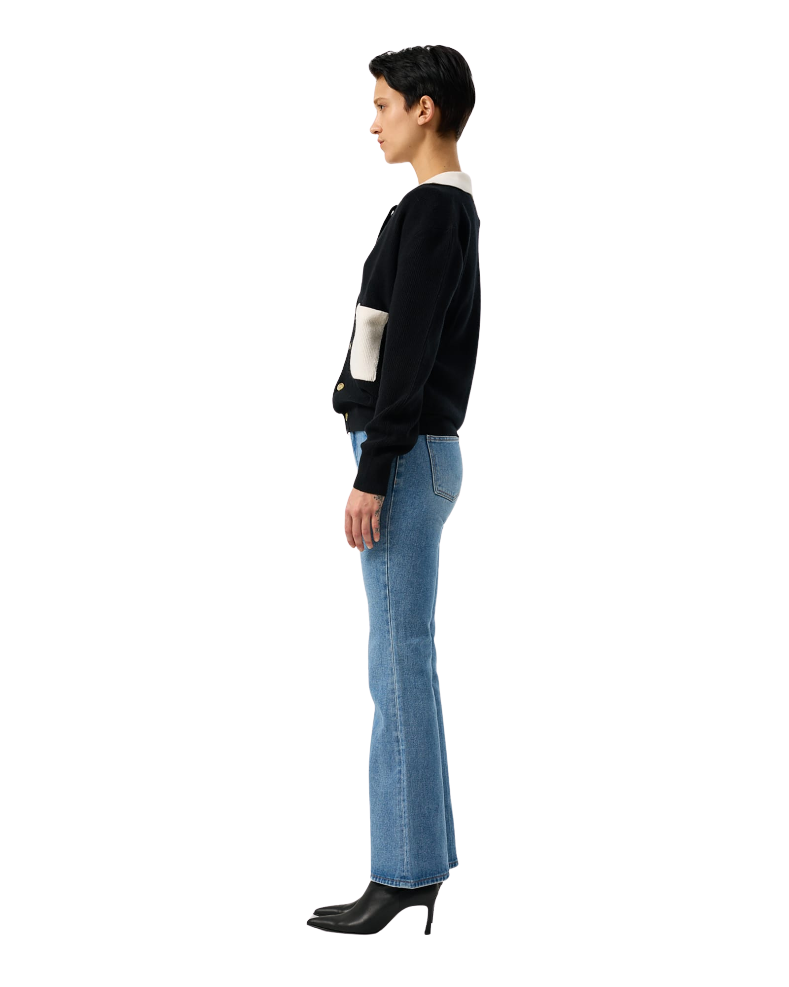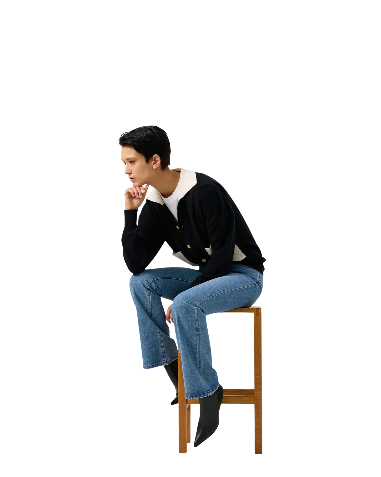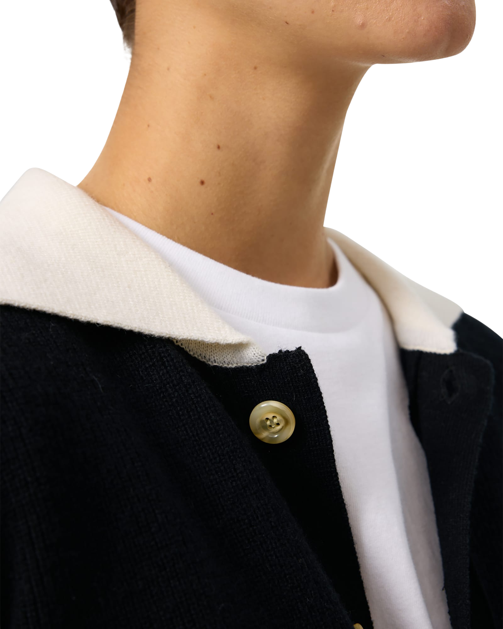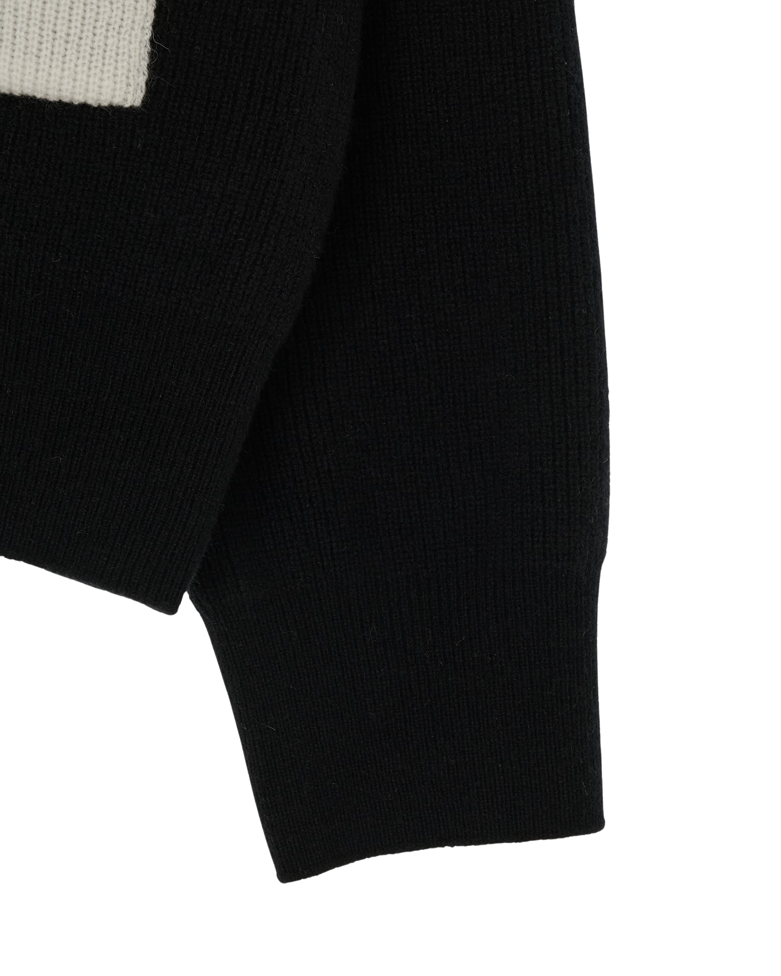 Designed to be color blocked cashmere-merino wool pocket cardigan.