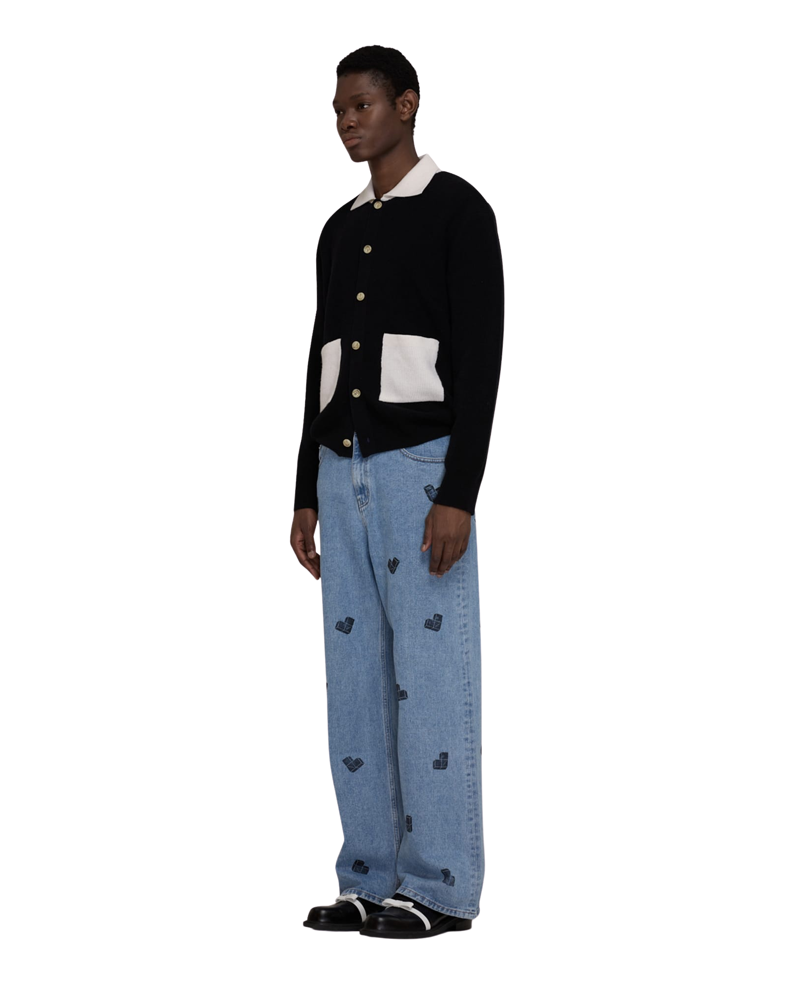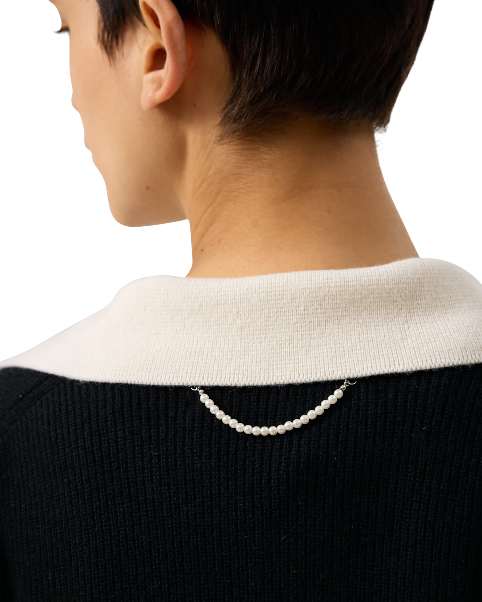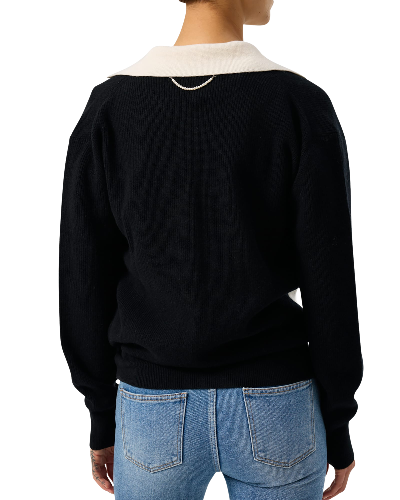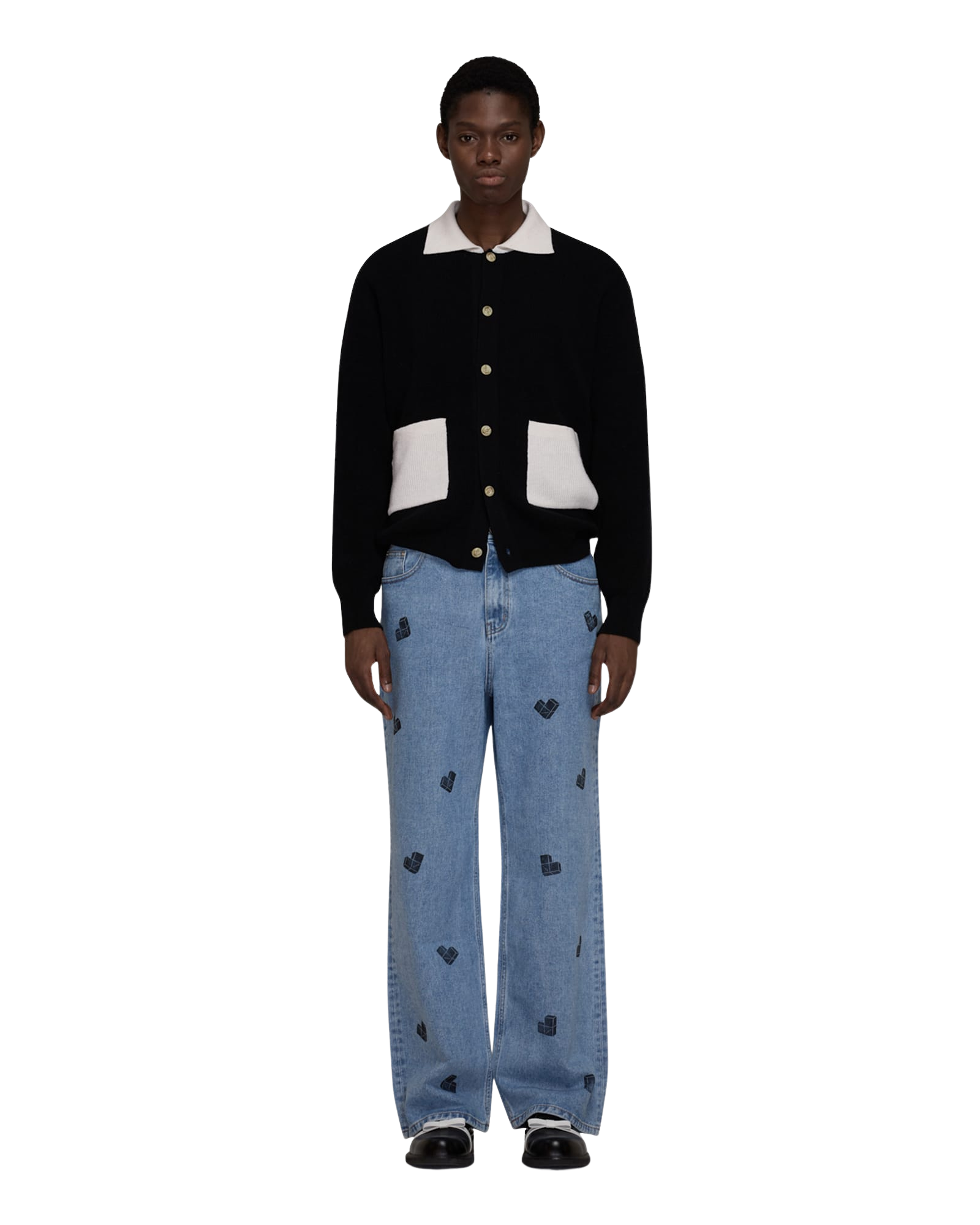 Designed to be color blocked cashmere-merino wool pocket cardigan.