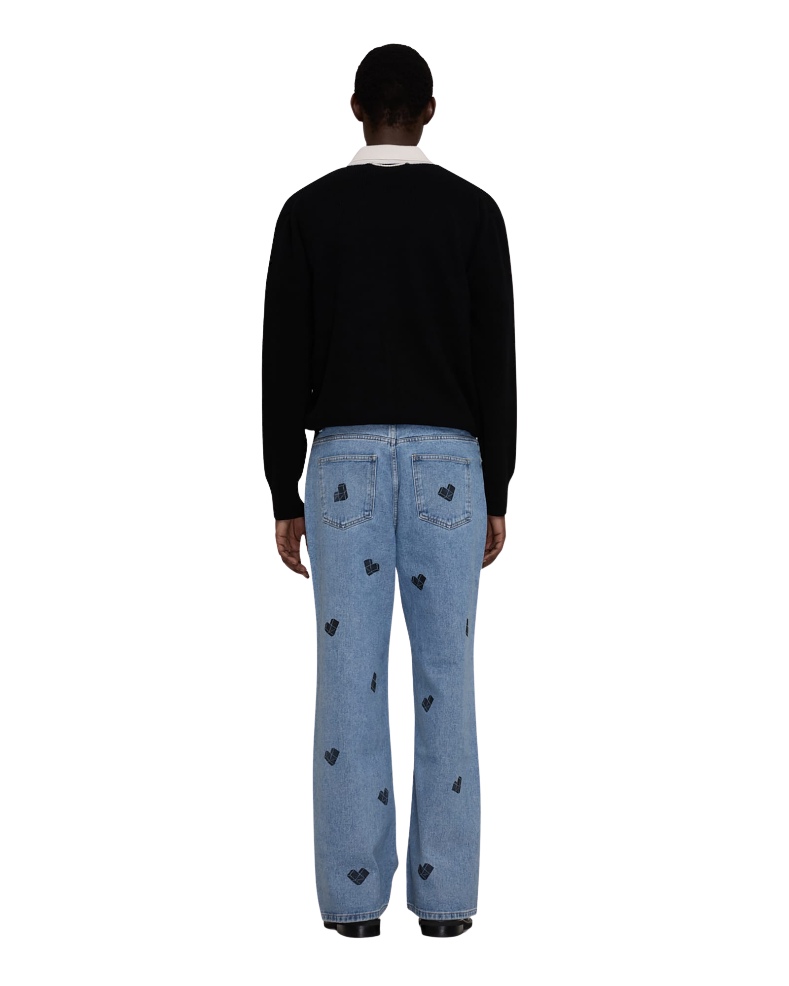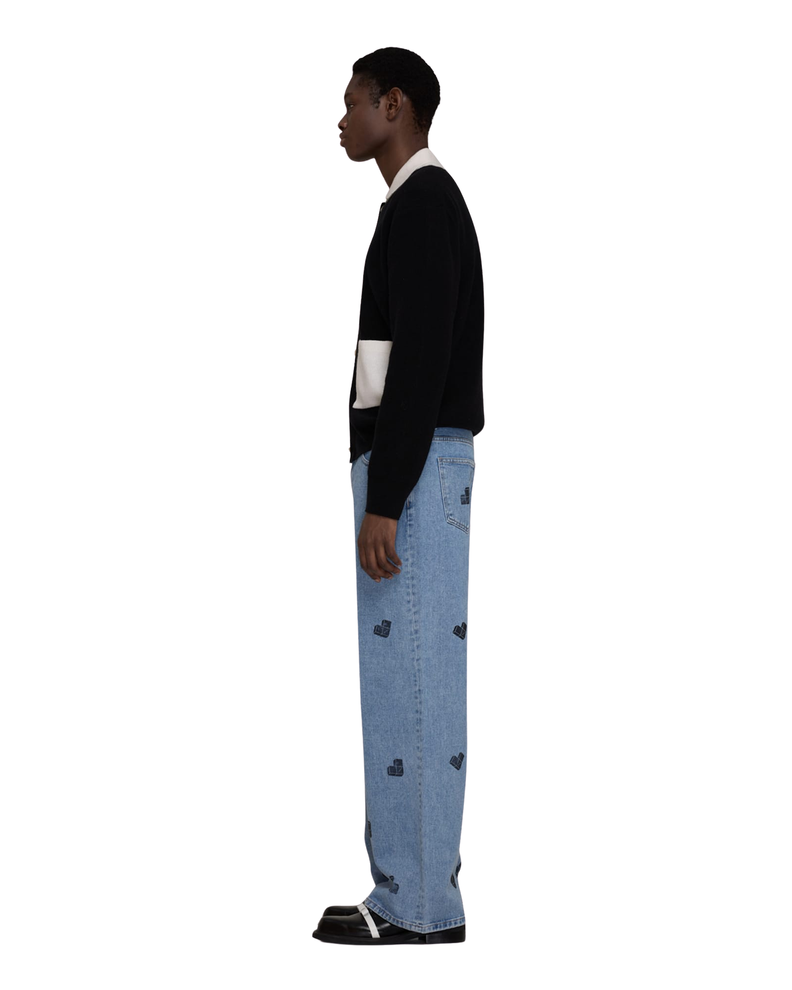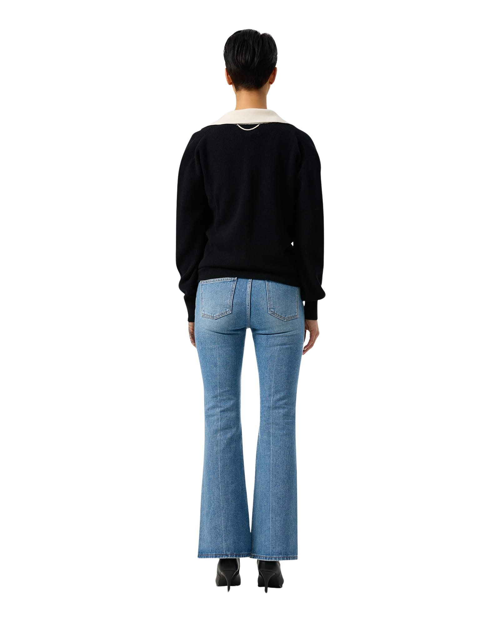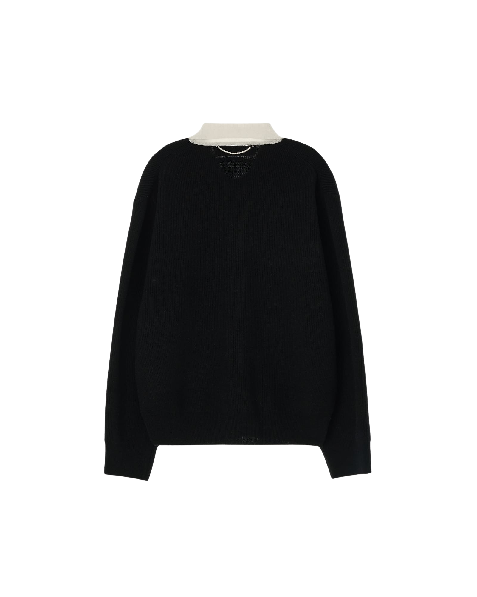 Designed to be color blocked cashmere-merino wool pocket cardigan.