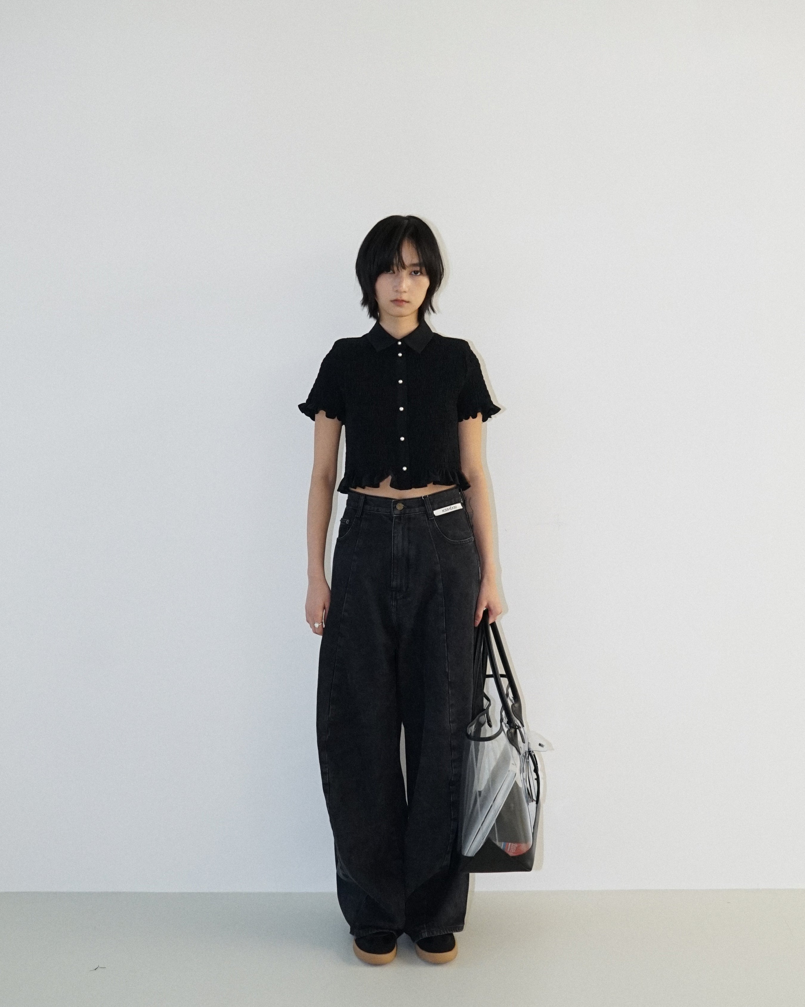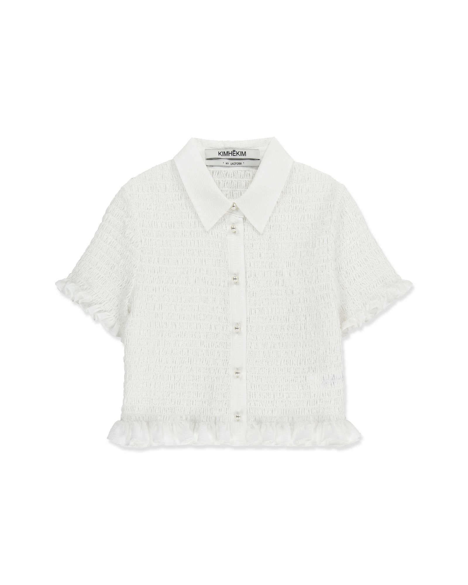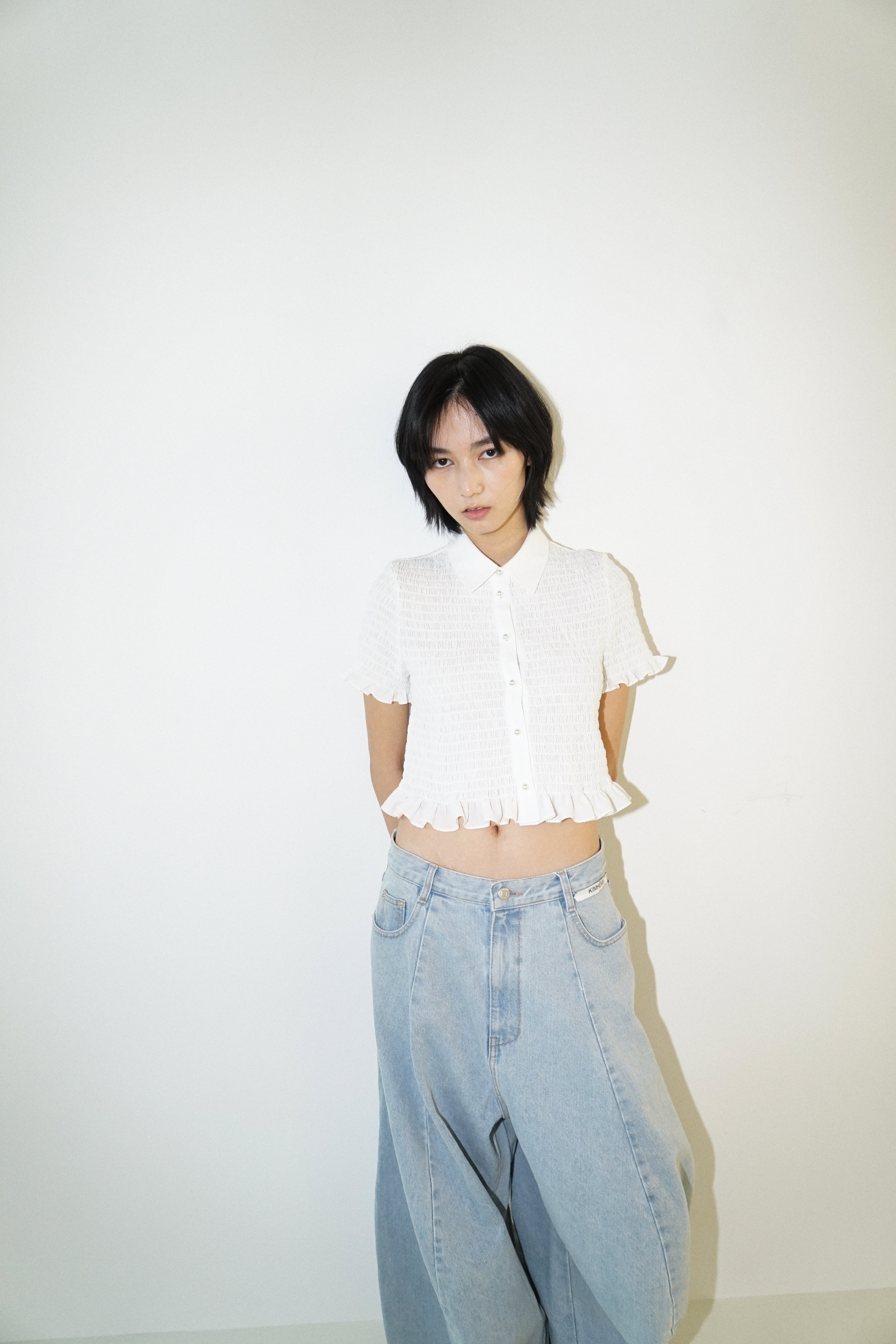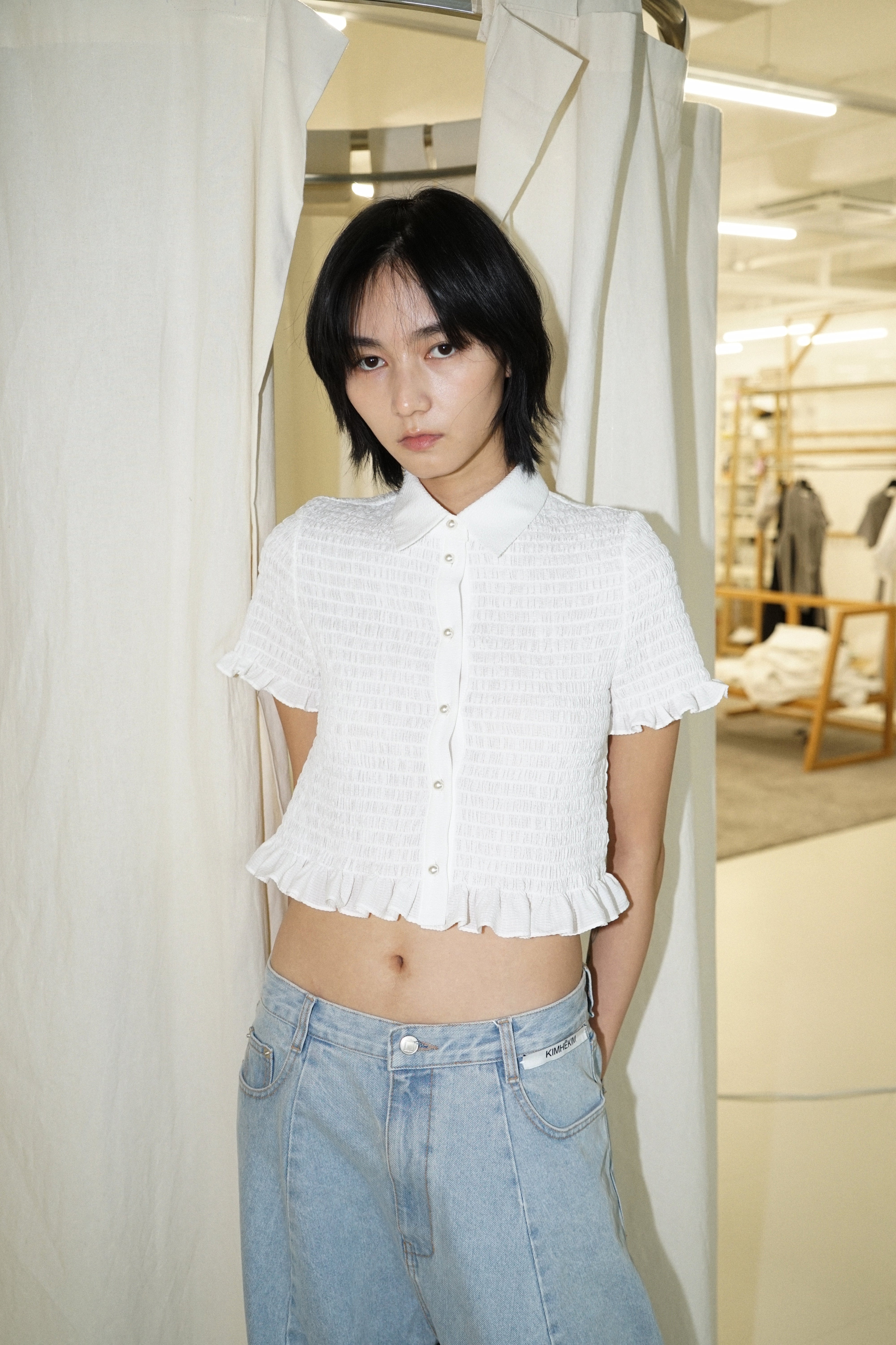 -A cropped shirt adorned with pearl buttons.