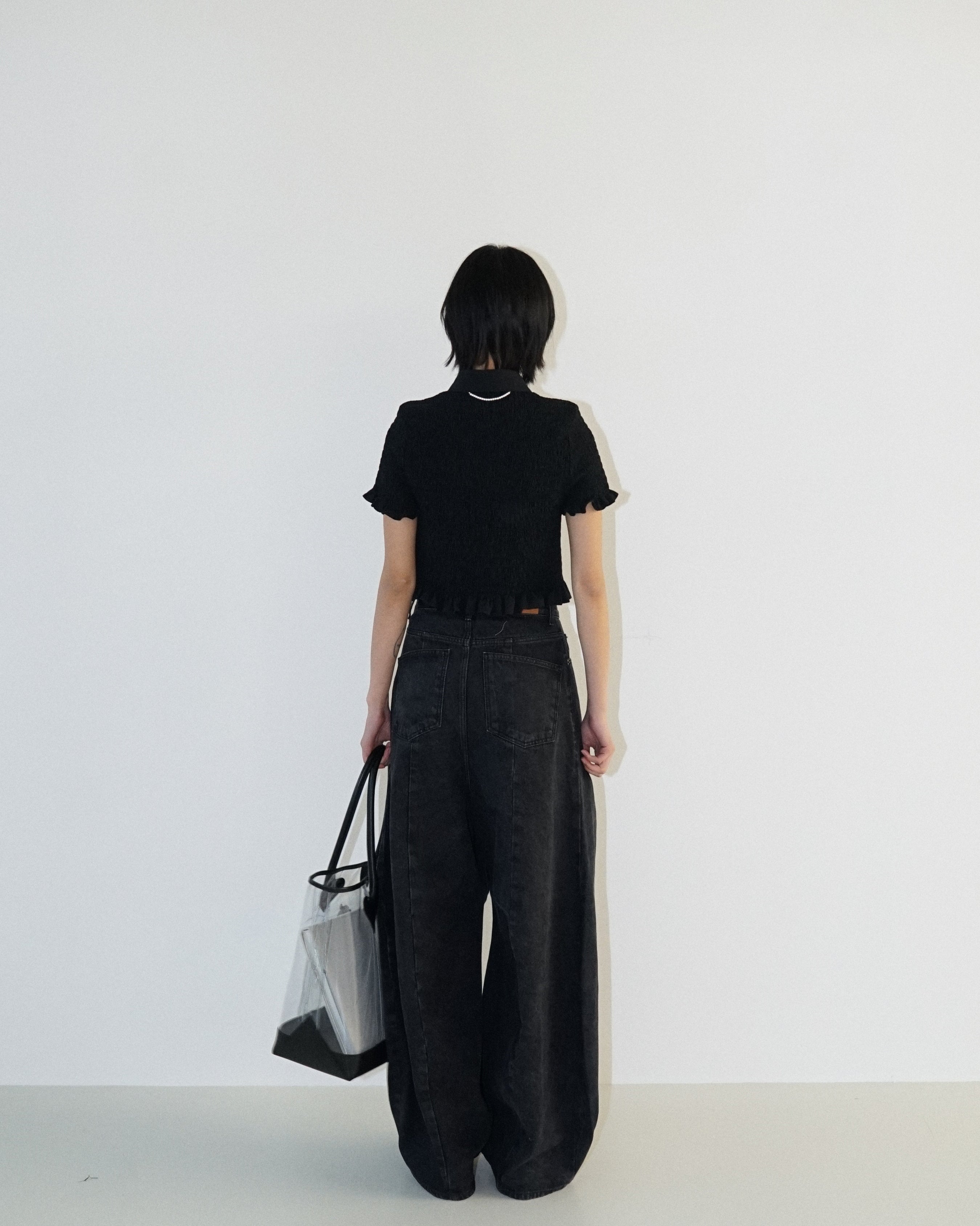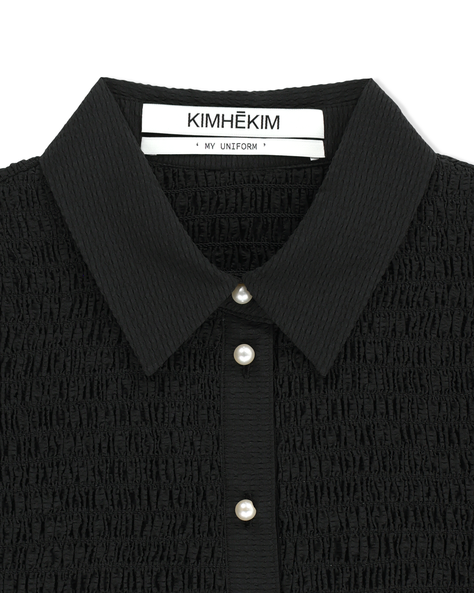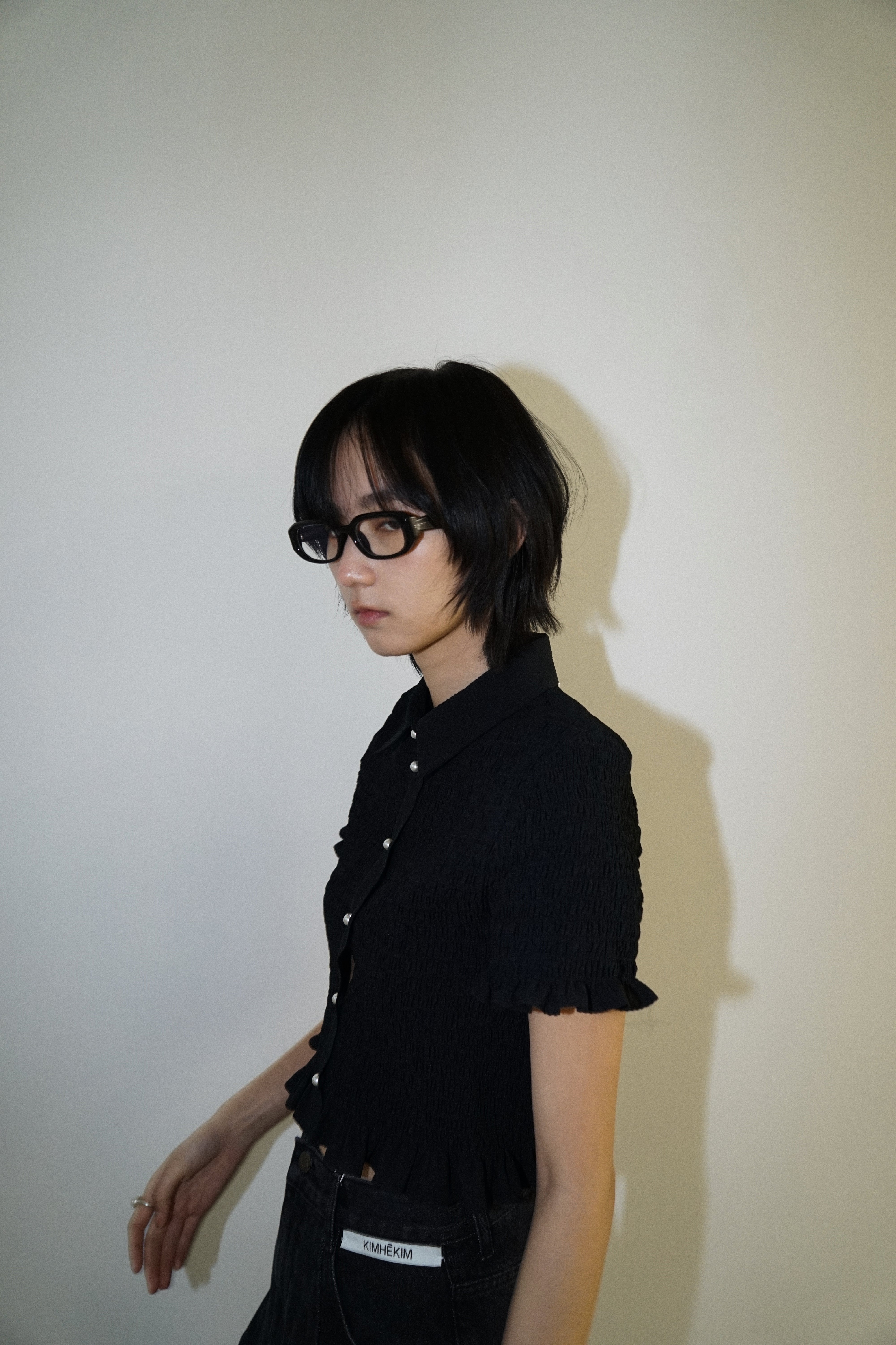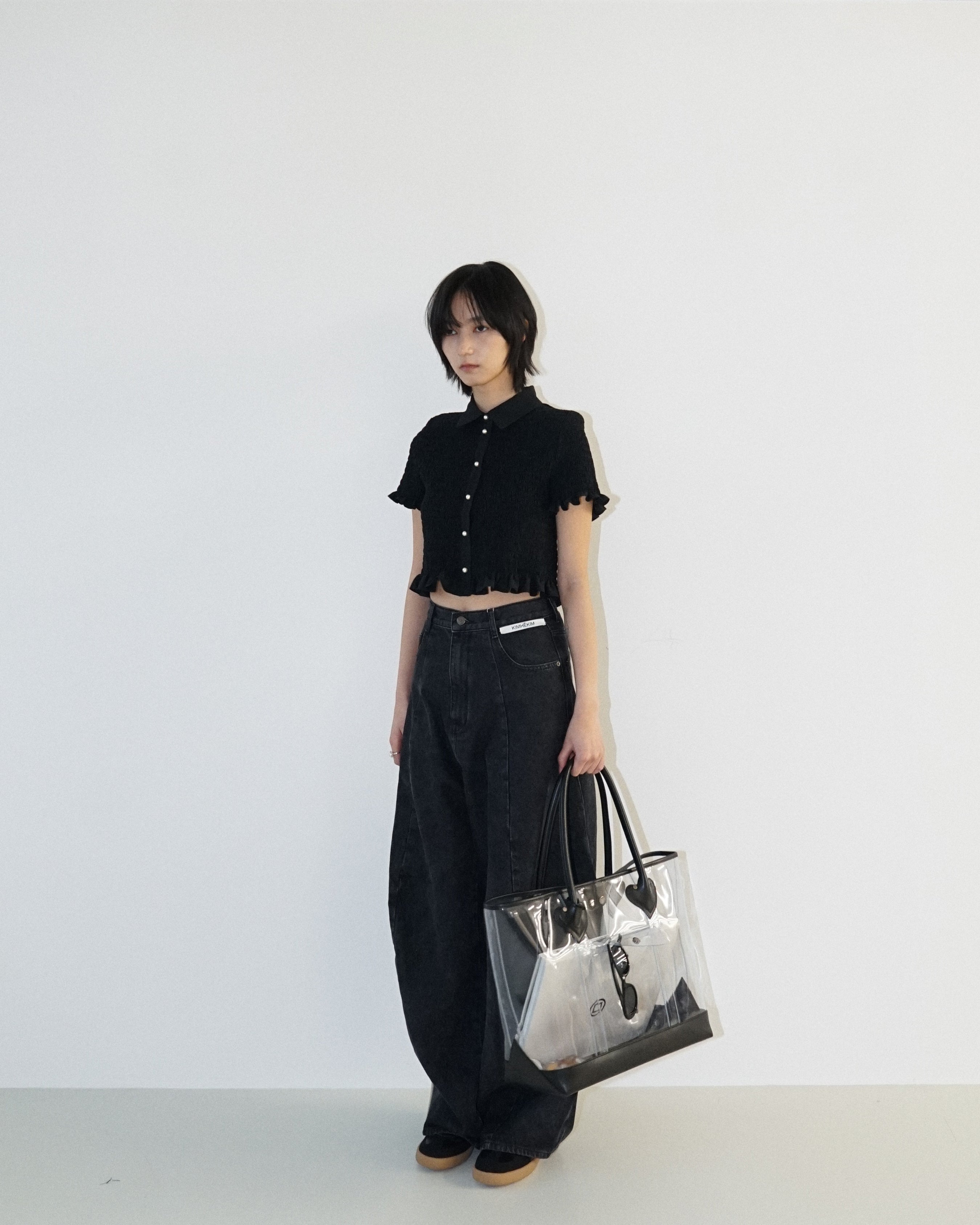 -A cropped shirt adorned with pearl buttons.