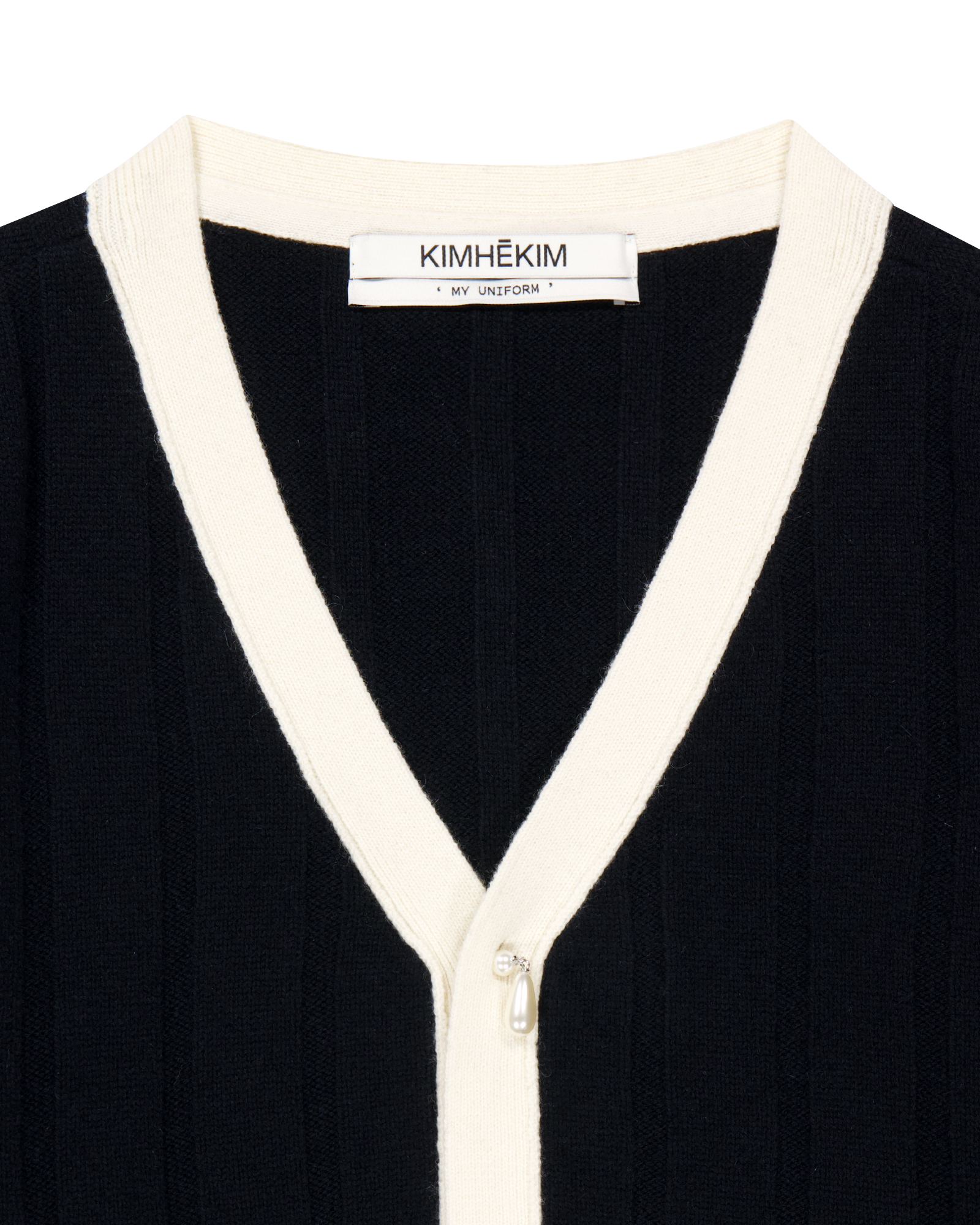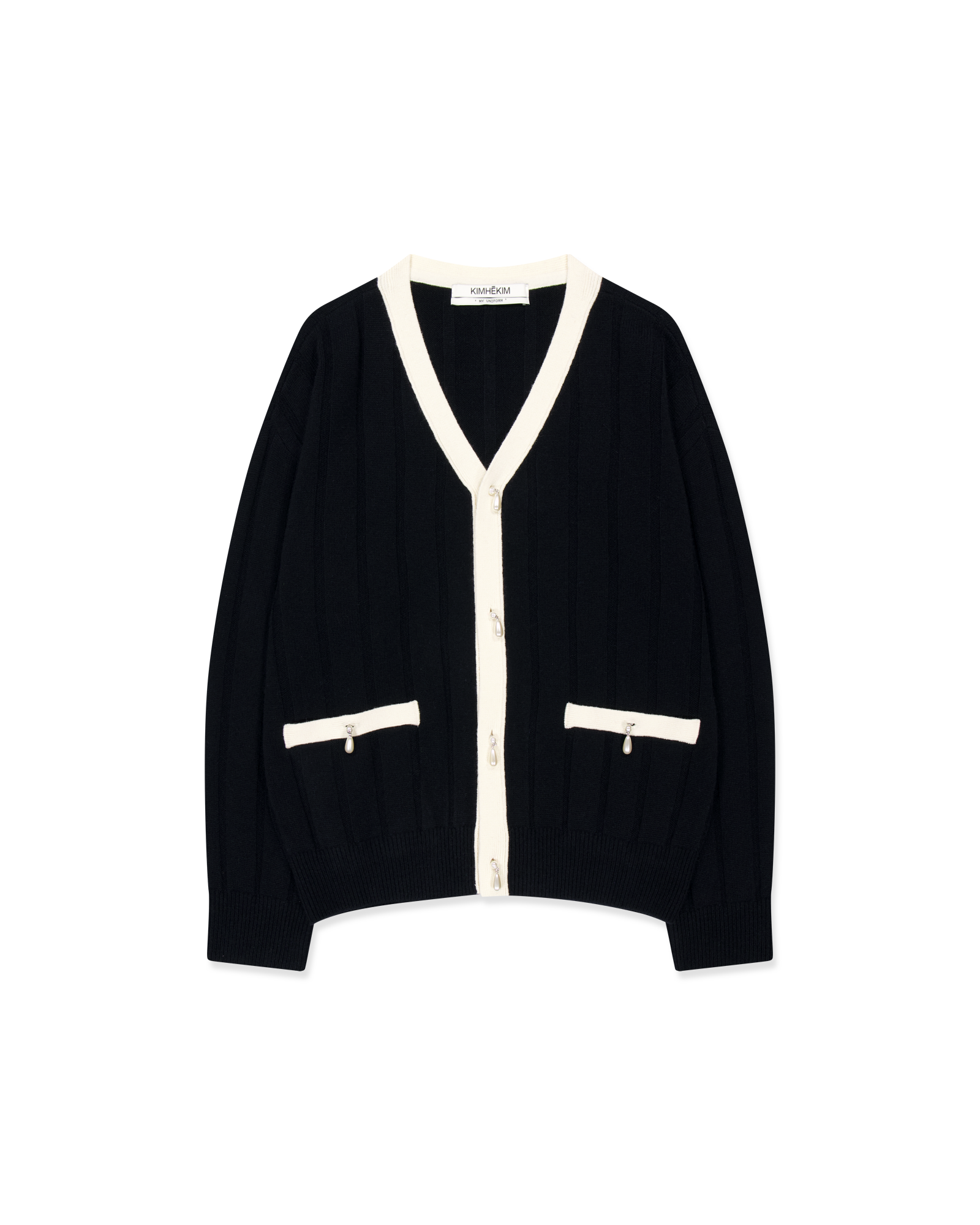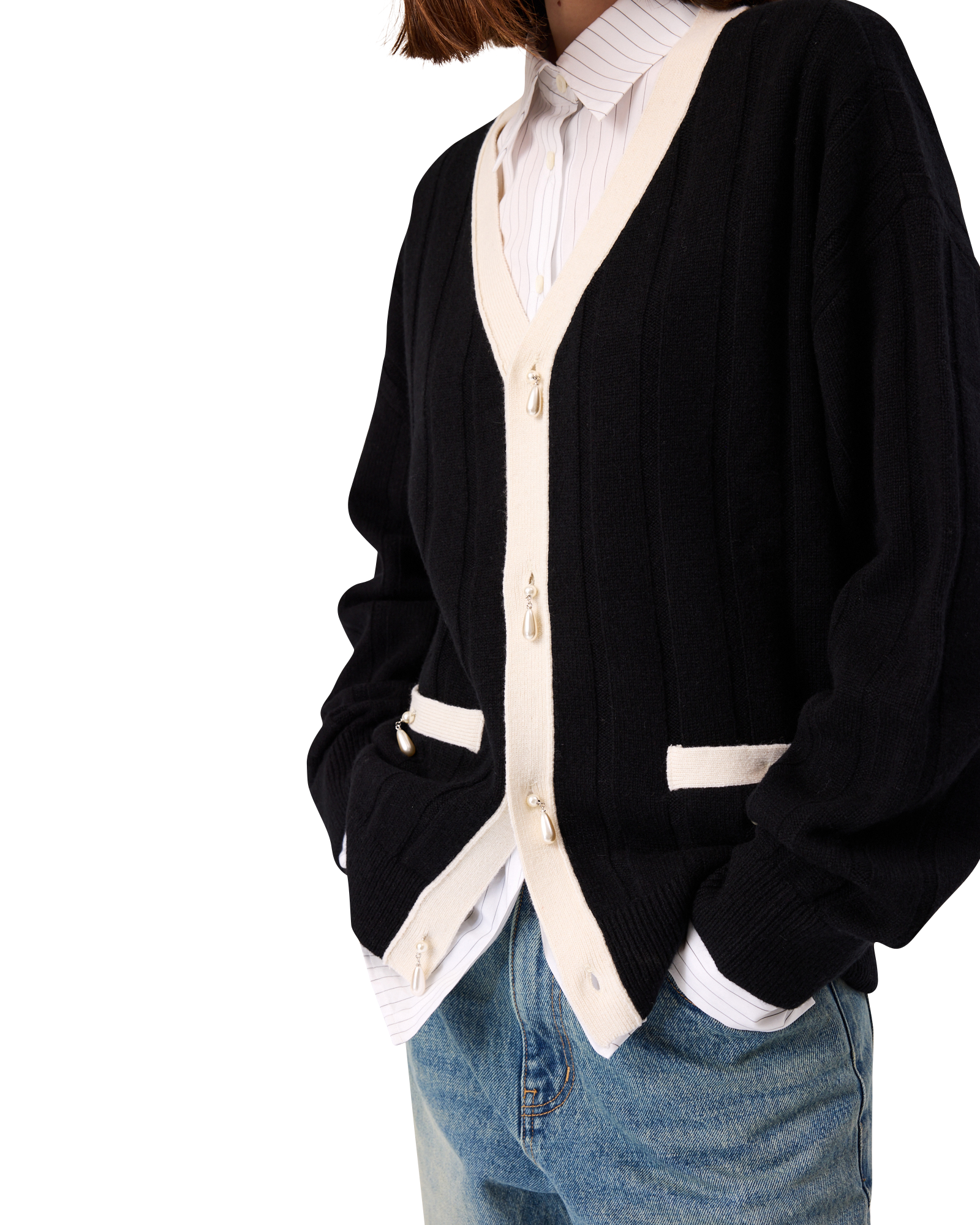 Pearl Embellished V-Neck Cardigan (Ivory/Black)