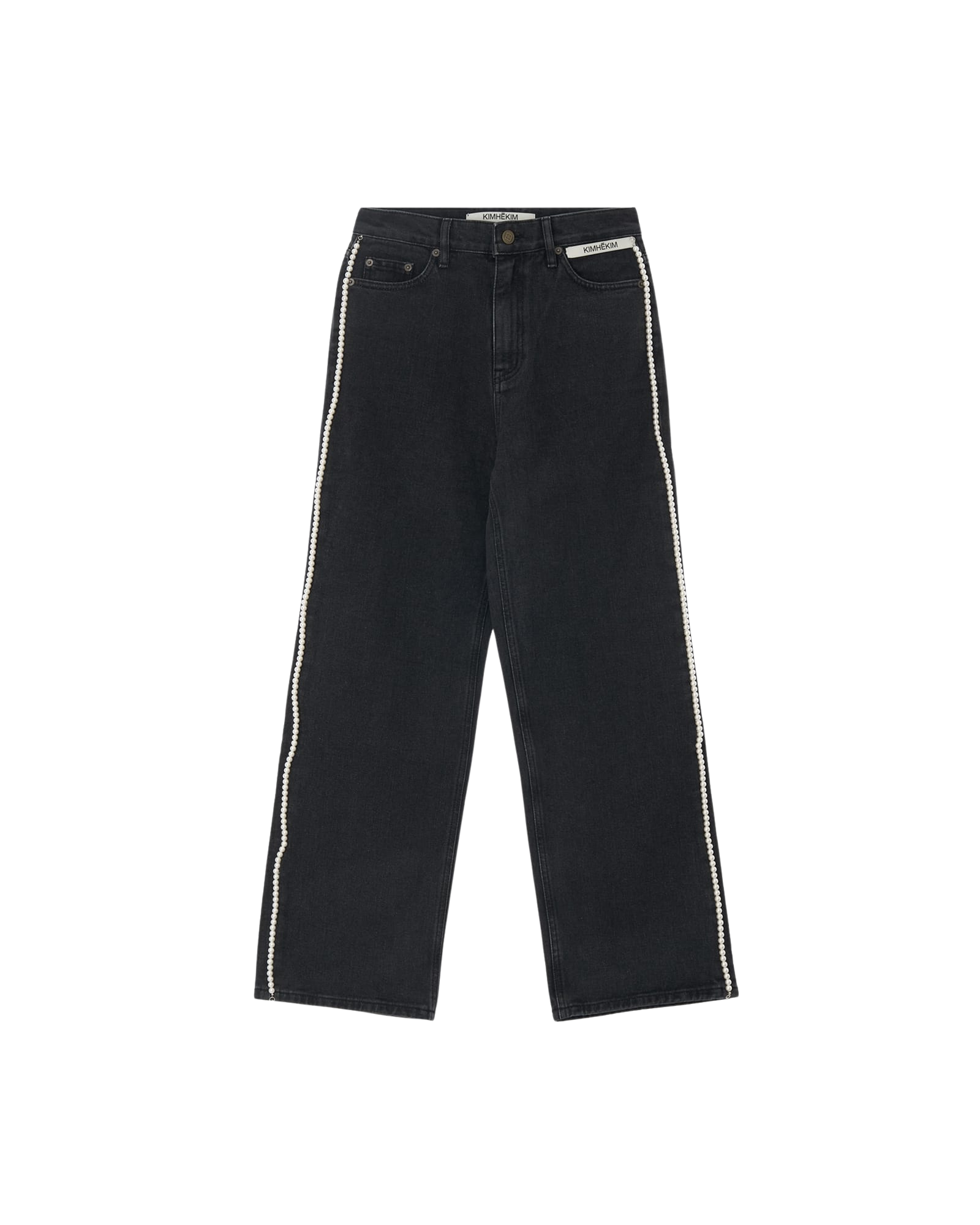 Pearl Embellished Wide Leg Denim Pants (Black)
