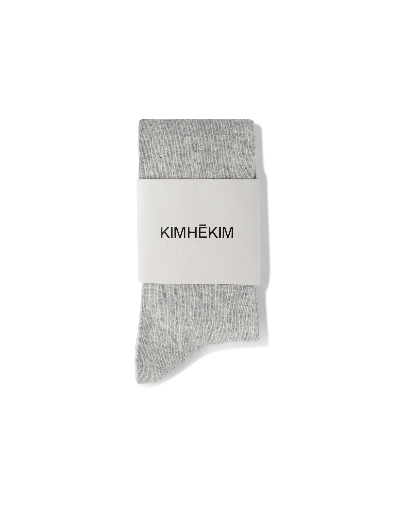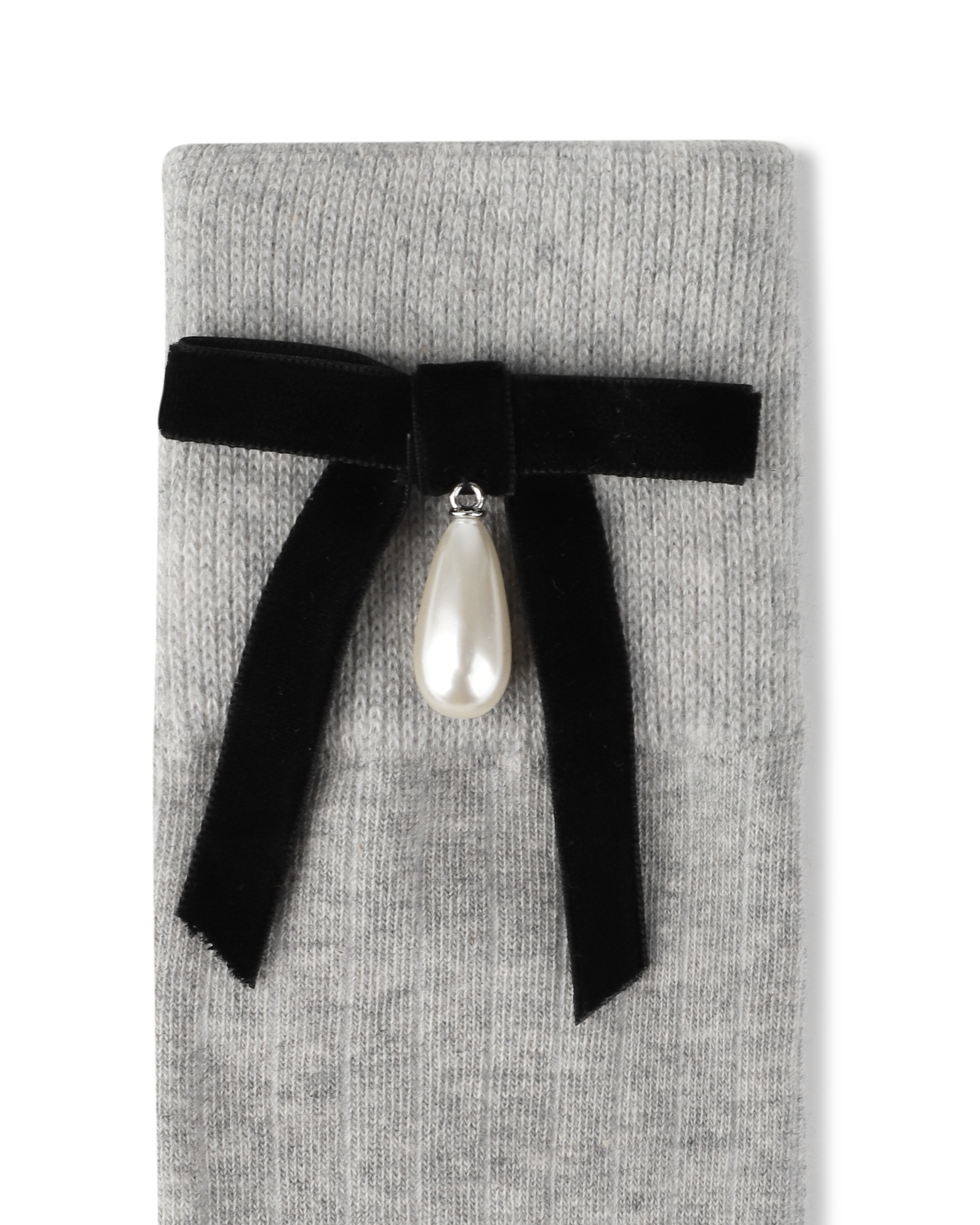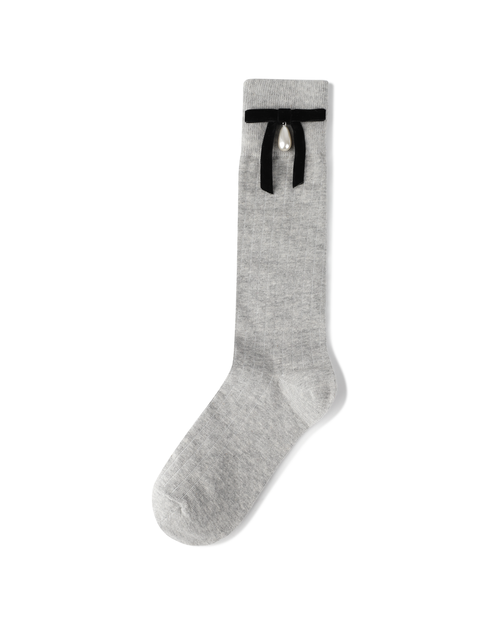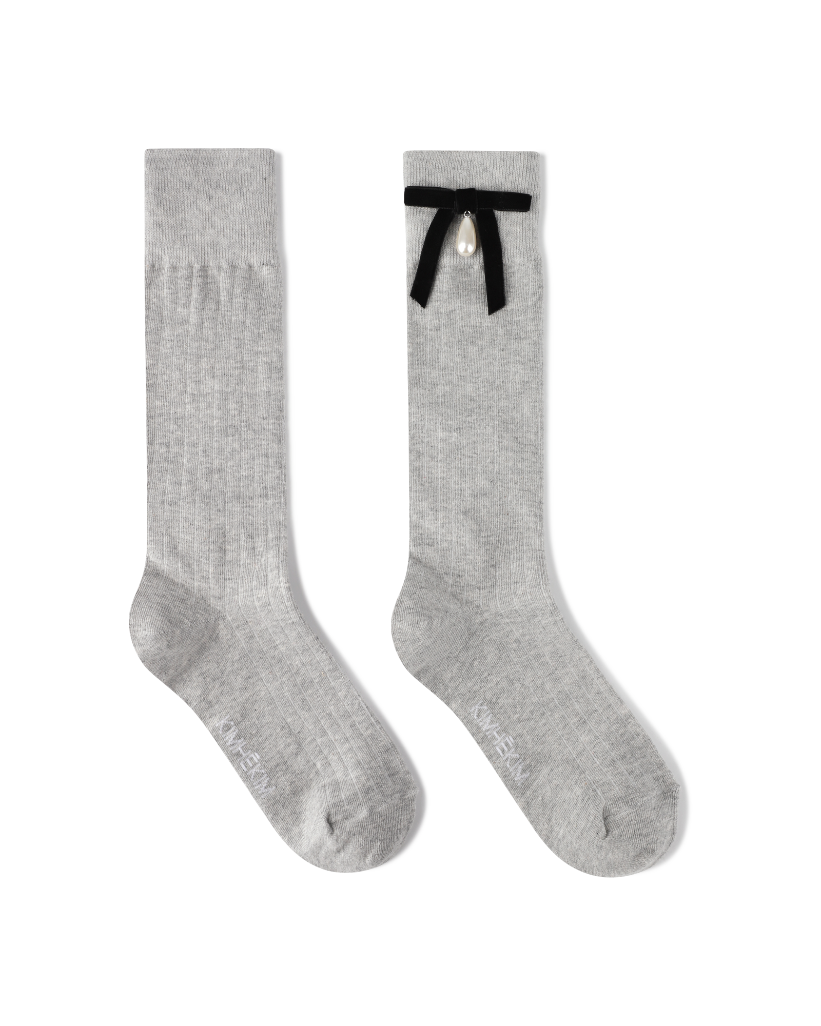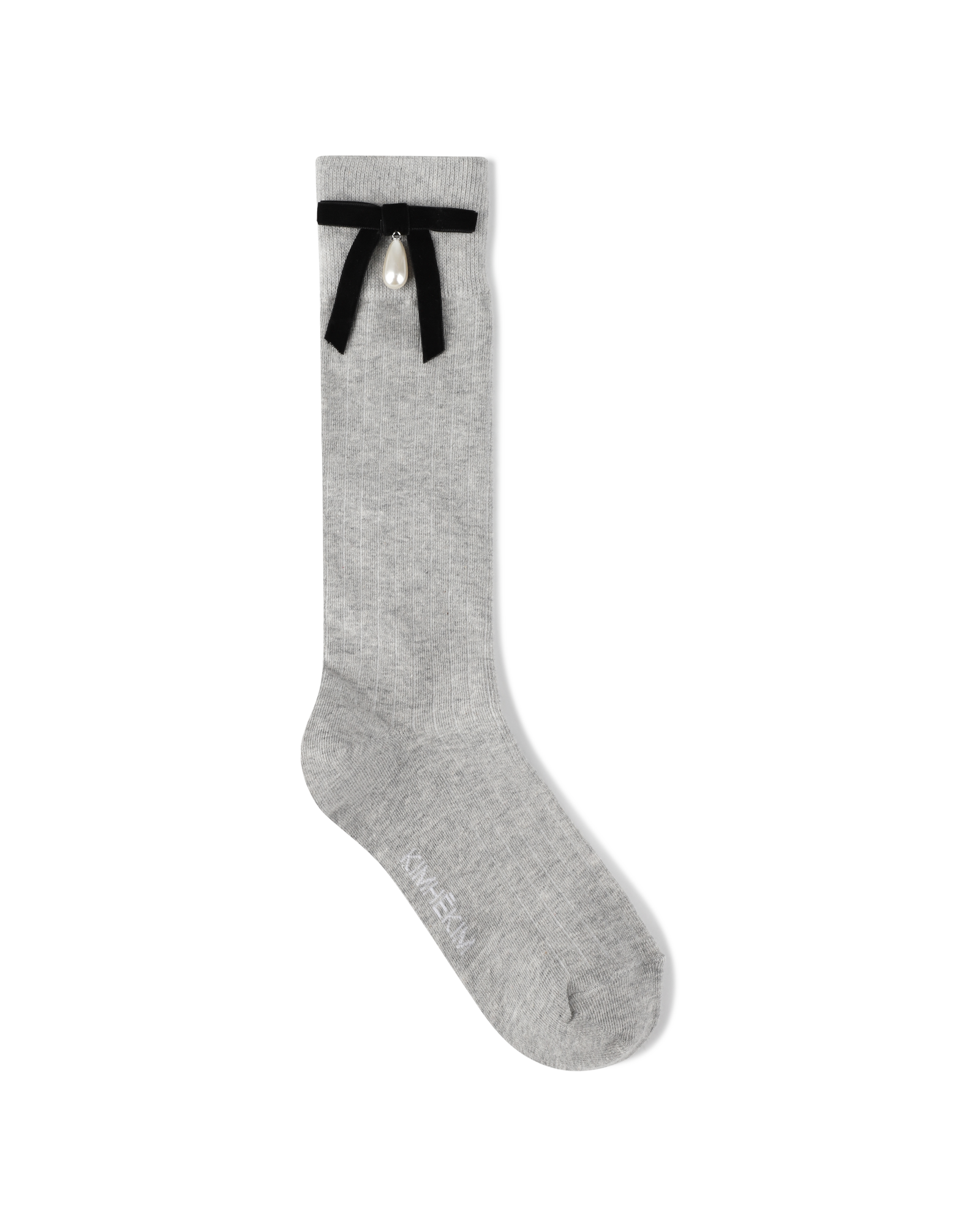Pearl Ribbon Detail Cotton -Blended Knee-High Socks (Grey)