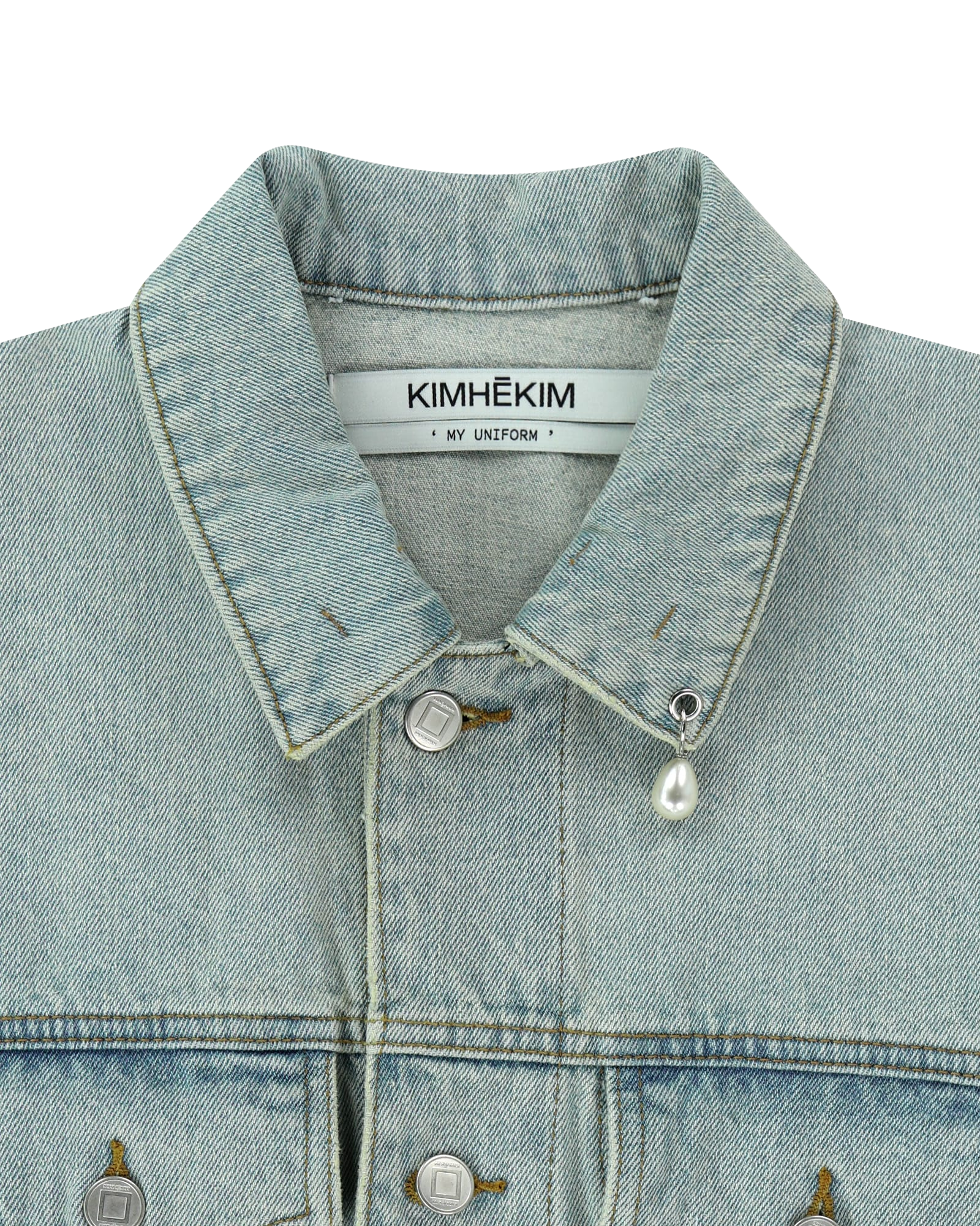 It features a silver-tone button engraved with the Kimhekim coin logo and functional belt loops for hanging items.