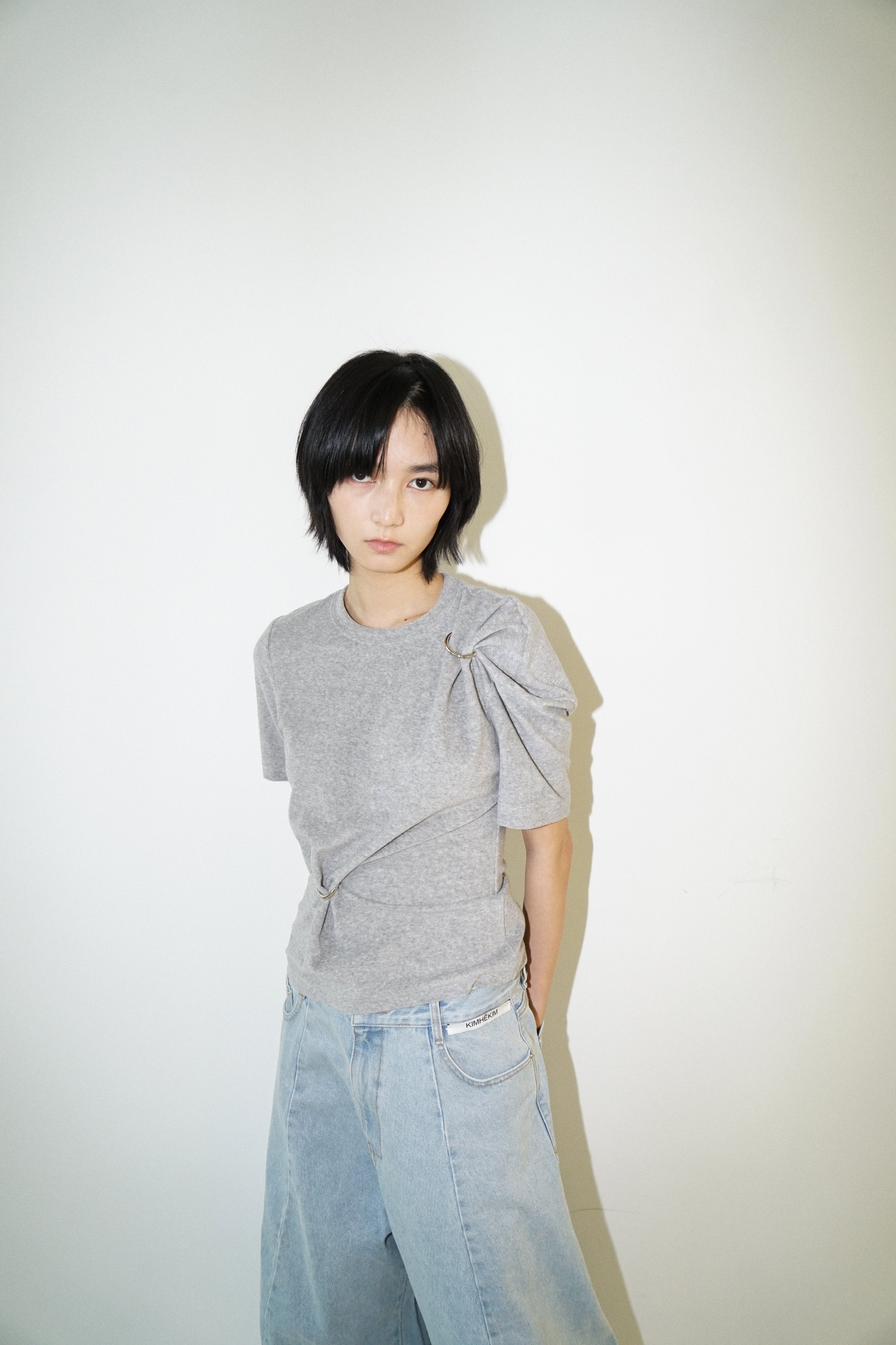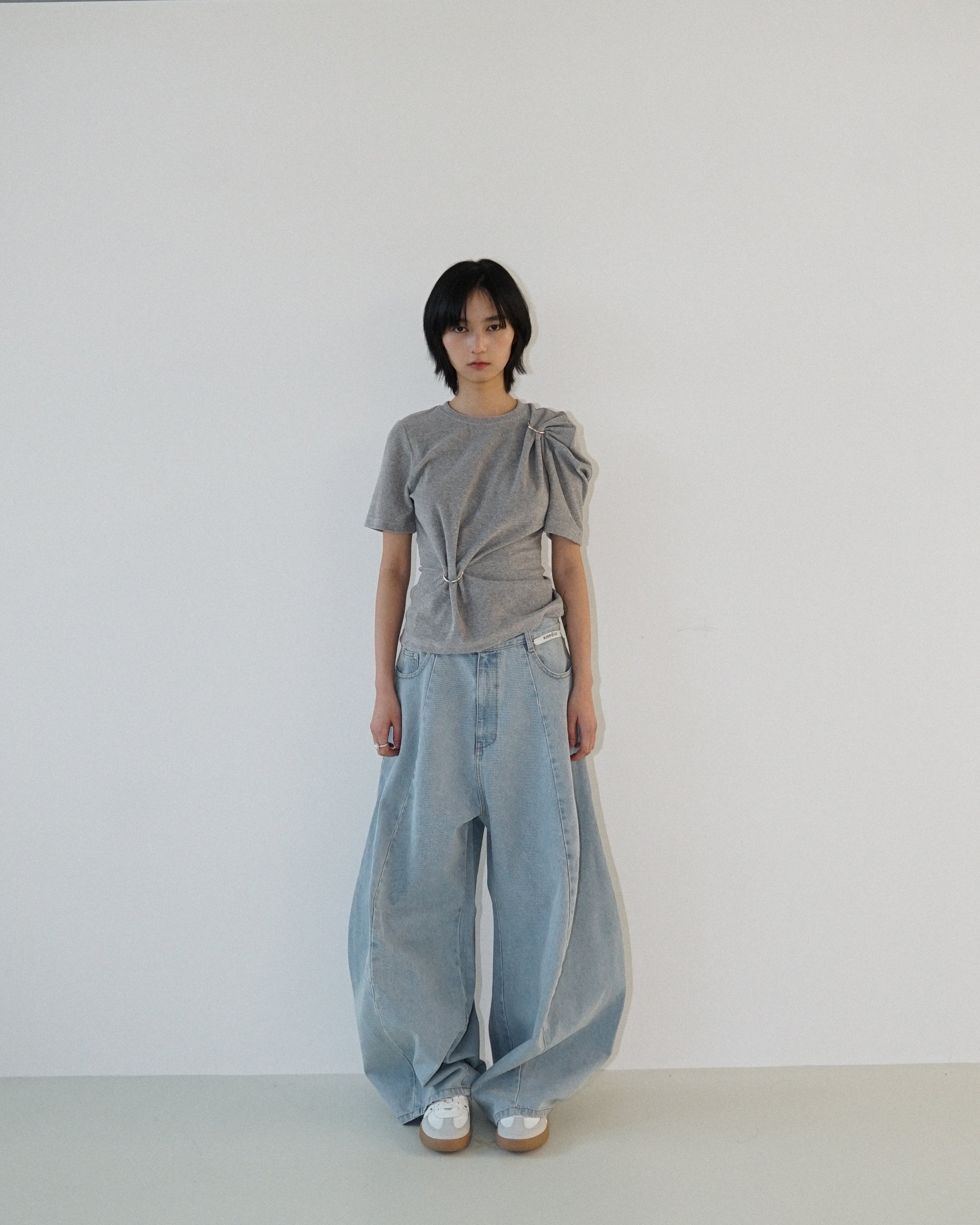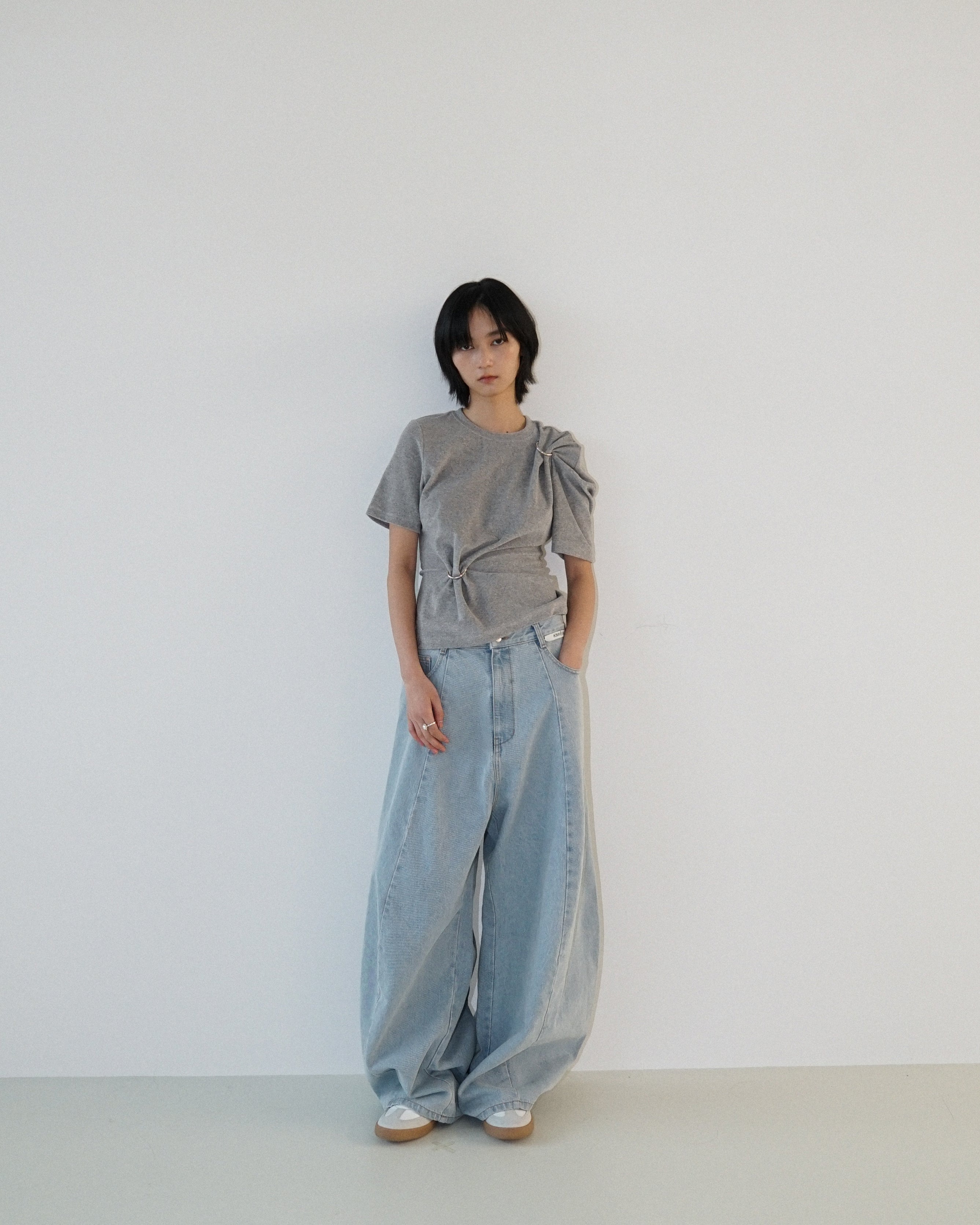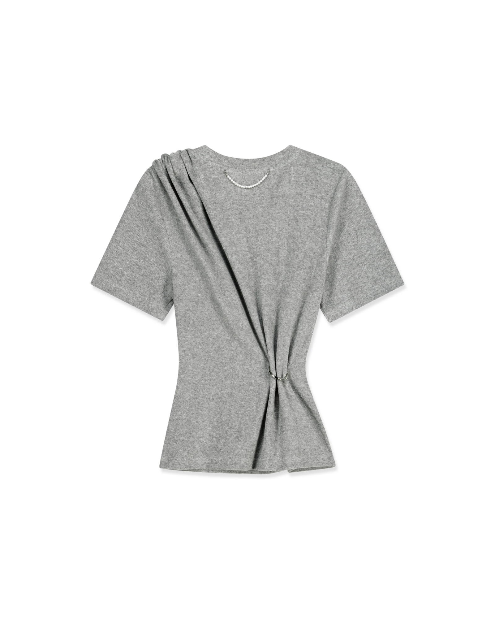 -Featuring an O-ring detail that creates a draped silhouette.